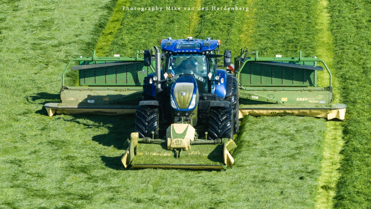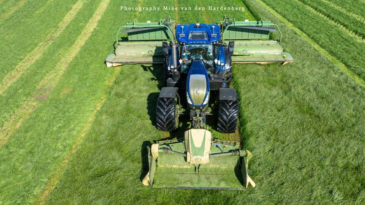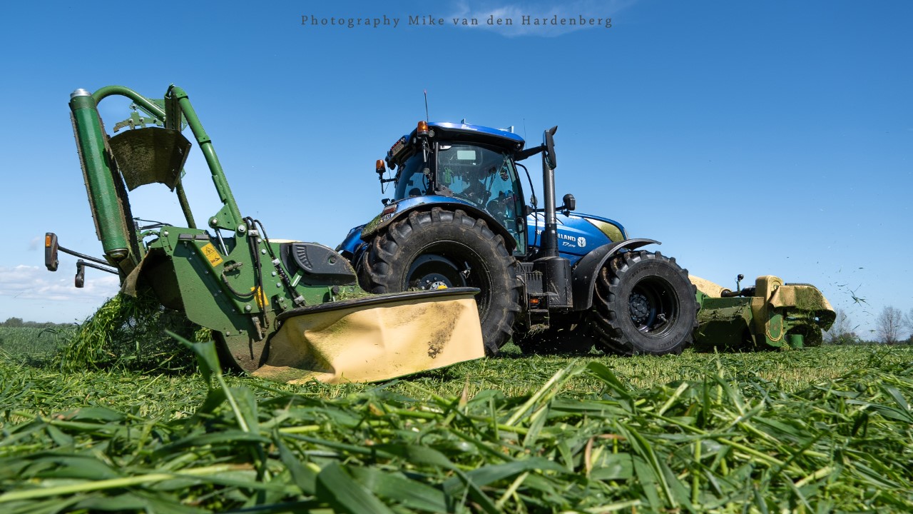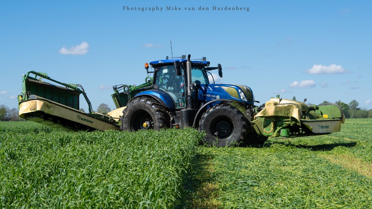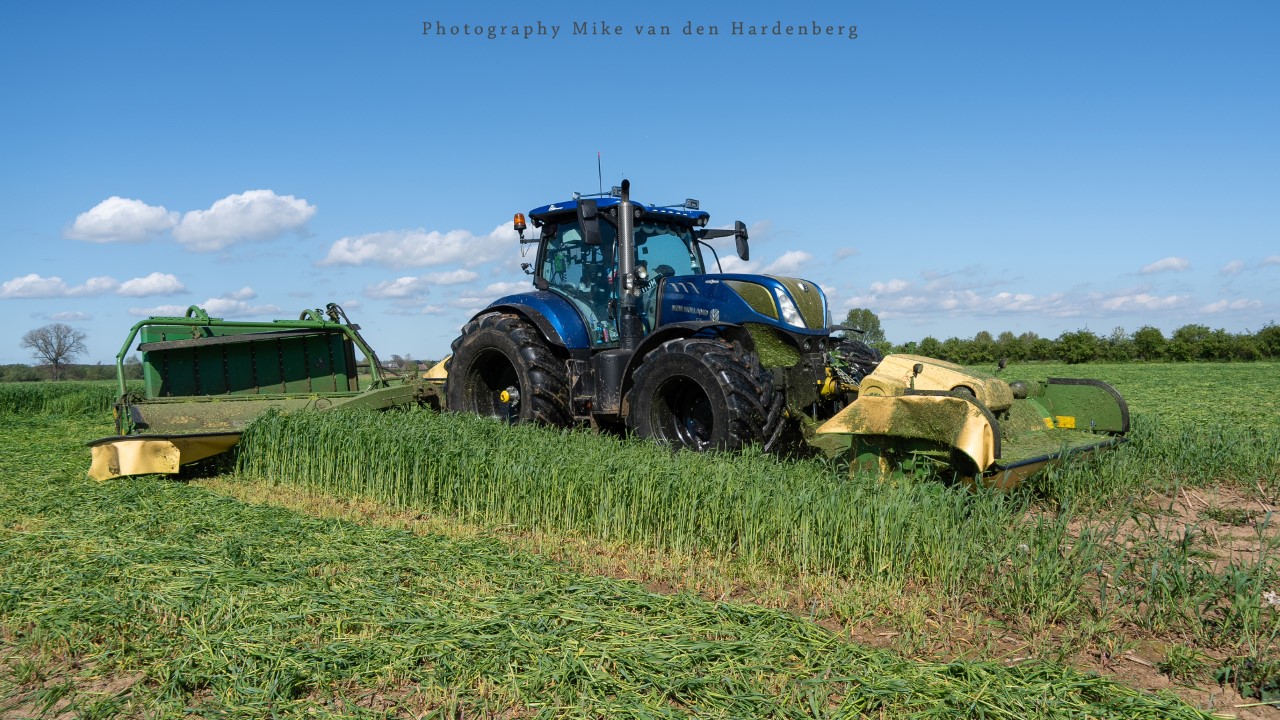 In deze reportage kijk je naar Loonbedrijf Nikkels B.V. uit Teuge die aan het gras/rogge maaien is met twee combinaties. Dit eerste snede wordt gemaaid door een New Holland T7.270 met Krone Triple maaiers en een Fendt 724 Vario met Kuhn Triple maaiers.