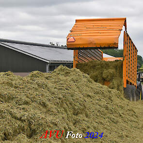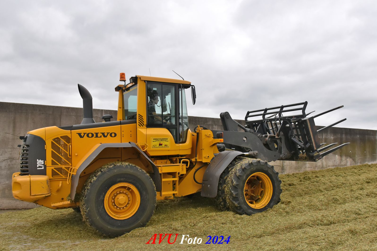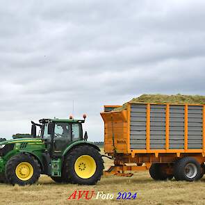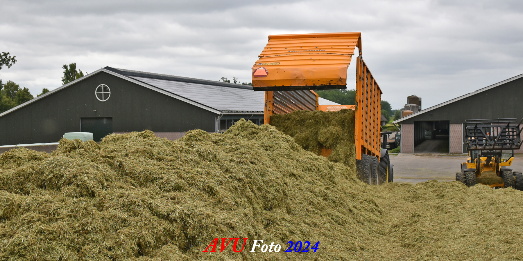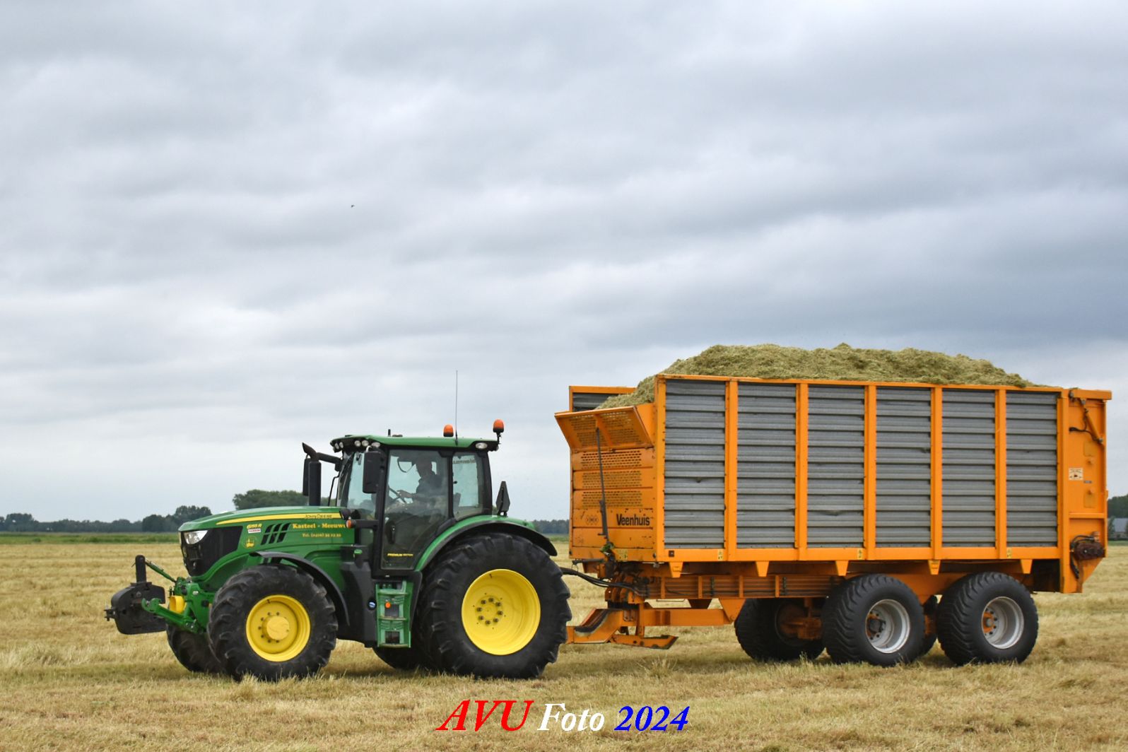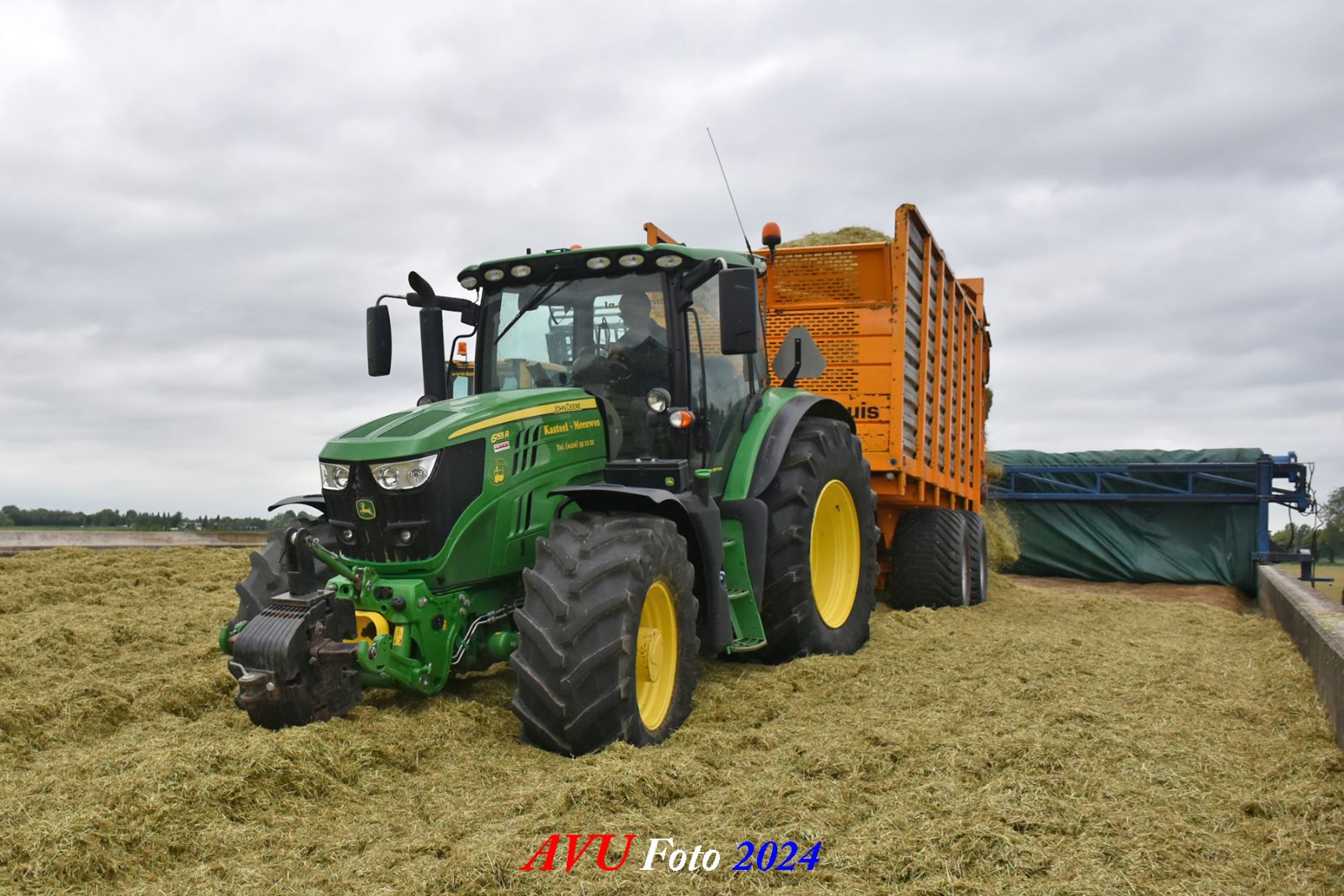 John Deere 6155 R met de Veenhuis silagewagen en de Volvo L70F met opklapbare zijstukken zorgden voor de vulling van de sleufsilo met een mooi speciaal voorzien afdeksysteem.