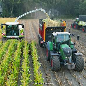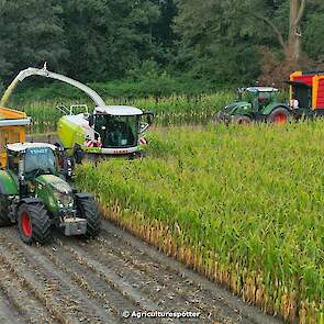 Loonbedrijf EJG Gerritsen BV uit Heelsum aan het maïs hakselen. Het transport werd gedaan met vier Fendt's met een Schuitemaker Rapide 660-opraapwagen, Kaweco Raduim 50-silagewagens en een VGM-kipper.
