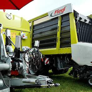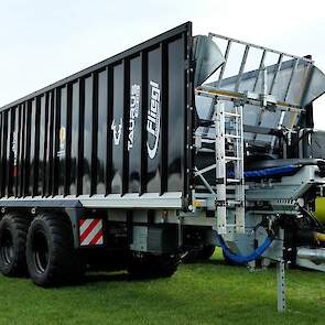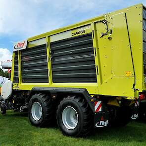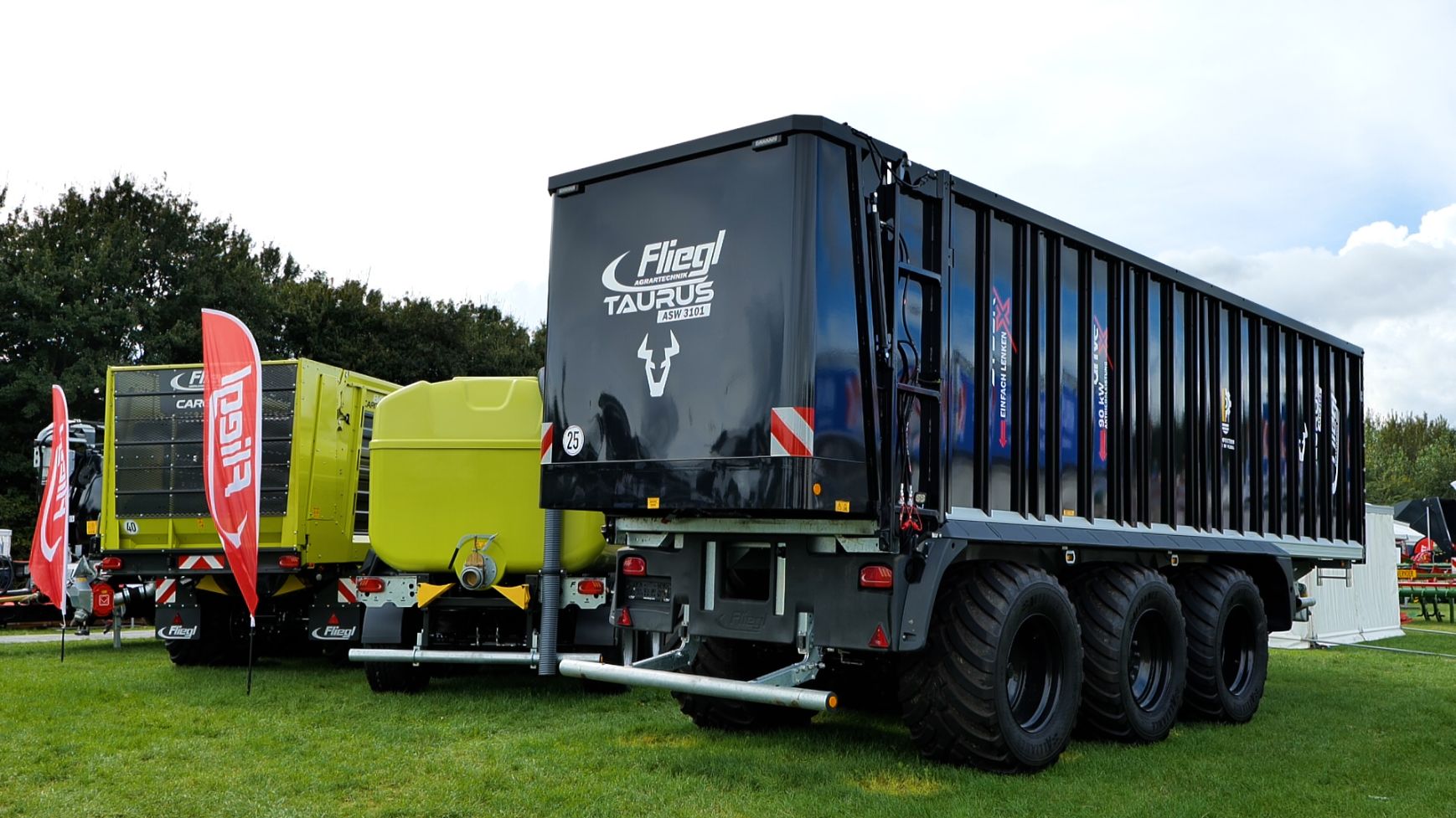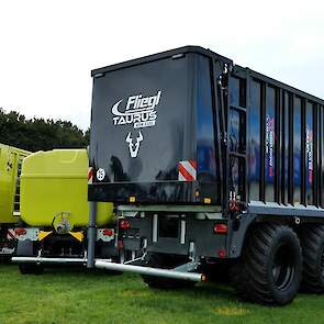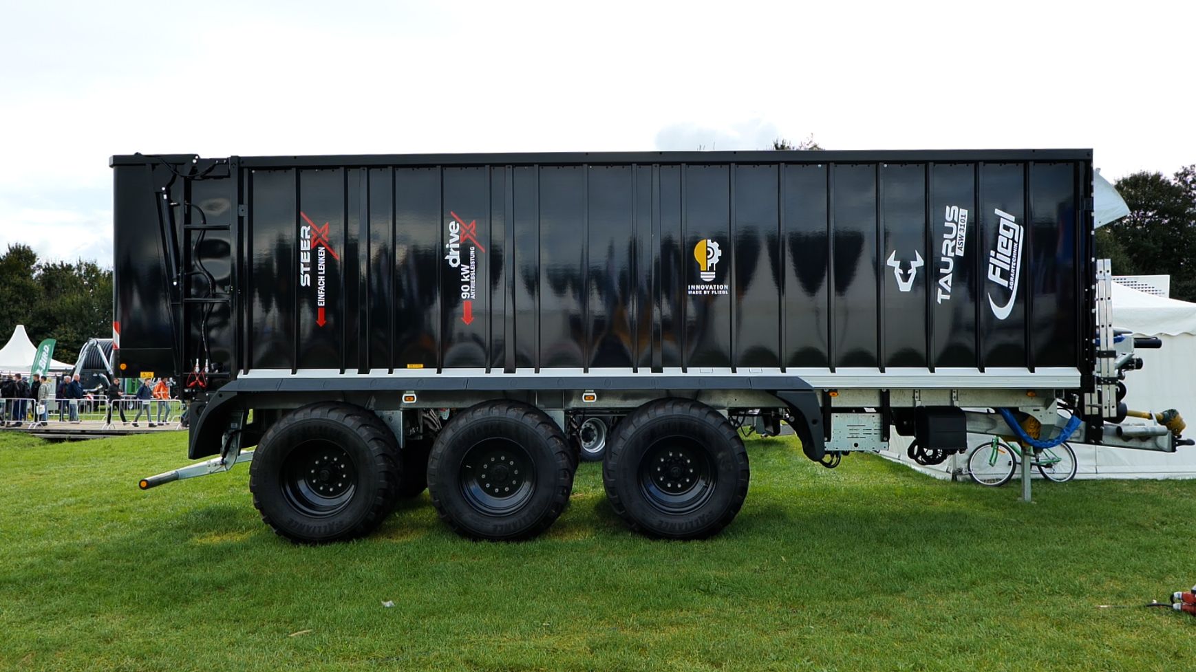 - De Fliegl-schuifwagen ASW 3101 met een inhoud van 55 m³ en uitgerust met de nieuwe elektronische sturing X-Steer en de hydraulisch aangedreven as, waarbij de trekker wordt geholpen van 0 tot 15 km/ h.