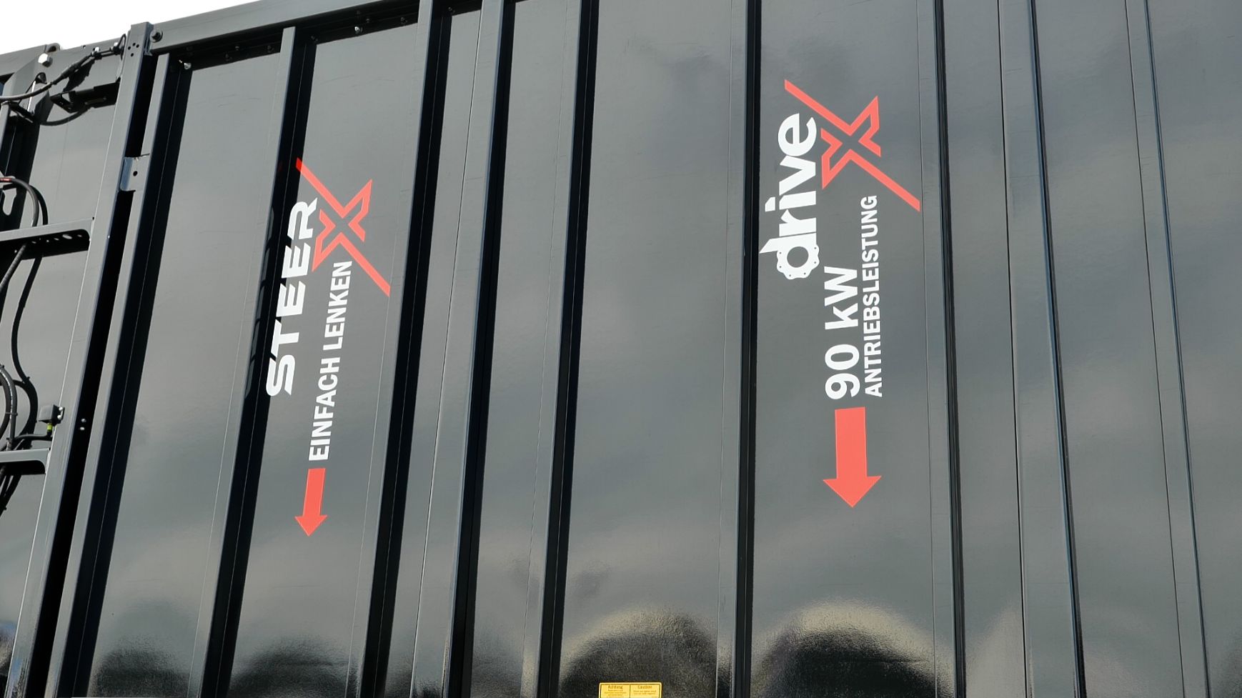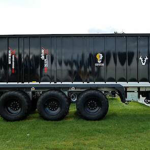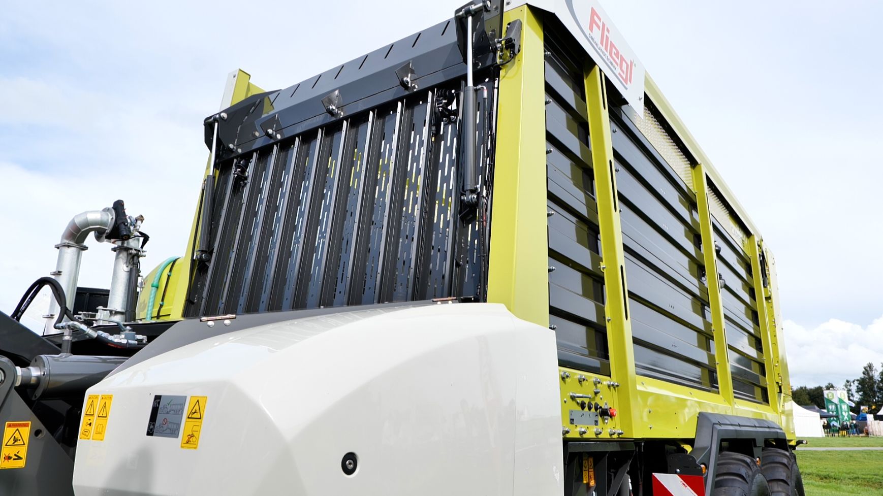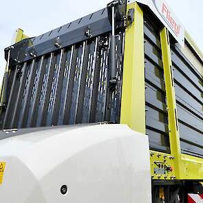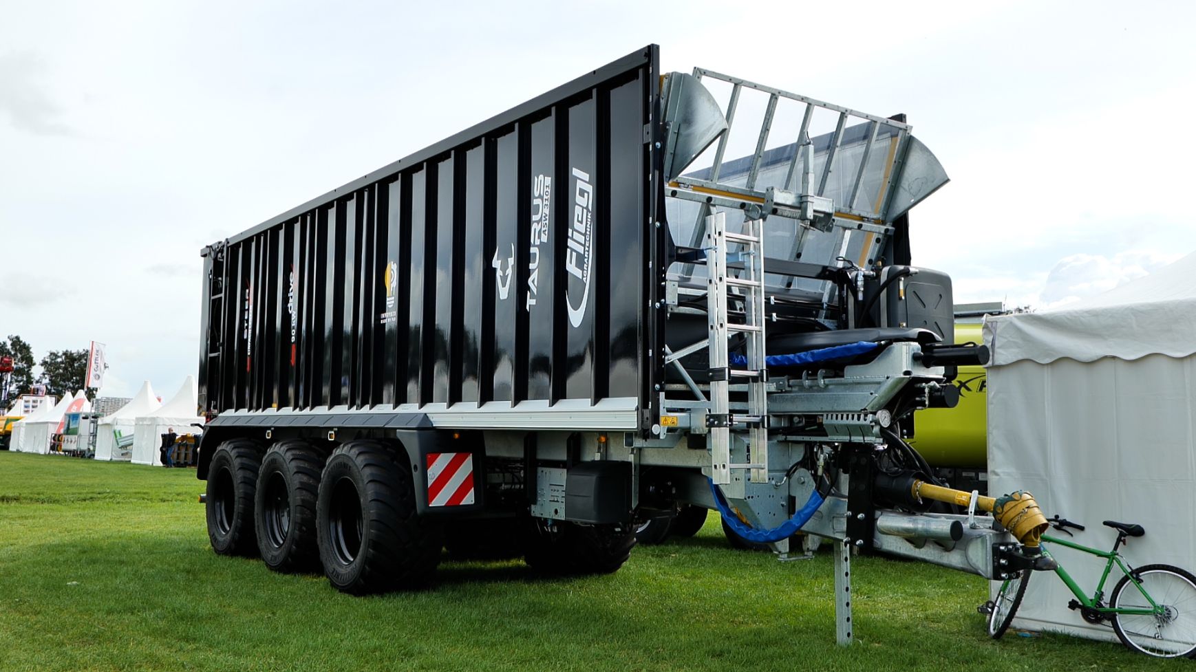 - De Fliegl-schuifwagen ASW 3101 met een inhoud van 55 m³ en uitgerust met de nieuwe elektronische sturing X-Steer en de hydraulisch aangedreven as, waarbij de trekker wordt geholpen van 0 tot 15 km/ h.