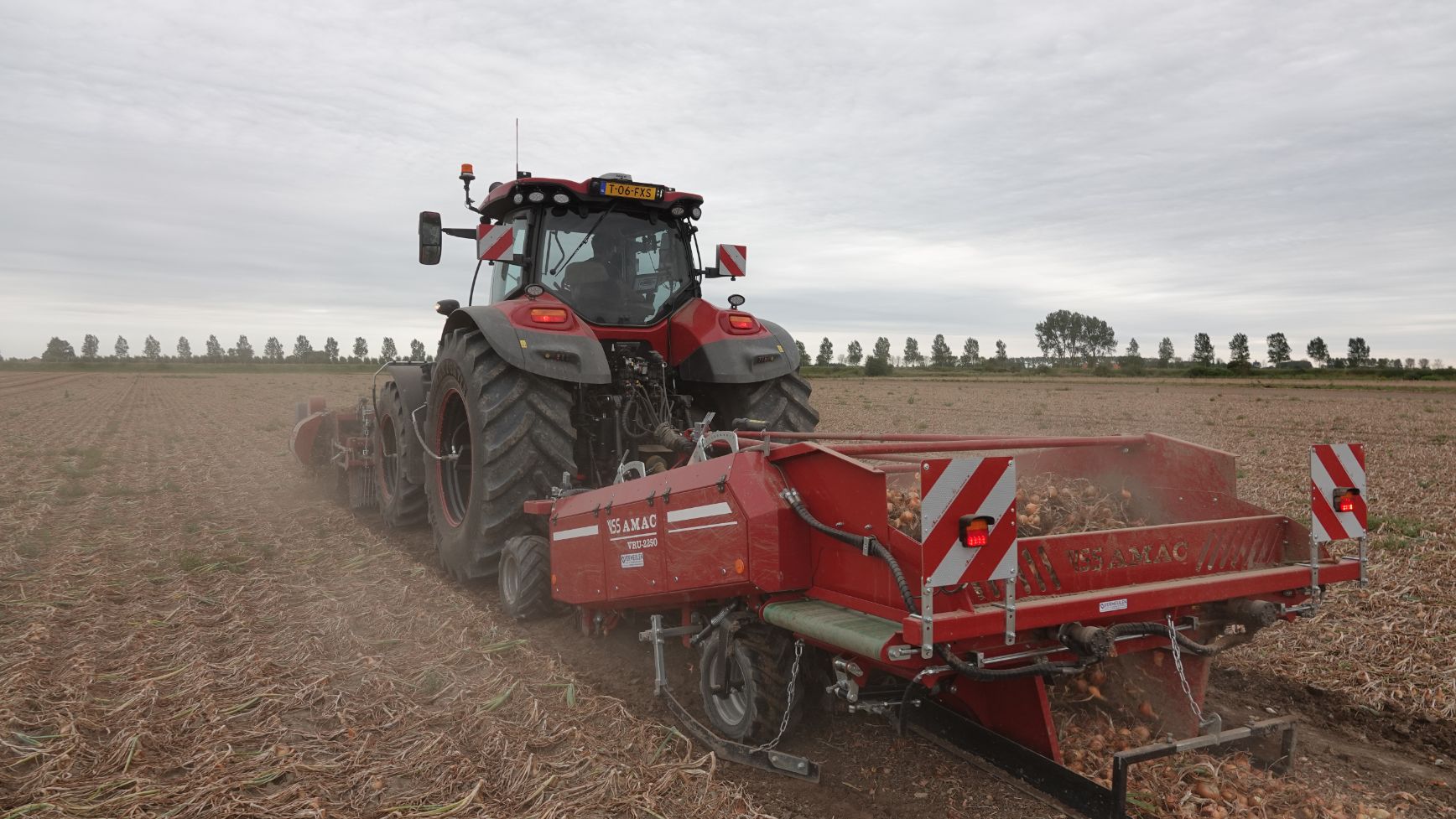 Uien rooien met de Case Optum 340 AFS met een drie meter brede VSS Amac-klapper voorop (FRU 3000) en een VSS Amac VRU 2250-rooimachine achterop.