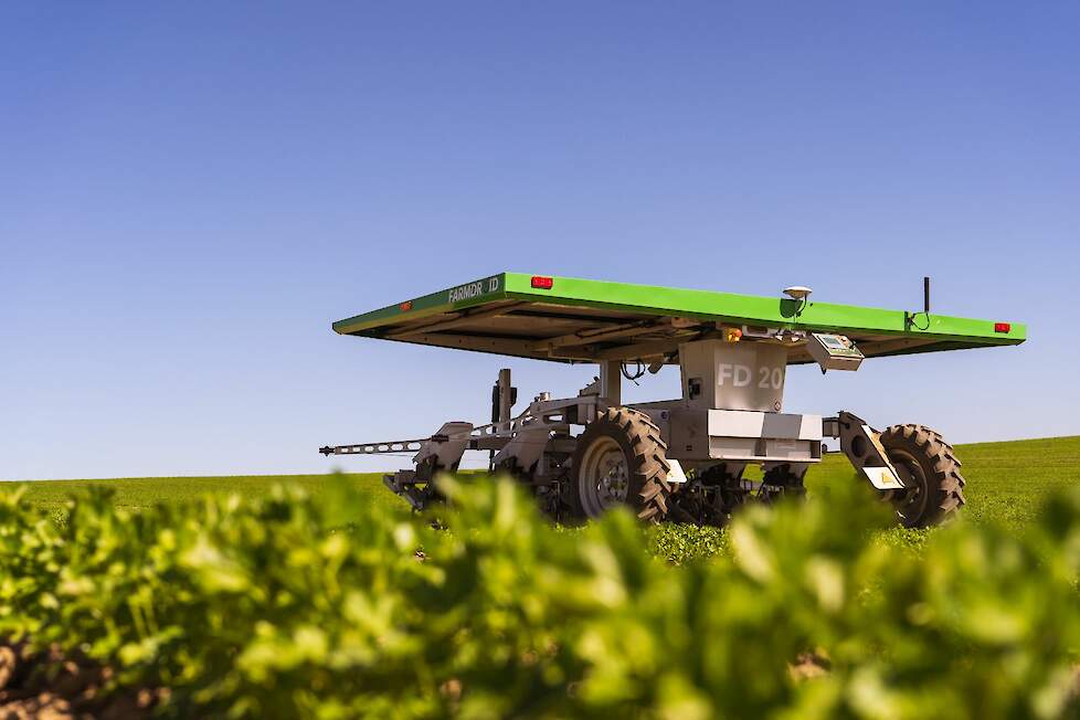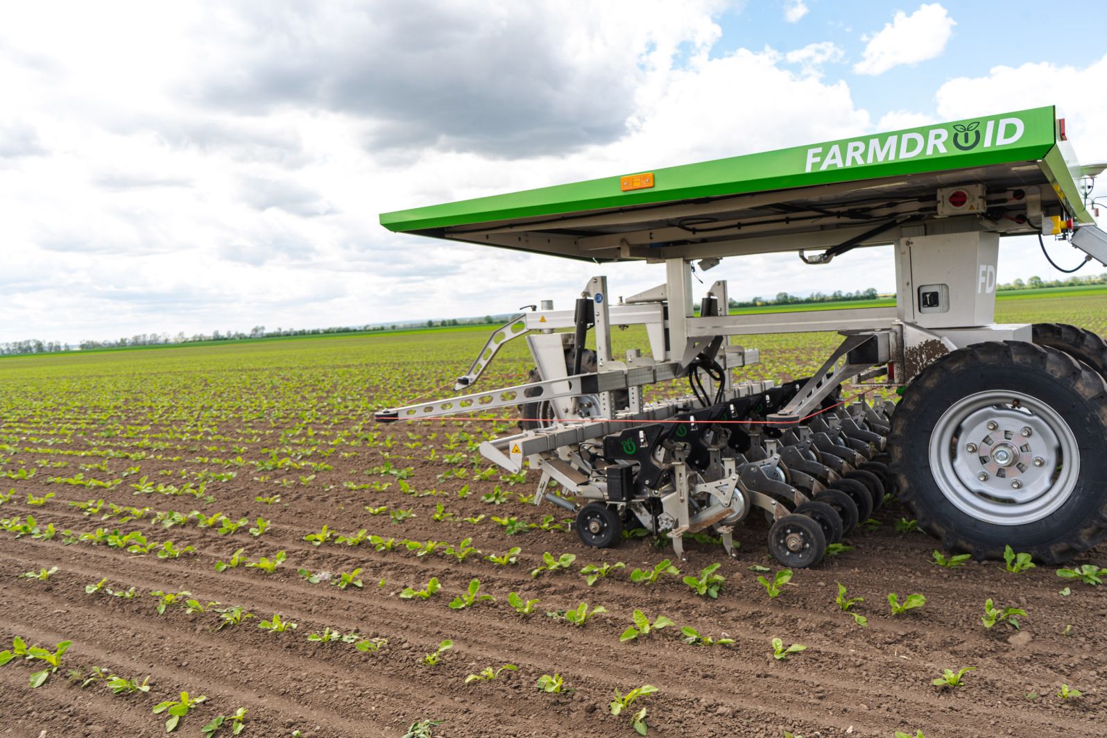 De FarmDroid FD20 is een elektrisch aangedreven zaai- en schoffelrobot voor gewassen als suikerbieten, uien, spinazie, cichorei, boerenkool en koolzaad. Vier grote zonnepanelen wekken de benodigde energie op om 24/7 te kunnen werken. Bijzonder is dat de zaai-elementen 180 graden gedraaid kunnen worden, waarbij de schoffelelementen tevoorschijn komen. De robot kan dus direct na het zaaien beginnen met schoffelen, nog voordat de plantjes zijn opgekomen. De FarmDroid weet overigens op de millimeter nauwkeurig waar het zaadje ligt en kan schoffelen tussen de rijen en ook in de rijen. De machine werkt volledig autonoom, is licht en geluidloos, verbruikt geen brandstof en stoot geen CO2 uit.