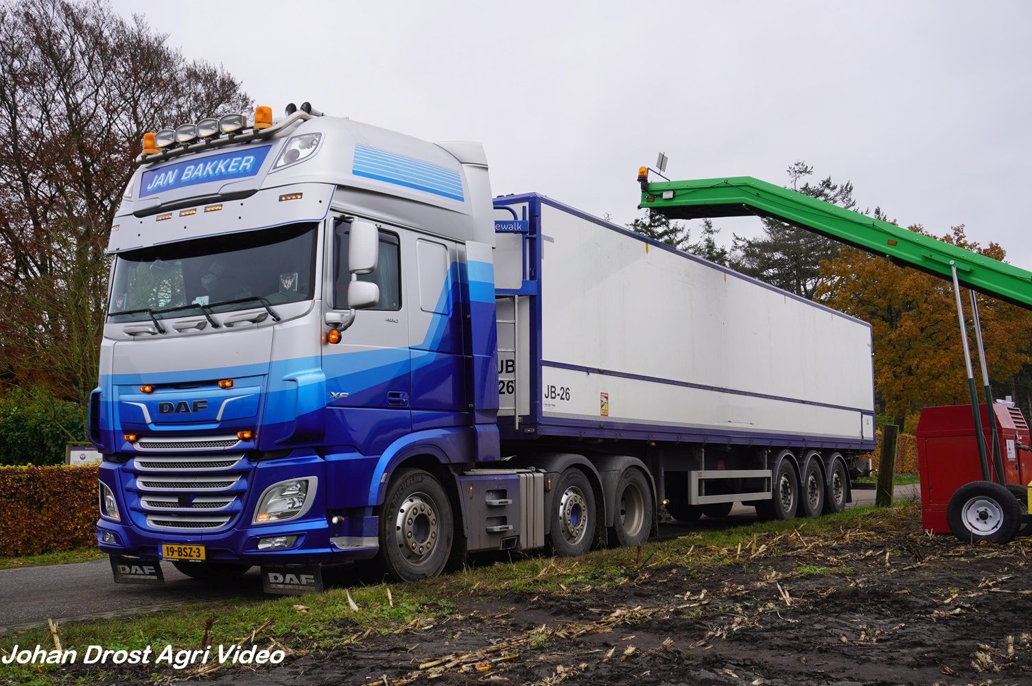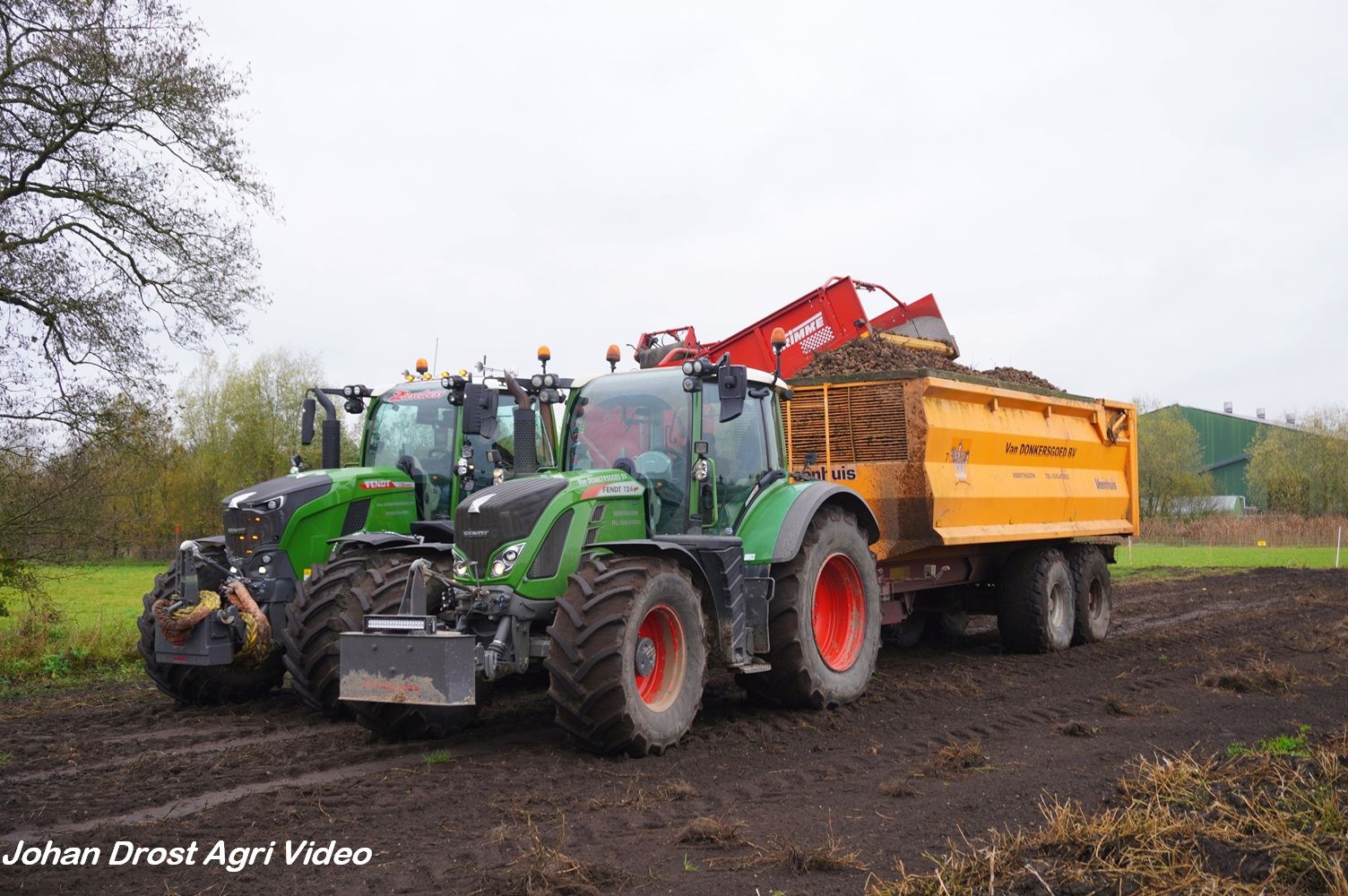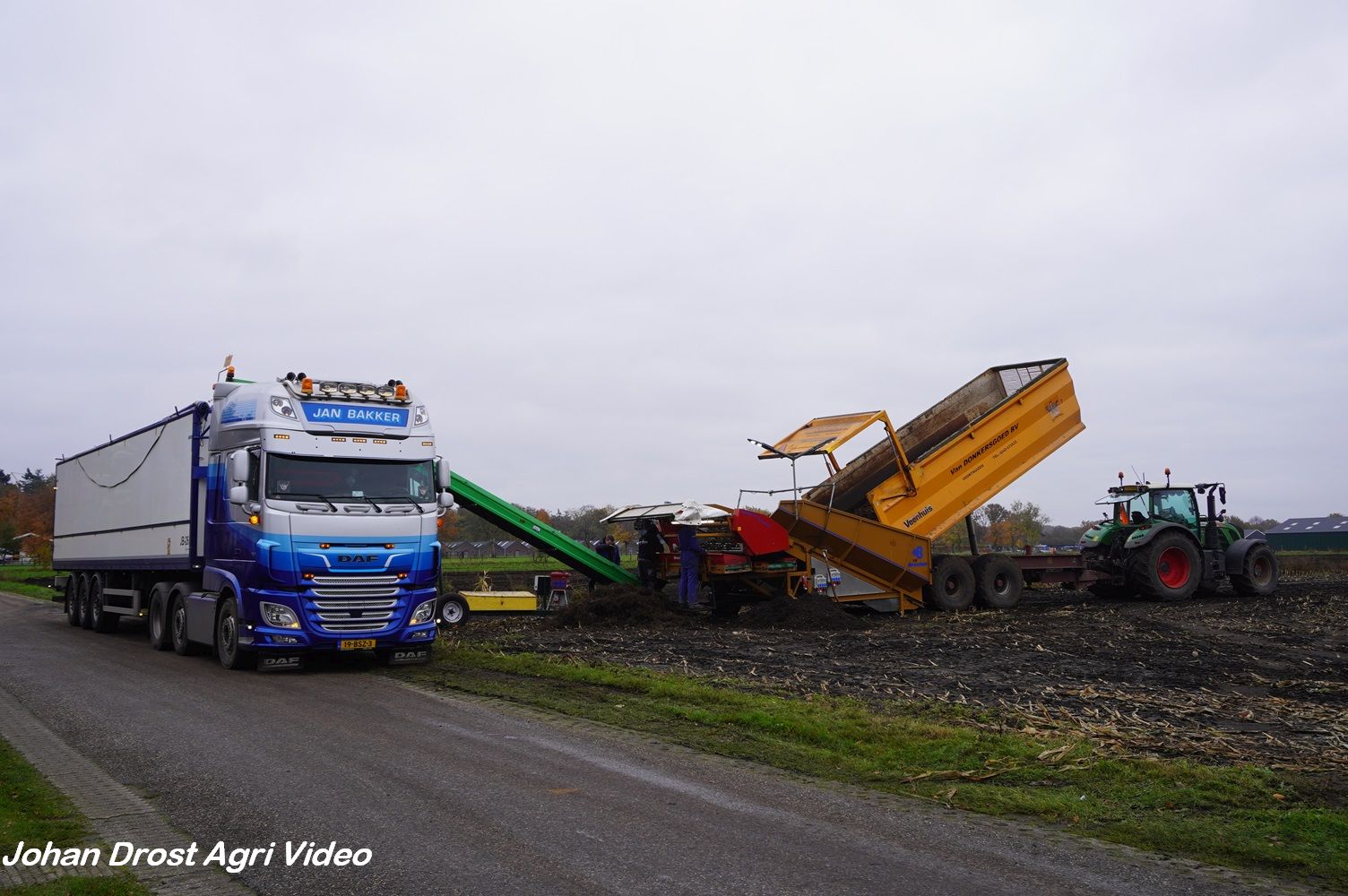 Loonbedrijf Van Donkersgoed BV uit Voorthuizen aan het aardappels rooien bij De Bruin in Uddel met een Fendt 728 Vario met Grimme SE 150-60 en twee maal Fendt 724 Vario met Veenhuis. Voor het transport een DAF XF van Jan Bakker.
