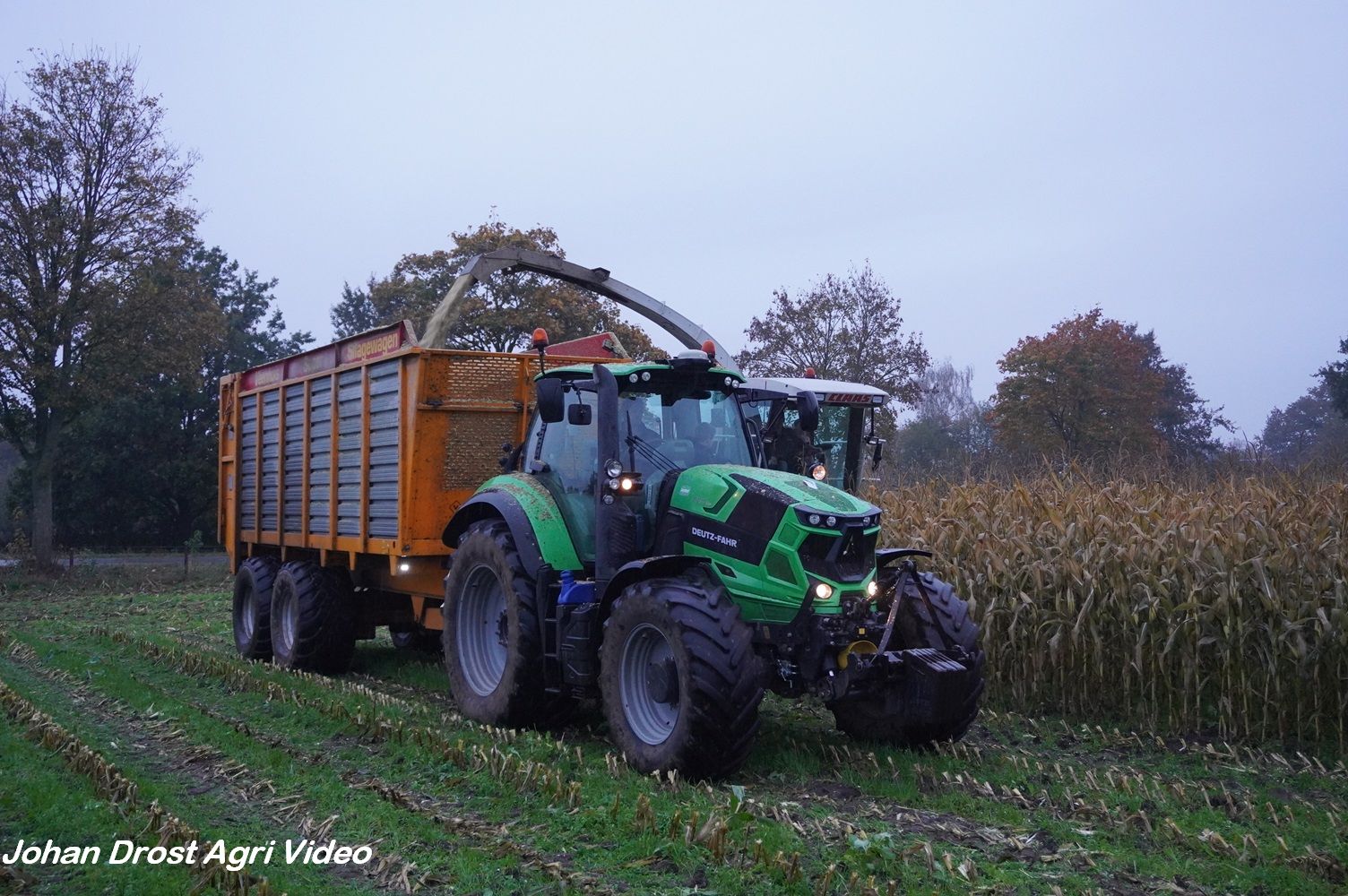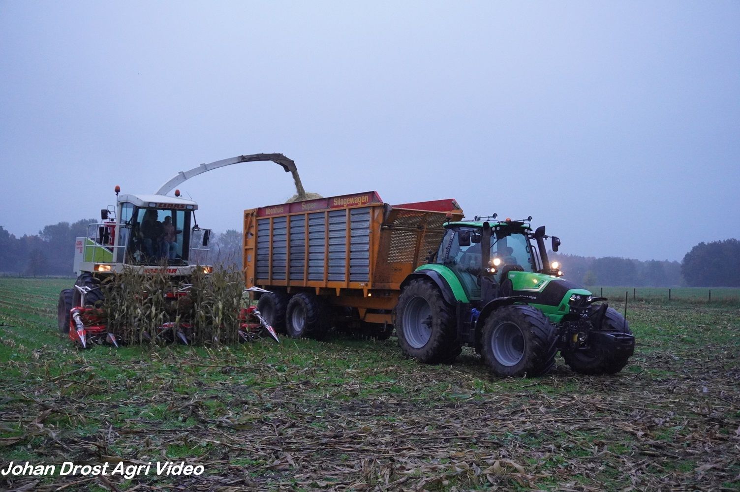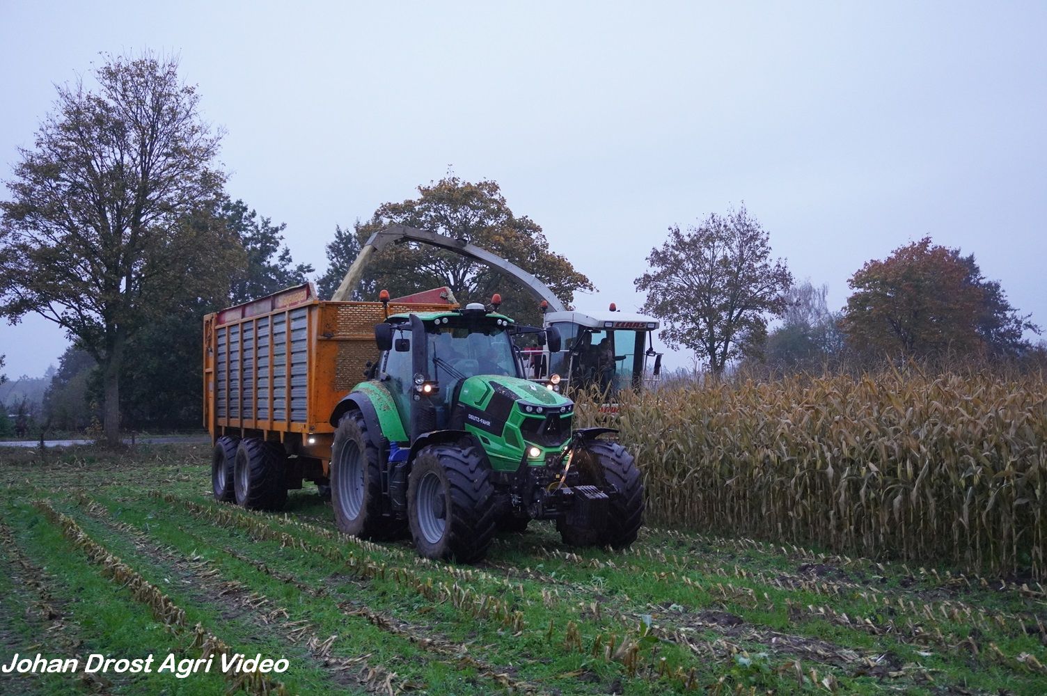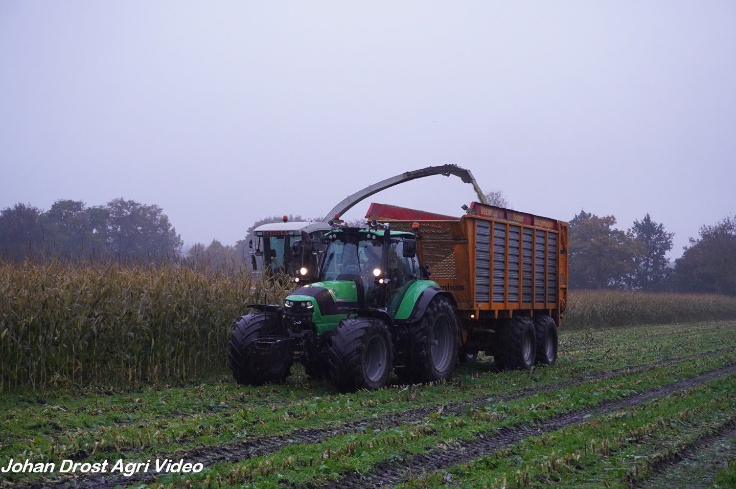 Agrarische Dienstverlening ten Voorde uit Beemte-Broekland aan het maïs hakselen in de regen met een Claas Jaguar 880, Deutz-Fahr Agrotron 6215 TTV en Deutz-Fahr Agrotron 6190 TTV met Veenhuis Super Silagewagen.