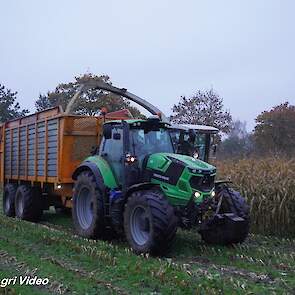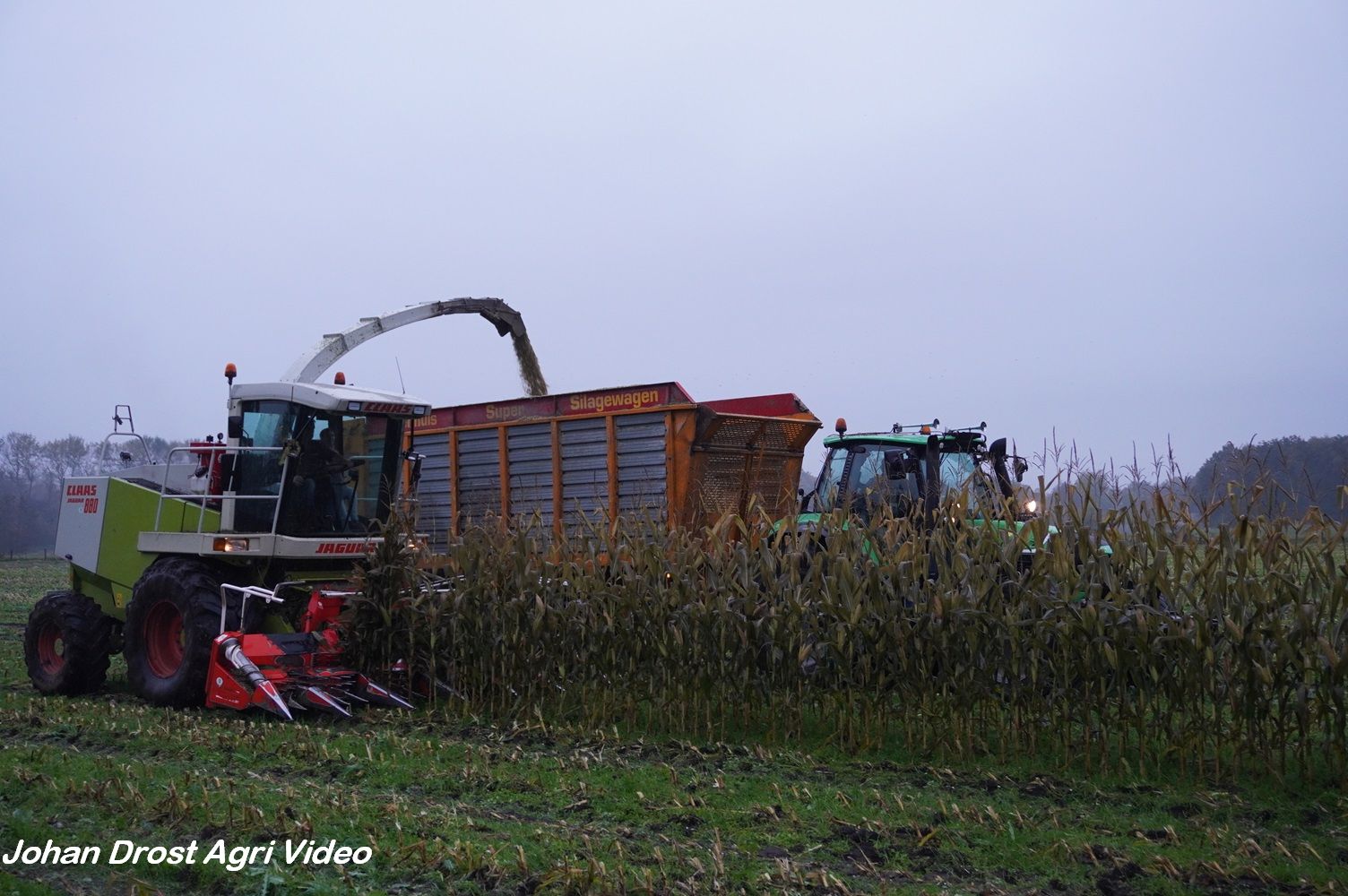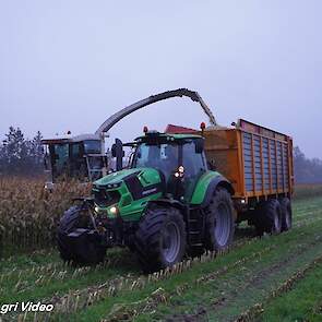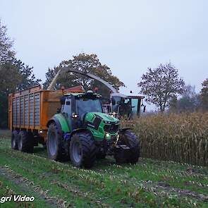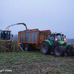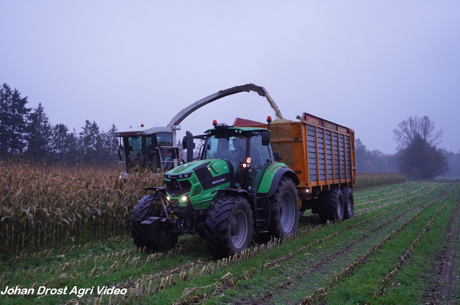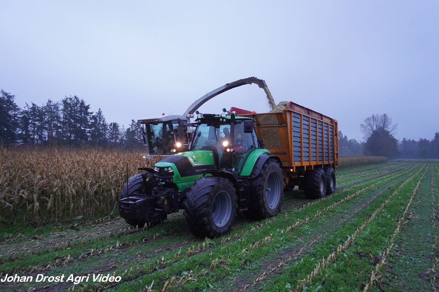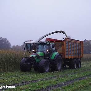 Agrarische Dienstverlening ten Voorde uit Beemte-Broekland aan het maïs hakselen in de regen met een Claas Jaguar 880, Deutz-Fahr Agrotron 6215 TTV en Deutz-Fahr Agrotron 6190 TTV met Veenhuis Super Silagewagen.