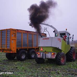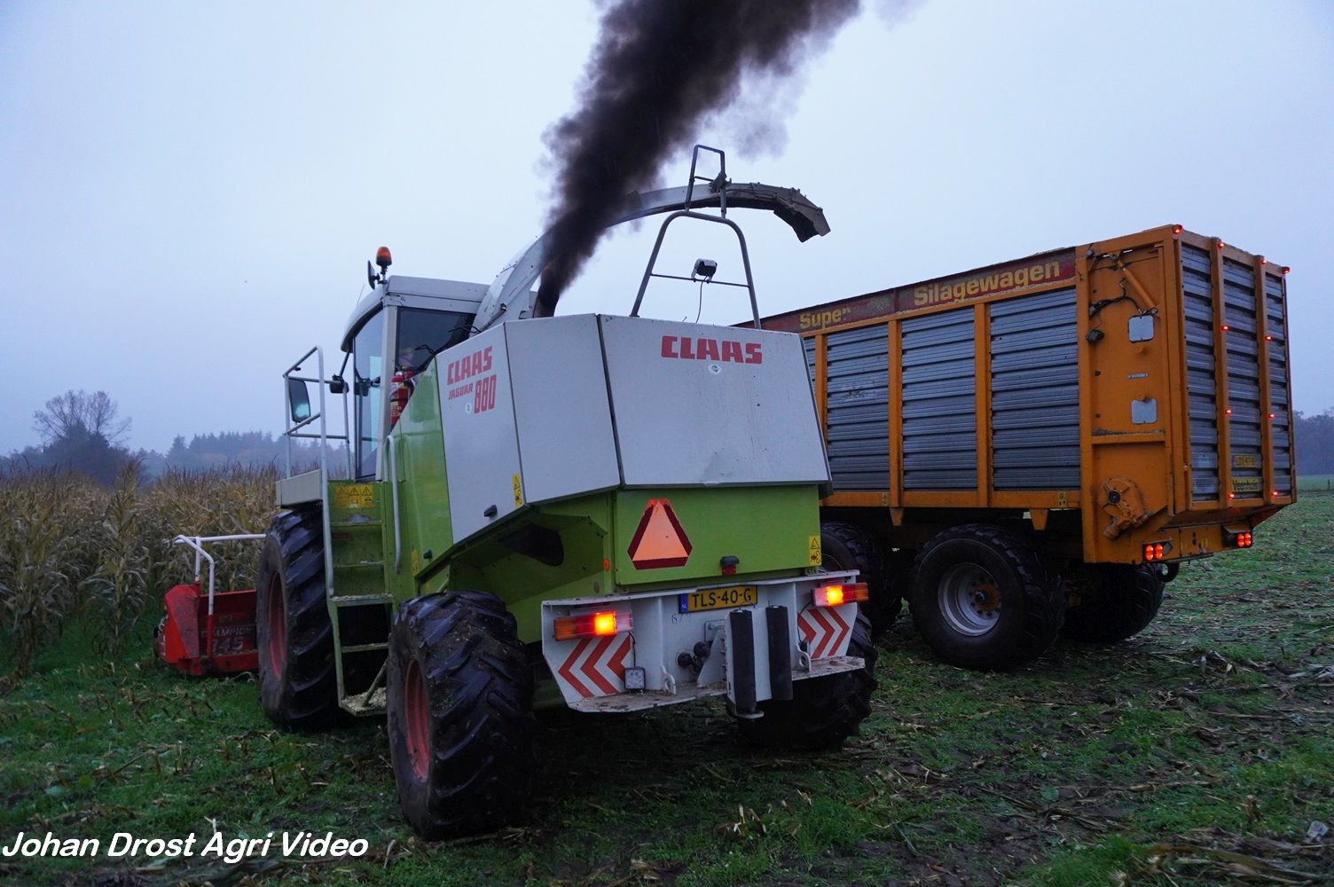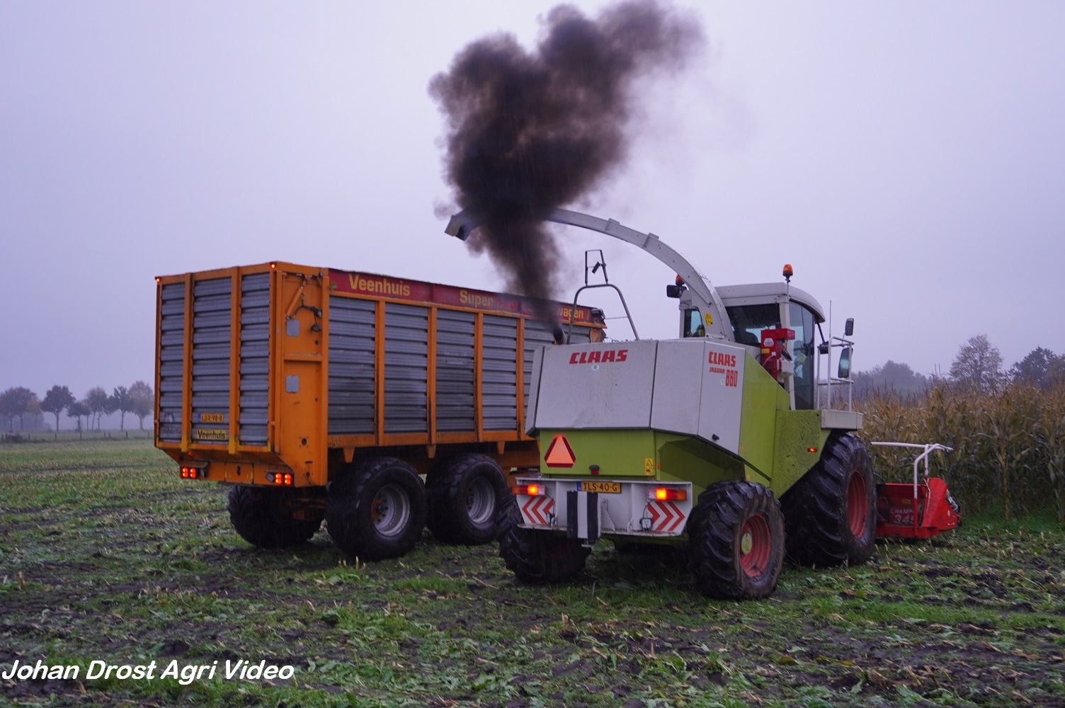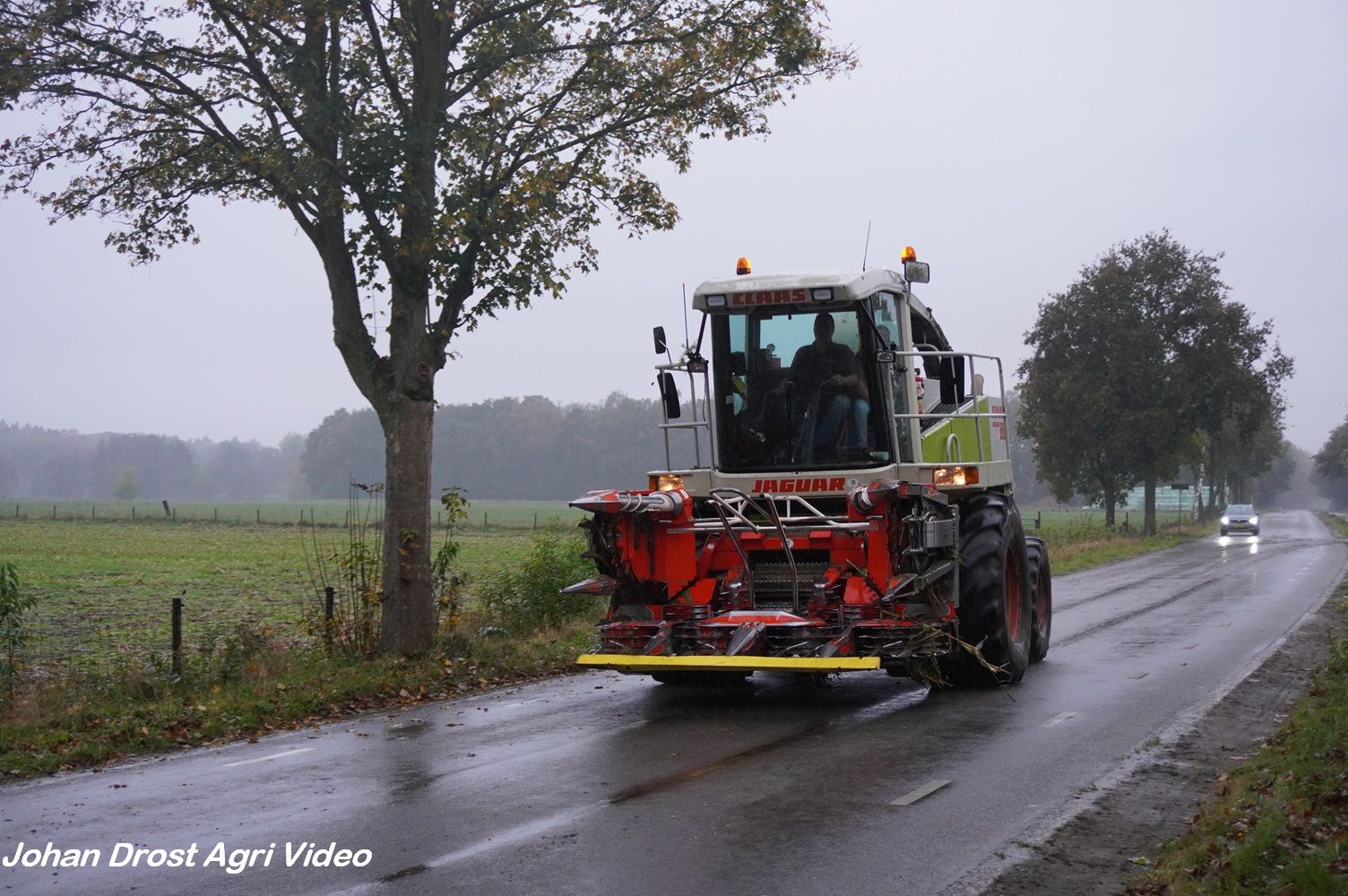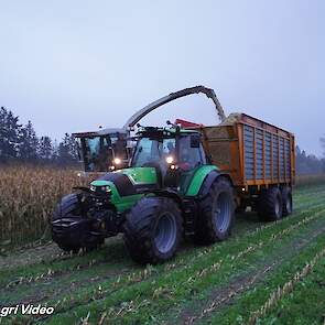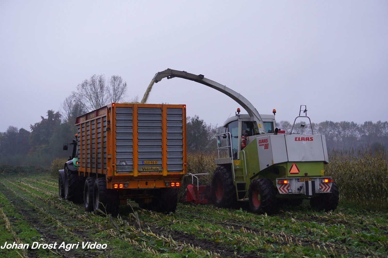 Agrarische Dienstverlening ten Voorde uit Beemte-Broekland aan het maïs hakselen in de regen met een Claas Jaguar 880, Deutz-Fahr Agrotron 6215 TTV en Deutz-Fahr Agrotron 6190 TTV met Veenhuis Super Silagewagen.