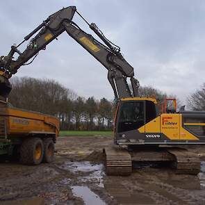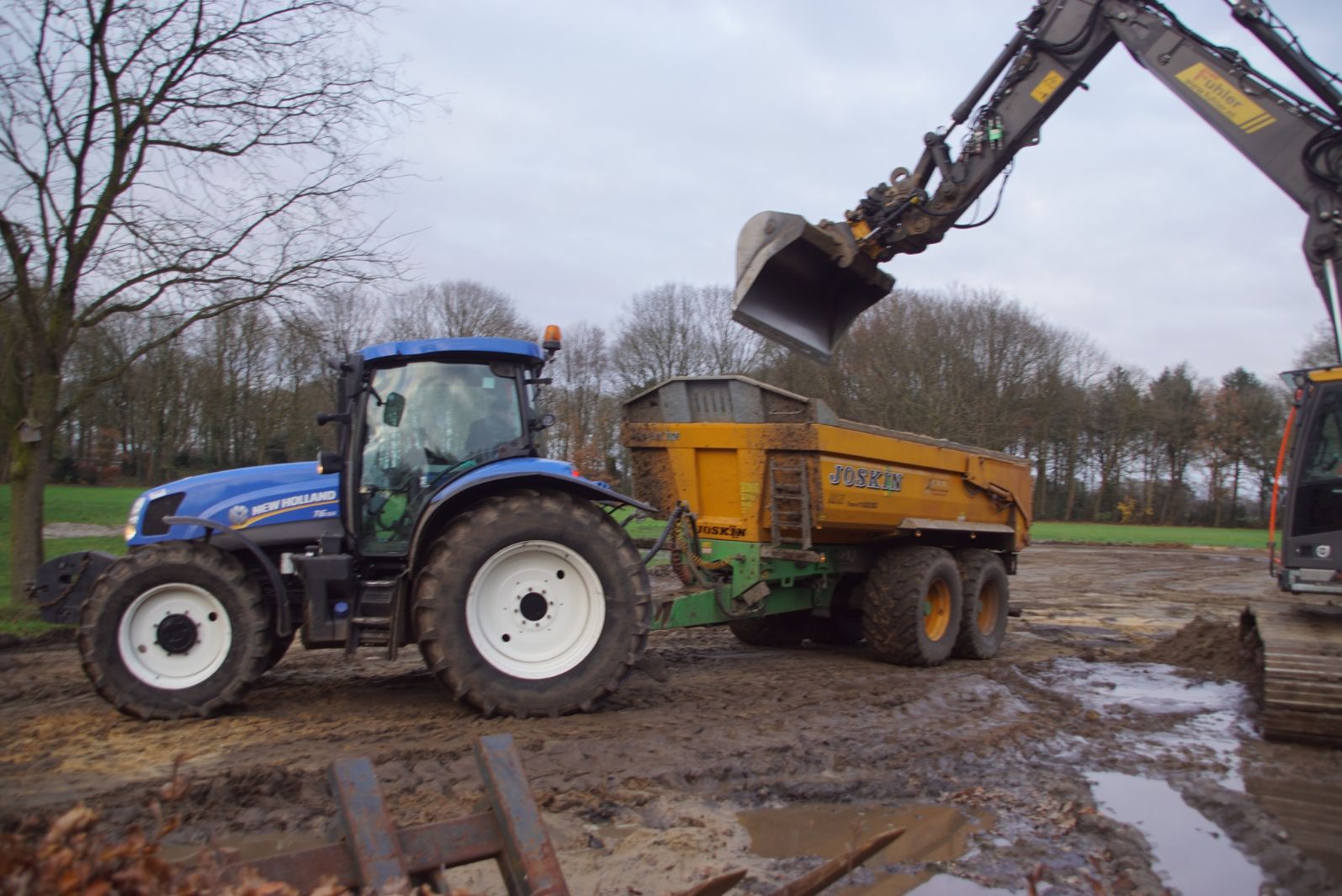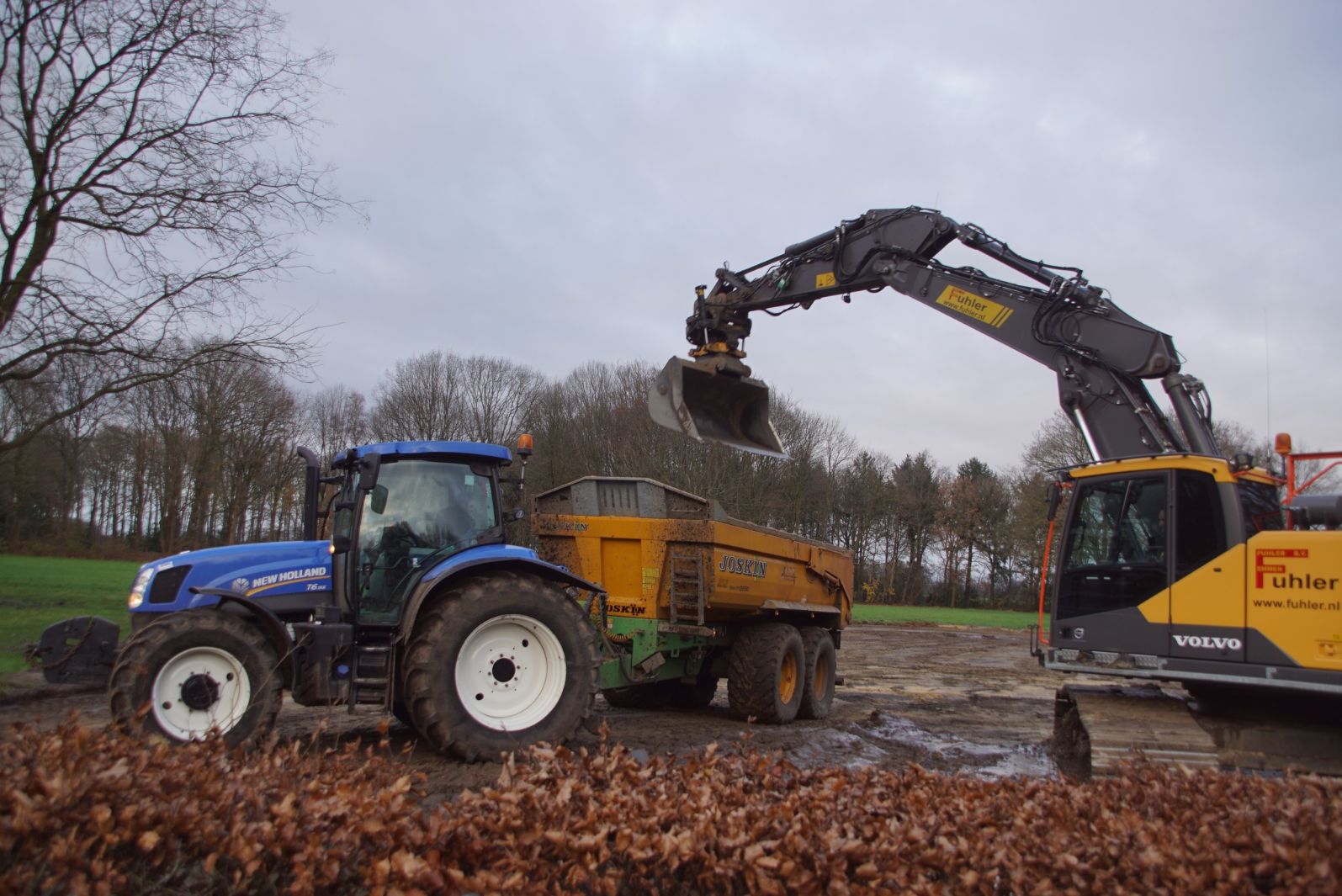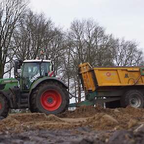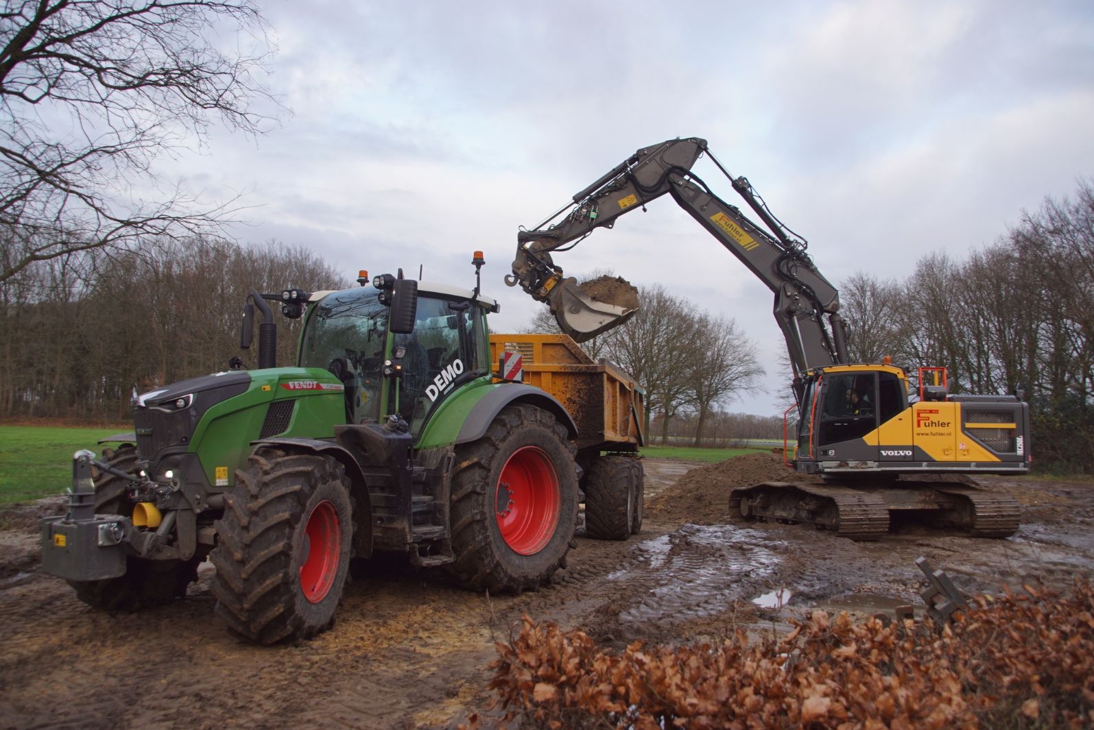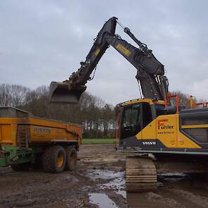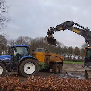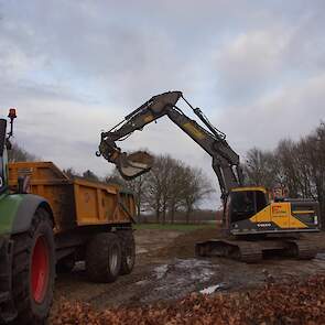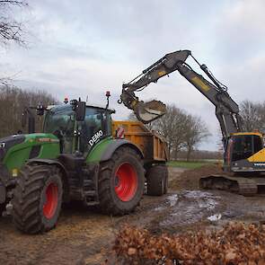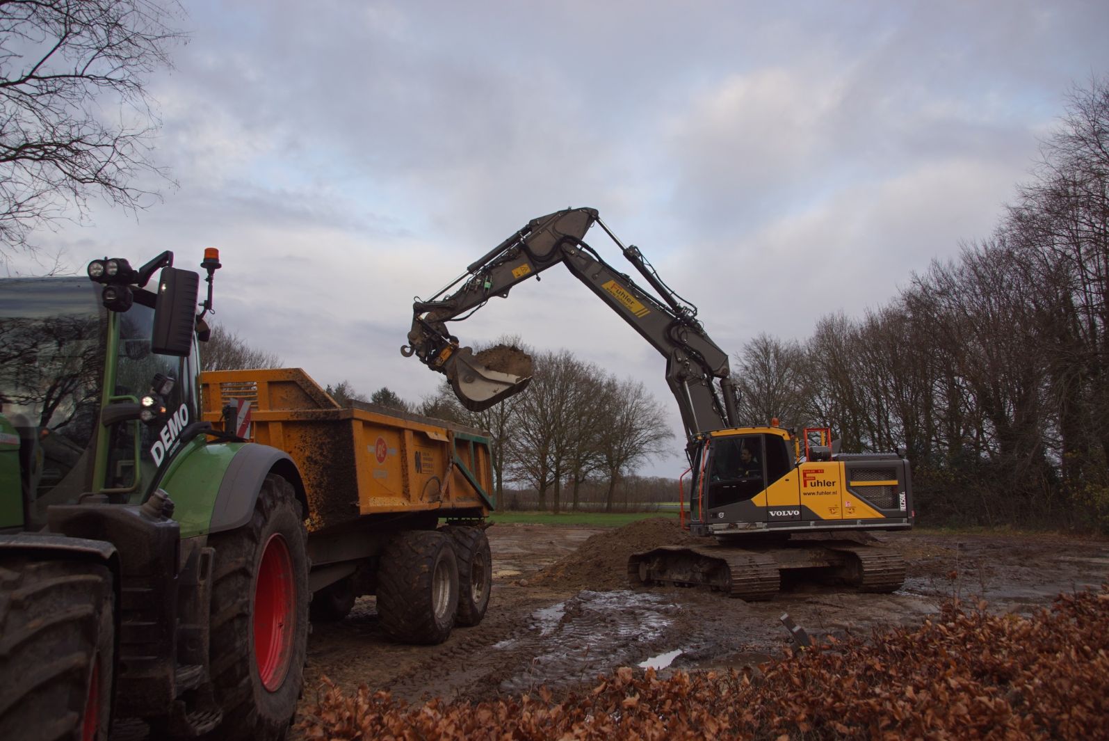 Een demo-Fendt 728 Vario, een New Holland en een Massey Ferguson verzorgen het transport van het zand dat wordt opgeladen door de Volvo-kraan.