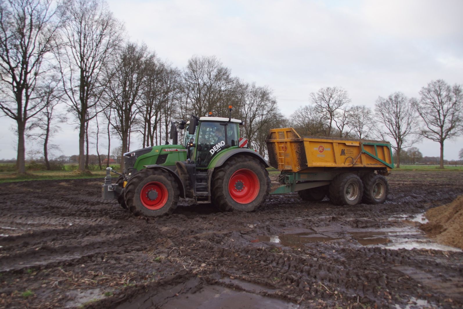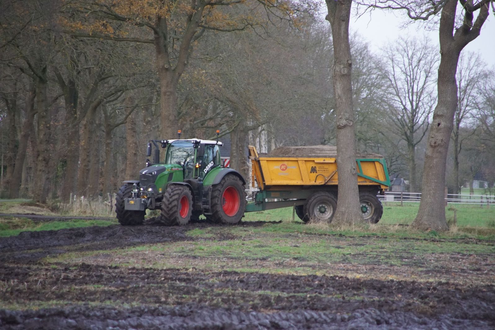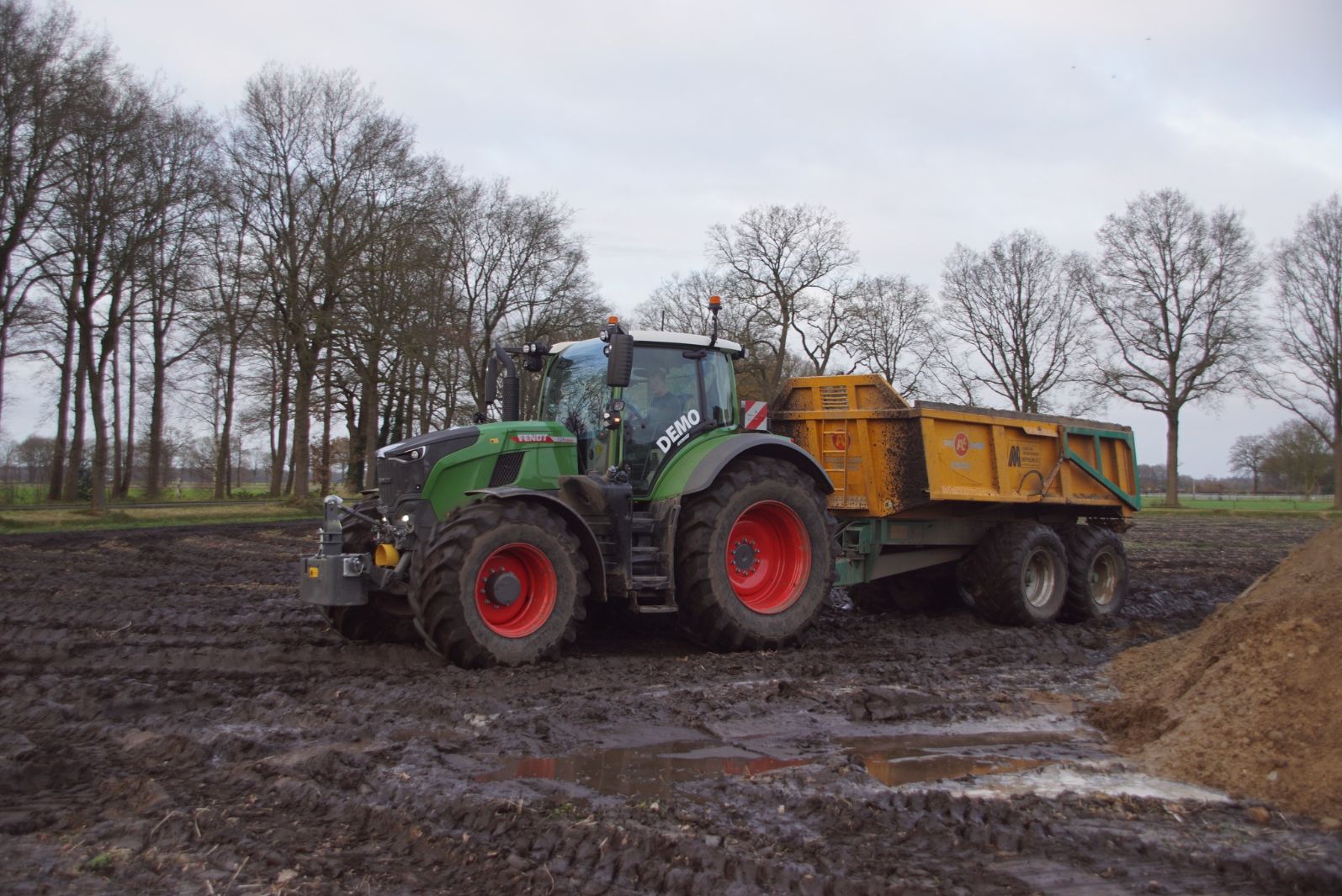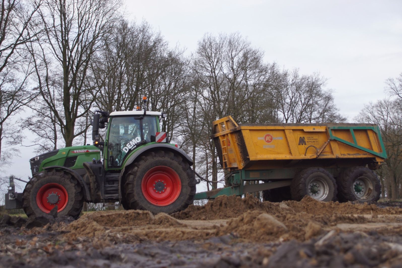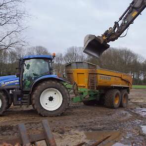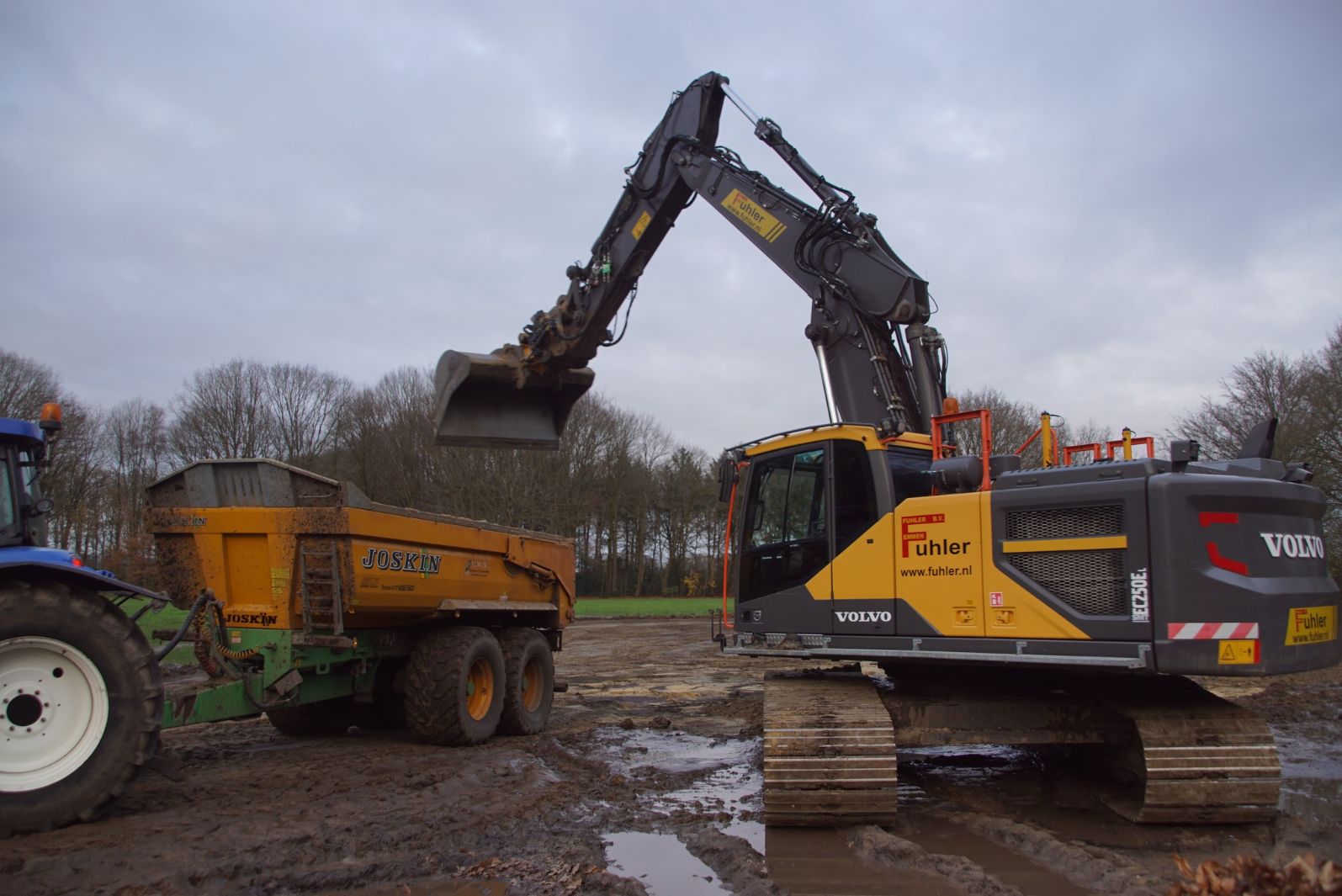 Een demo-Fendt 728 Vario, een New Holland en een Massey Ferguson verzorgen het transport van het zand dat wordt opgeladen door de Volvo-kraan.