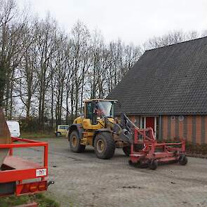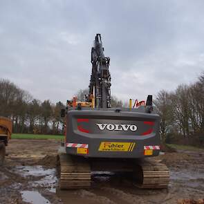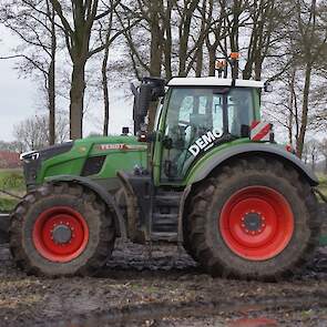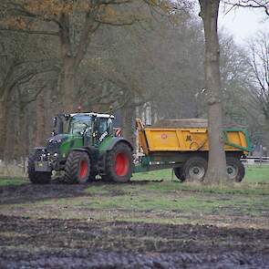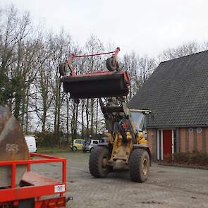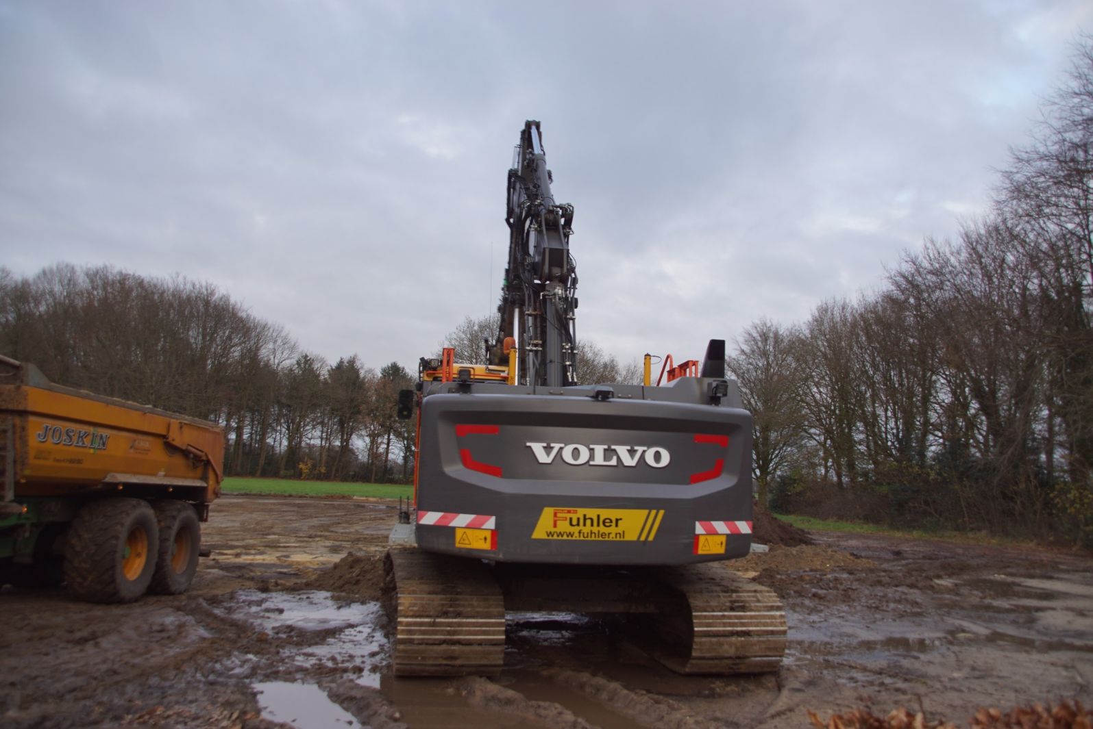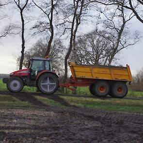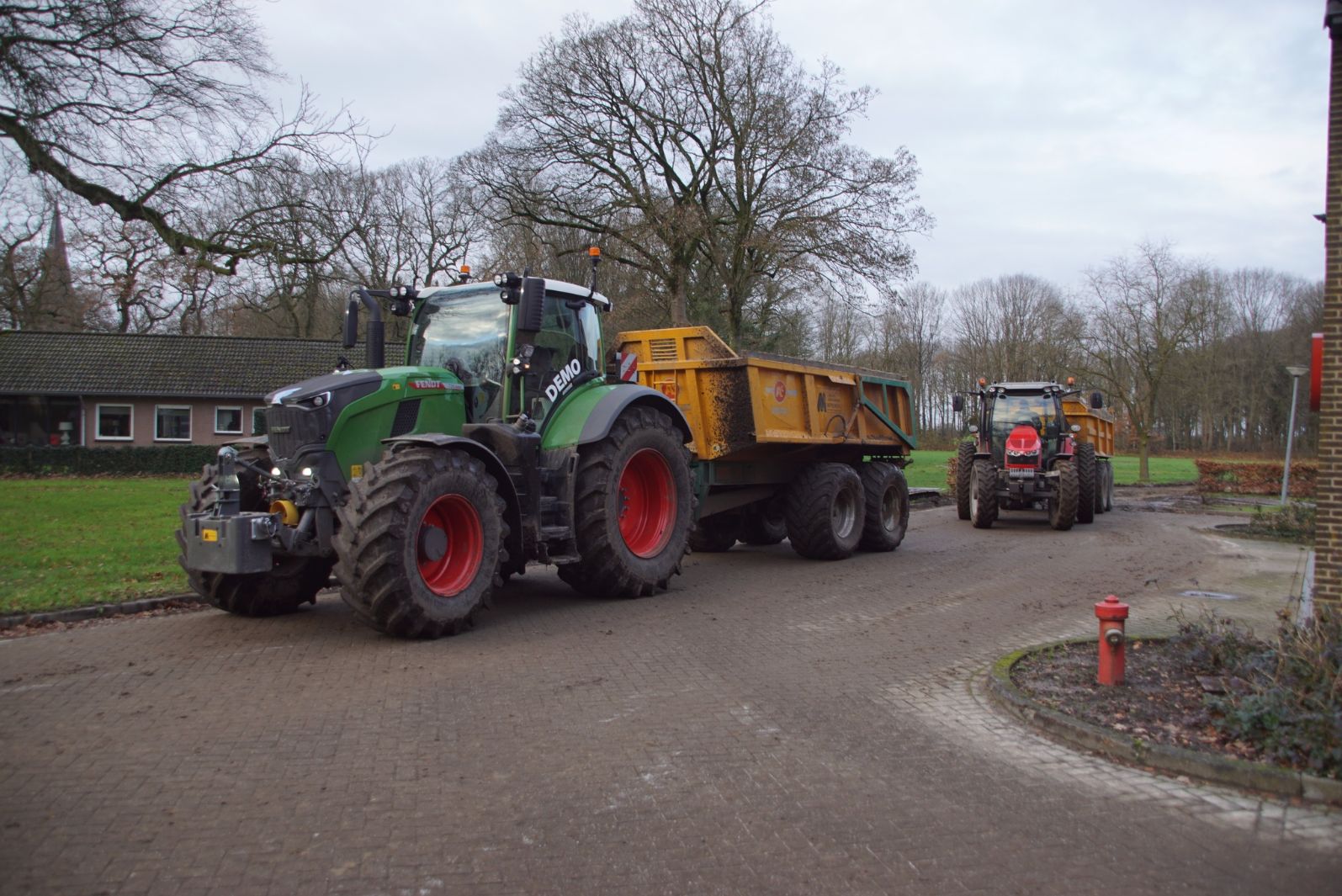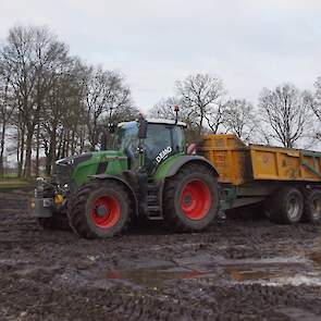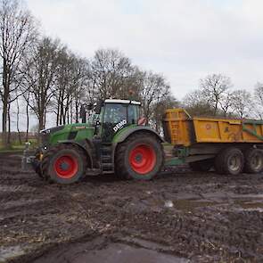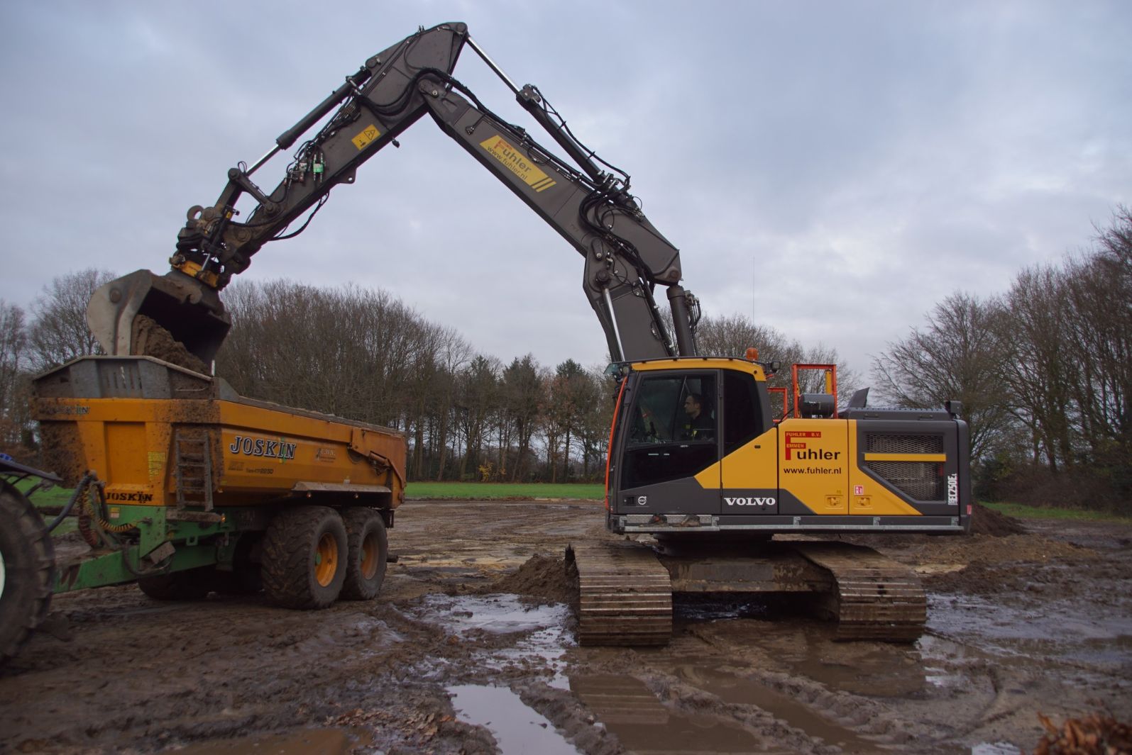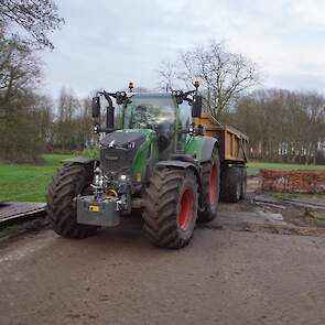 Een demo-Fendt 728 Vario, een New Holland en een Massey Ferguson verzorgen het transport van het zand dat wordt opgeladen door de Volvo-kraan.