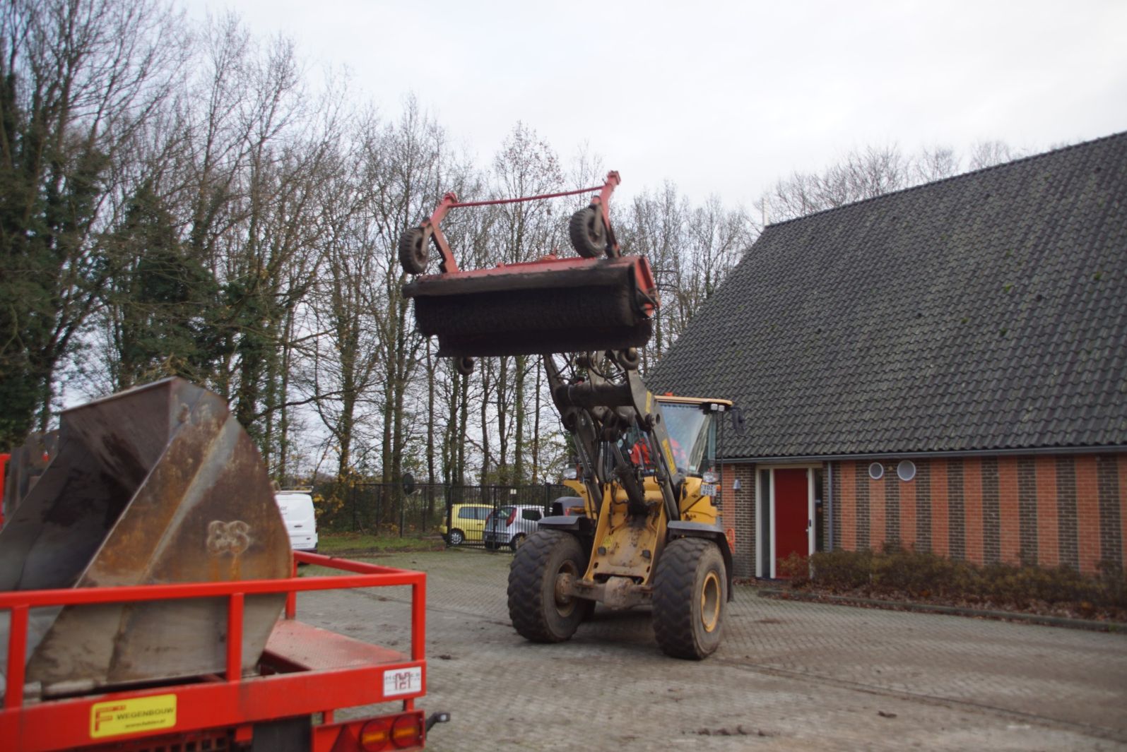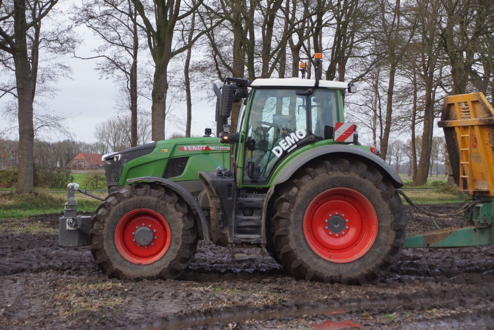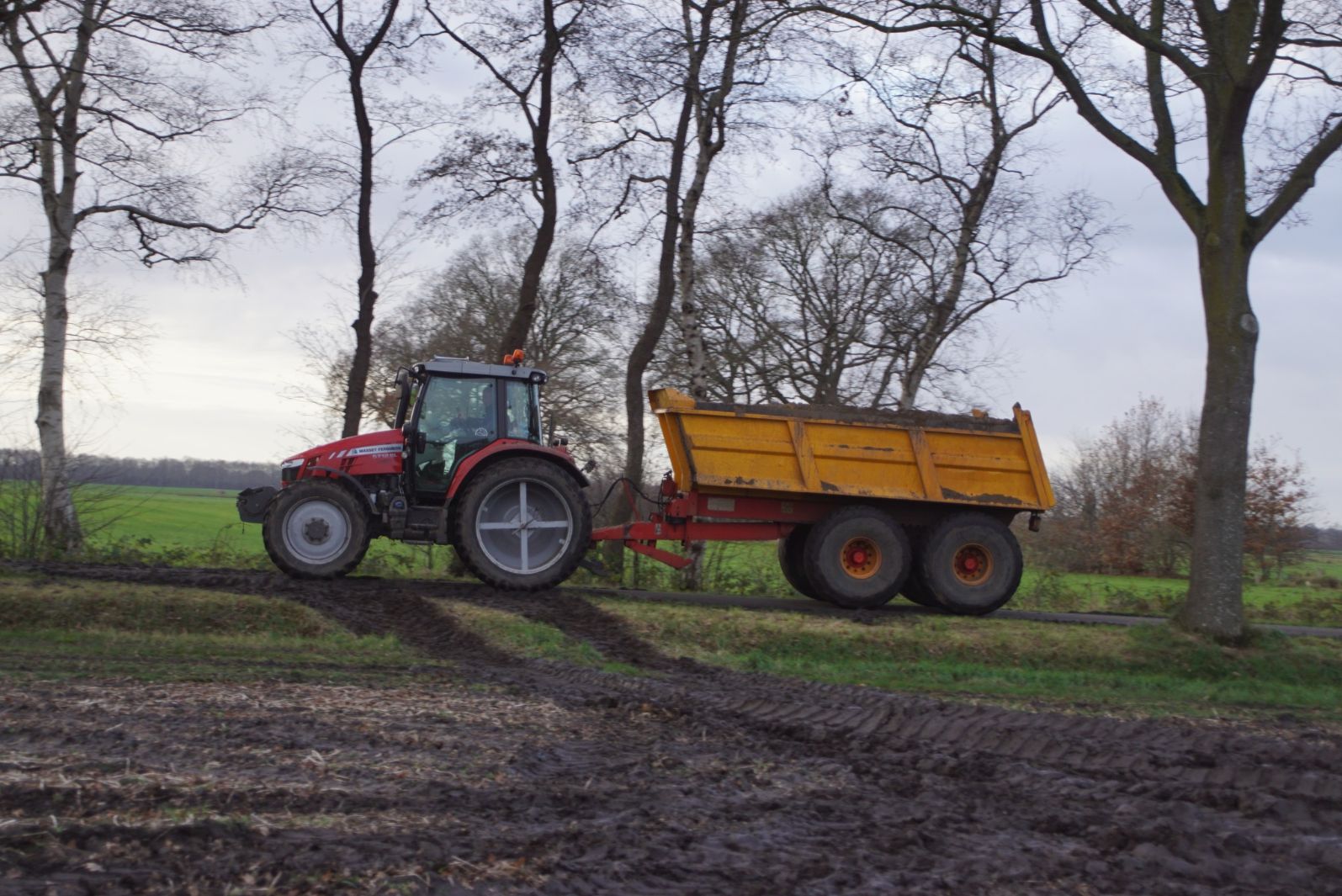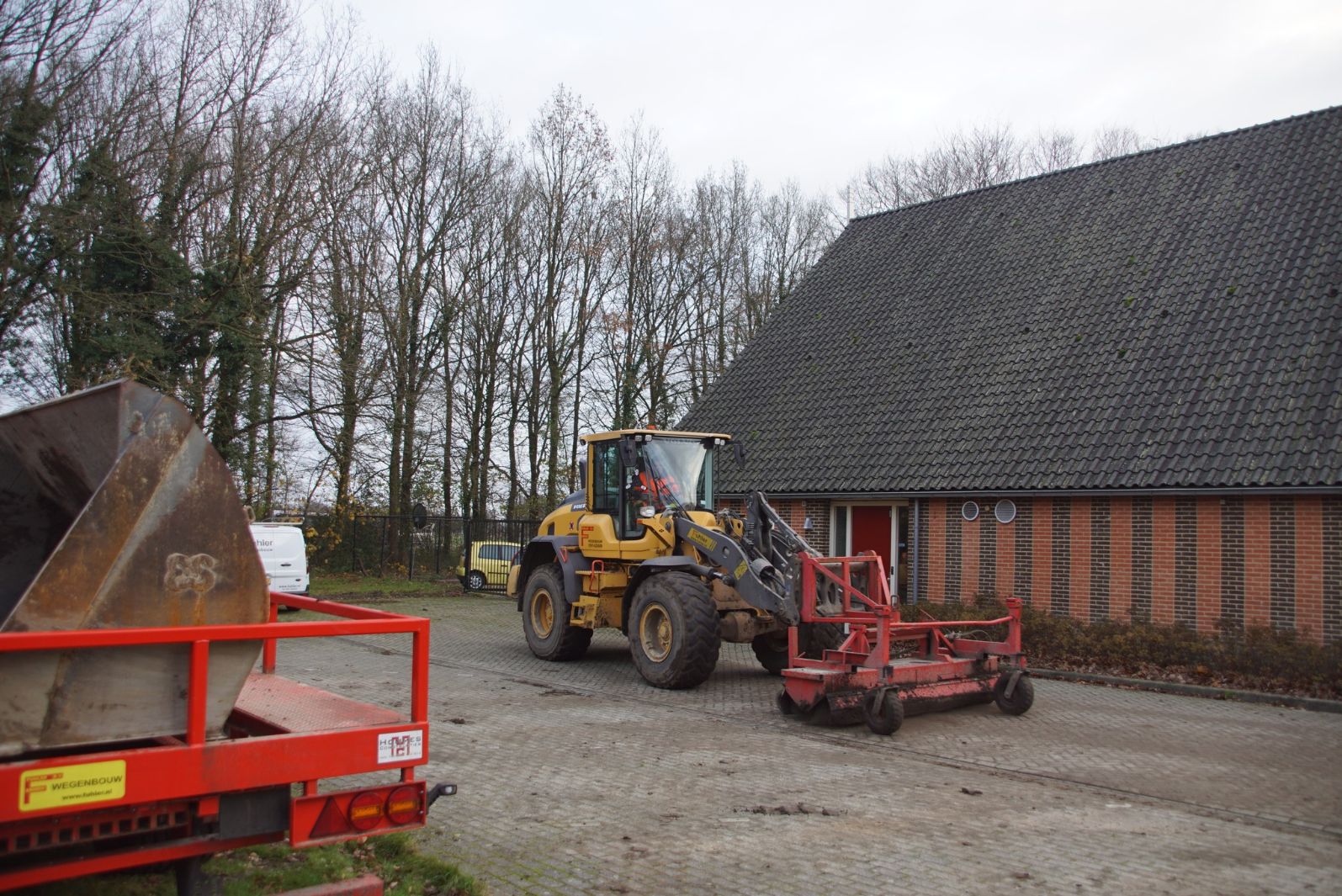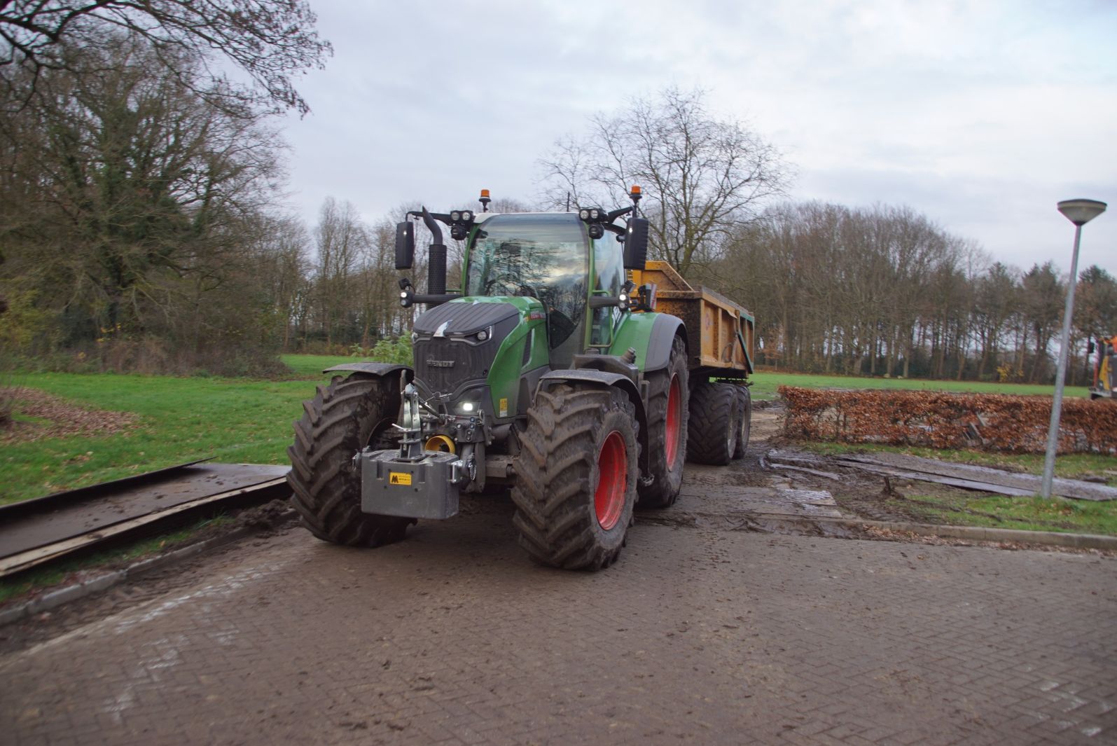 Een demo-Fendt 728 Vario, een New Holland en een Massey Ferguson verzorgen het transport van het zand dat wordt opgeladen door de Volvo-kraan.