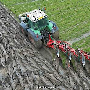 Ploegen op een mistige dag in de Flevopolder bij Zeewolde met een Fendt 820 Vario en een Kverneland EG 100 4-schaar wentelploeg. Het is nog erg nat en het is goed te zien dat de Fendt flink moet werken in deze zware kleigrond.