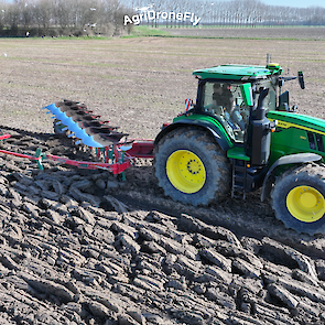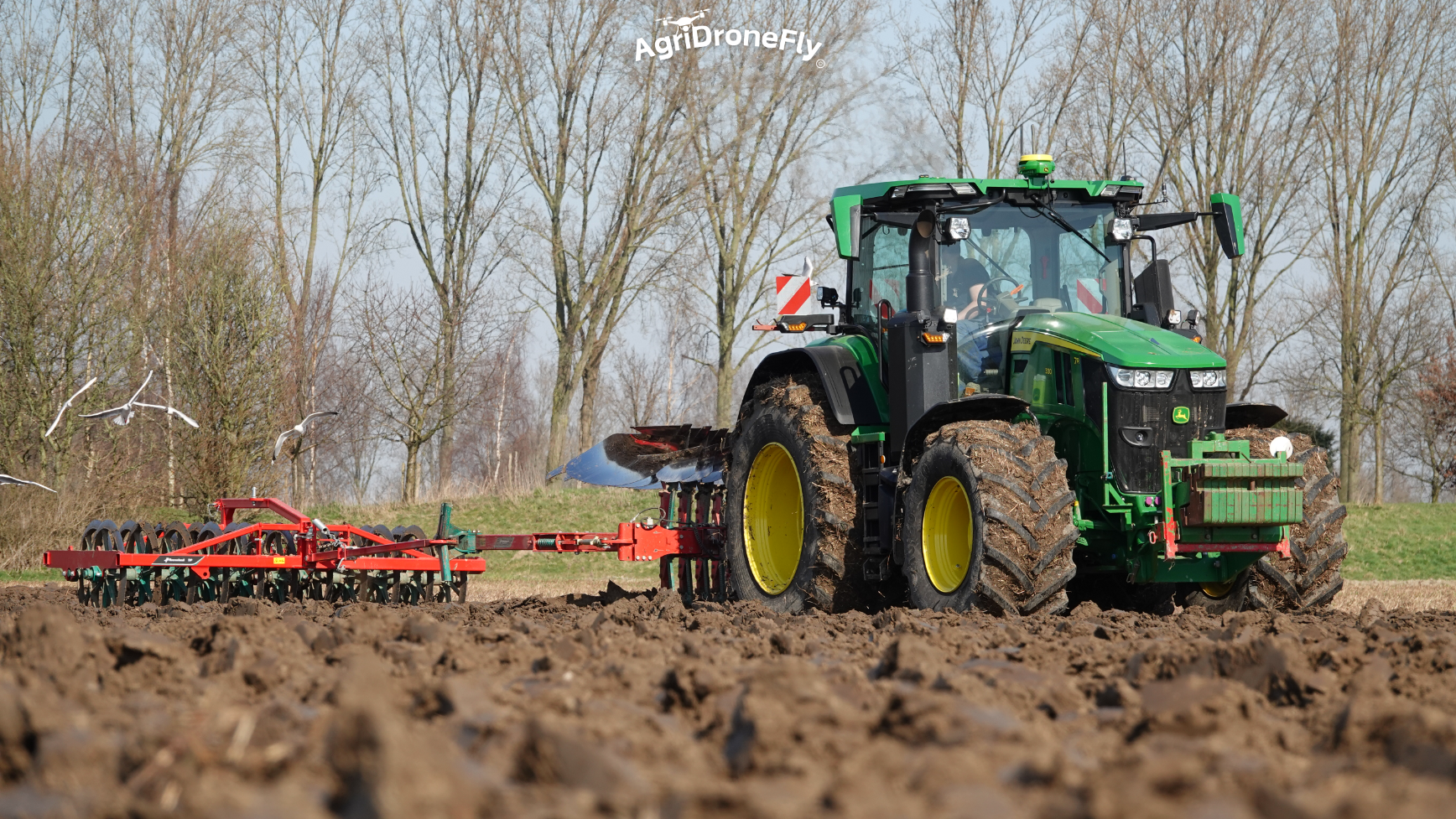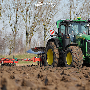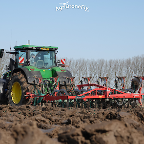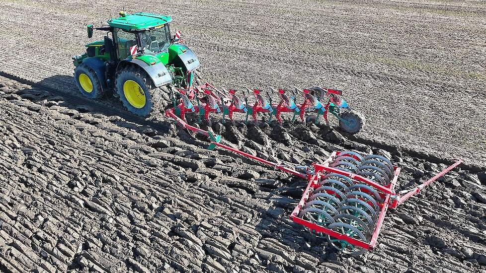 Ploegen en grondbewerking in één werkgang met een John Deere 7R.330 GEN 2 met Kverneland LO 100-zevenschaar en een Kverneland dubbele vorenpakker voor grondbewerking bij akkerbouwbedrijf Van der Eijk uit Numansdorp.