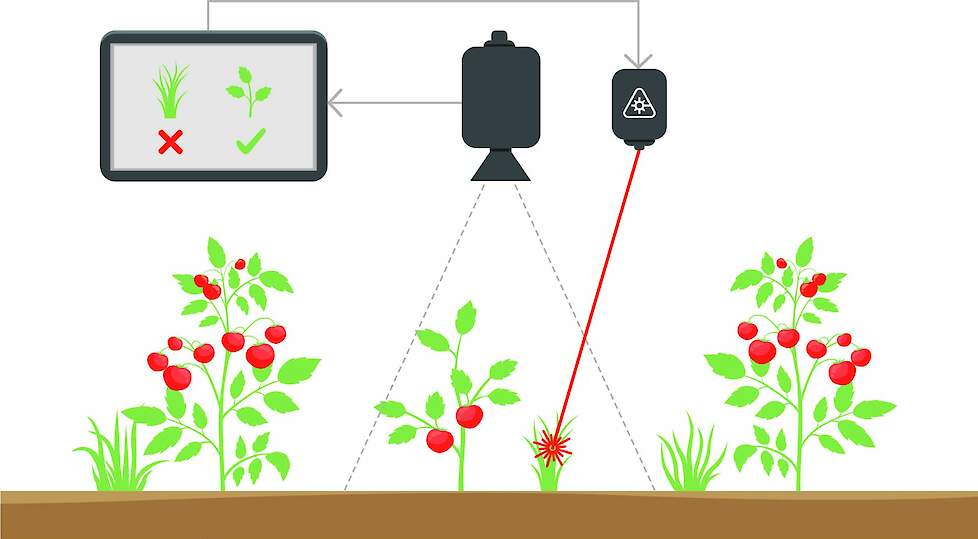 Het Escarda-systeem combineert zeer precieze lasertechnologie met een krachtige camera. Bevestigd op een door een trekker getrokken aanhanger, maakt de camera continu foto's van het veld, die in real-time worden geanalyseerd door een AI-gestuurd systeem. Wanneer de AI onkruid naast een gewas herkent, wordt de precisielaser geactiveerd en vernietigt het ongewenste plantje bij de wortel. De camera kan onkruid al vanaf een grootte van 3 mm identificeren, waardoor het onkruid in een vroeg stadium kan worden verwijderd.