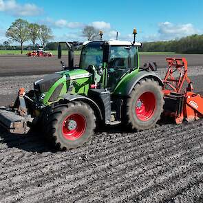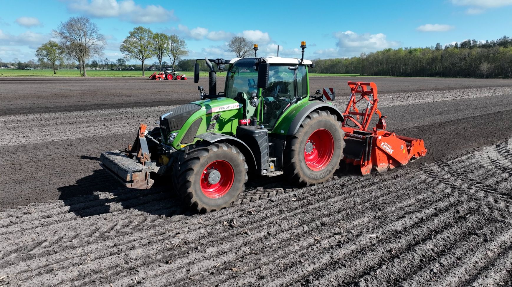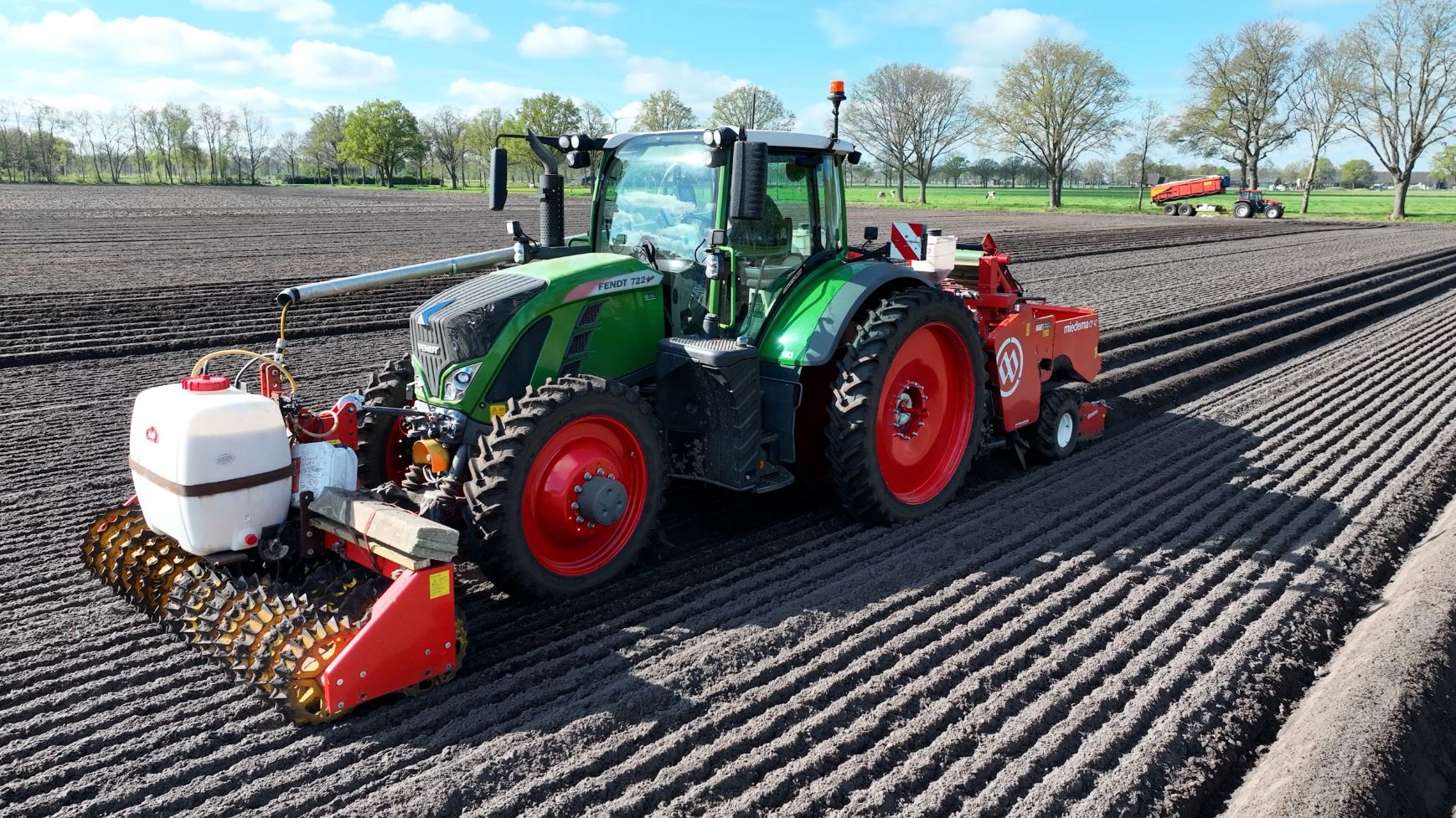 Dit keer het pootbed klaarleggen door middel van spitten, met daarna direct erachteraan het poten van de aardappels inclusief het opfrezen van de ruggen. Door een Fendt 722 Vario met Miedema-pootmachine en een Fendt 724 Variomet FarmaX-spitmachine.