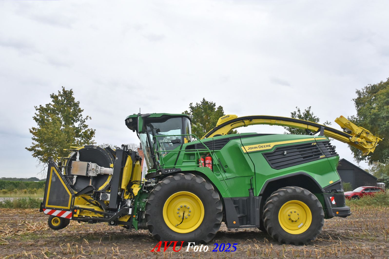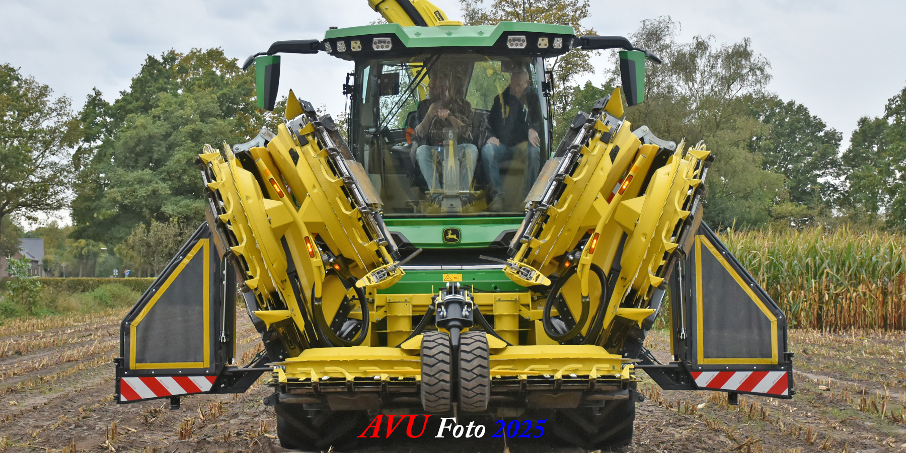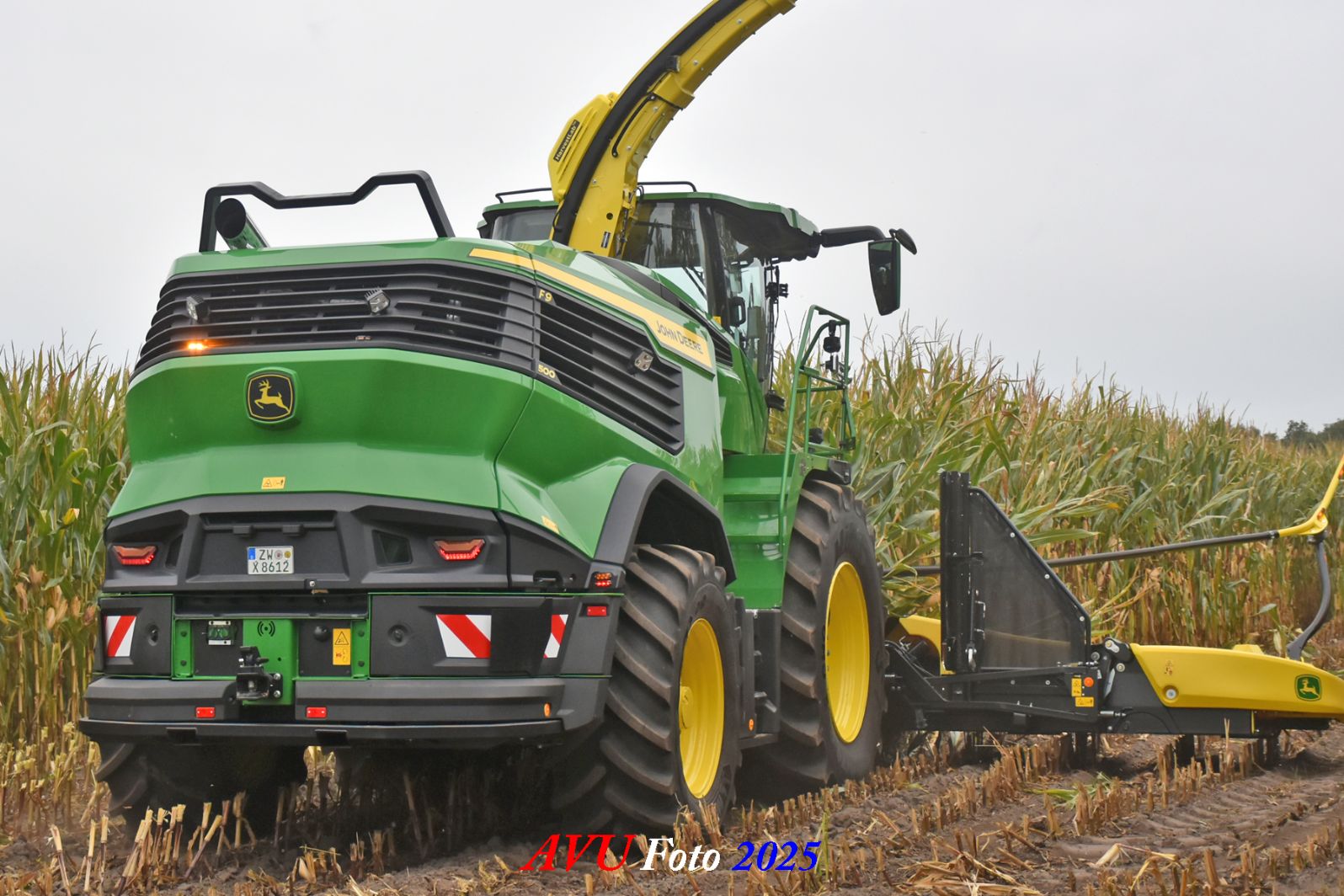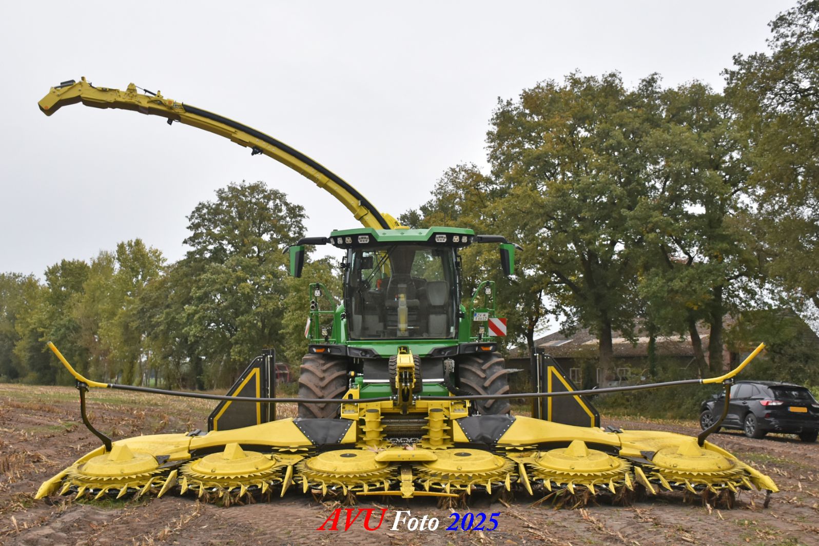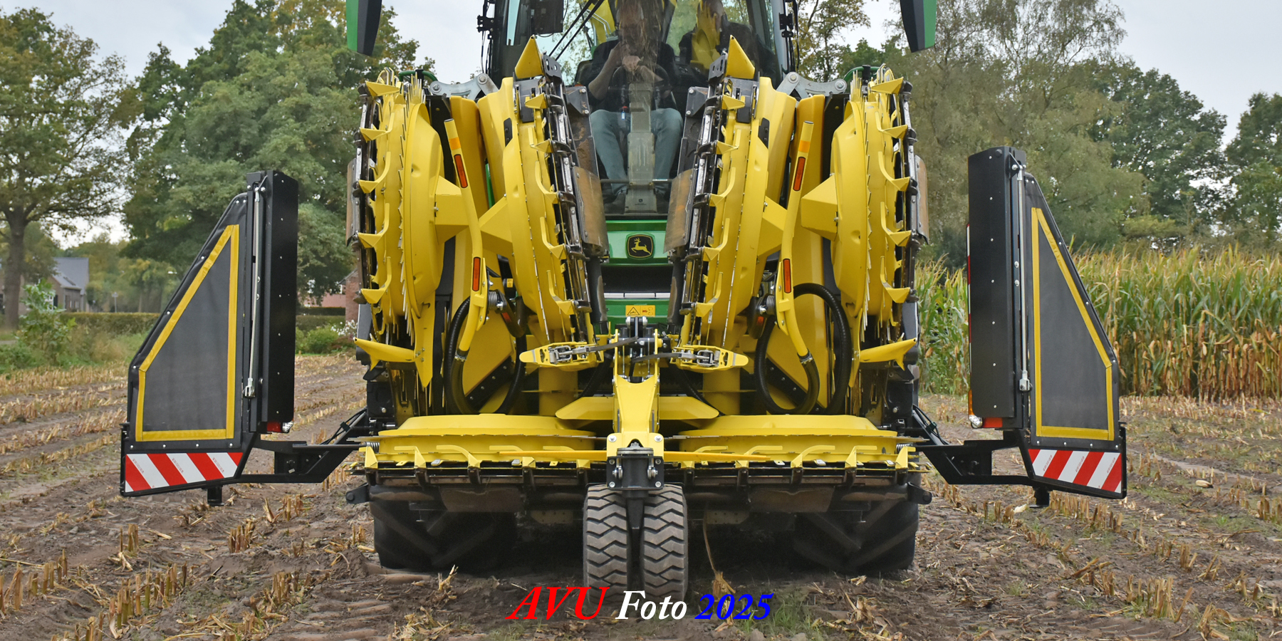 Door Kraakman georganiseerd. Hier is de kleinste met een John Deere JD18X-motor van 750 pk ingezet. De 9-serie gaat tot meer dan 1000 pk. Deze demo John Deere F9-500 is voorzien van vele extra’s o.a. 12 rij maïsbek, banden 800/70R42 en 650/60R34, bandendrukwisselsysteem, etc. "Wat een verschil met 45 jaar geleden toen ik de John Deere 5200- en later de 5460-typen verkocht heb", aldus Ad Verhoeven, de fotograaf van deze reportage.