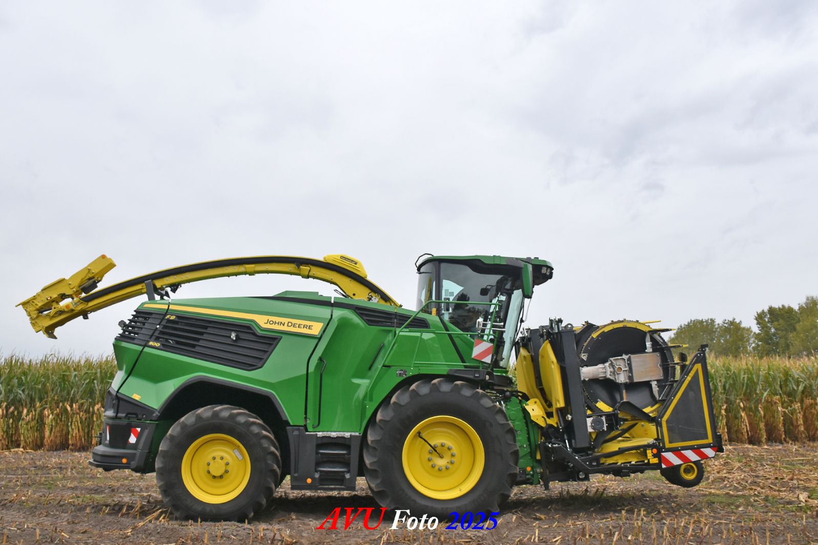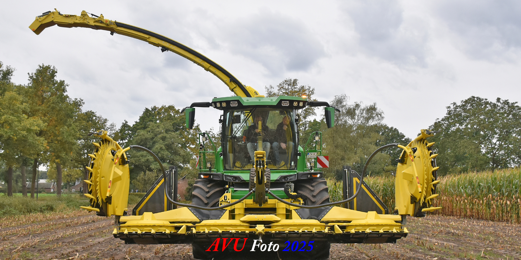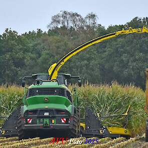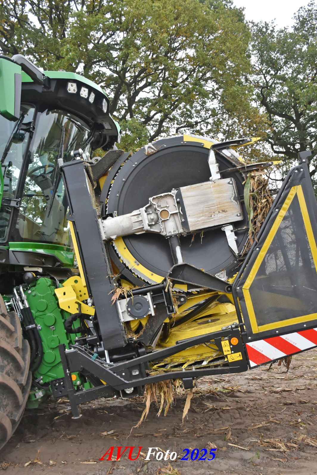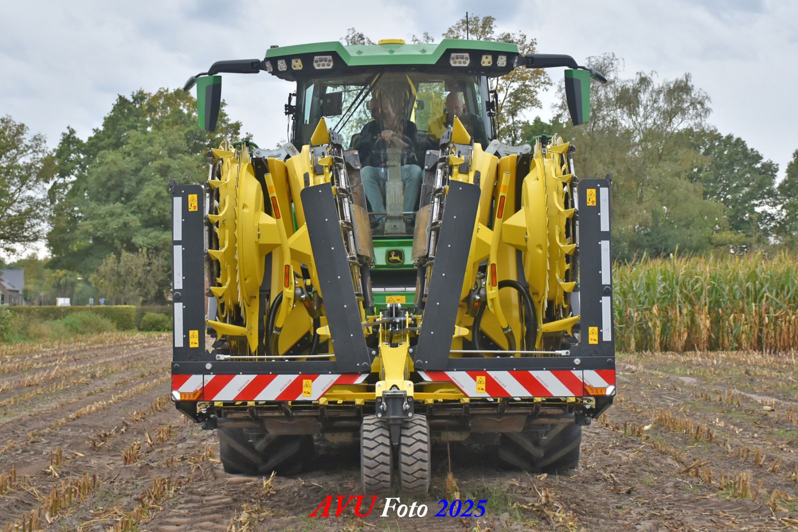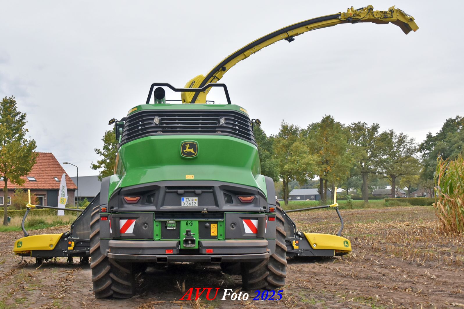 Door Kraakman georganiseerd. Hier is de kleinste met een John Deere JD18X-motor van 750 pk ingezet. De 9-serie gaat tot meer dan 1000 pk. Deze demo John Deere F9-500 is voorzien van vele extra’s o.a. 12 rij maïsbek, banden 800/70R42 en 650/60R34, bandendrukwisselsysteem, etc. "Wat een verschil met 45 jaar geleden toen ik de John Deere 5200- en later de 5460-typen verkocht heb", aldus Ad Verhoeven, de fotograaf van deze reportage.