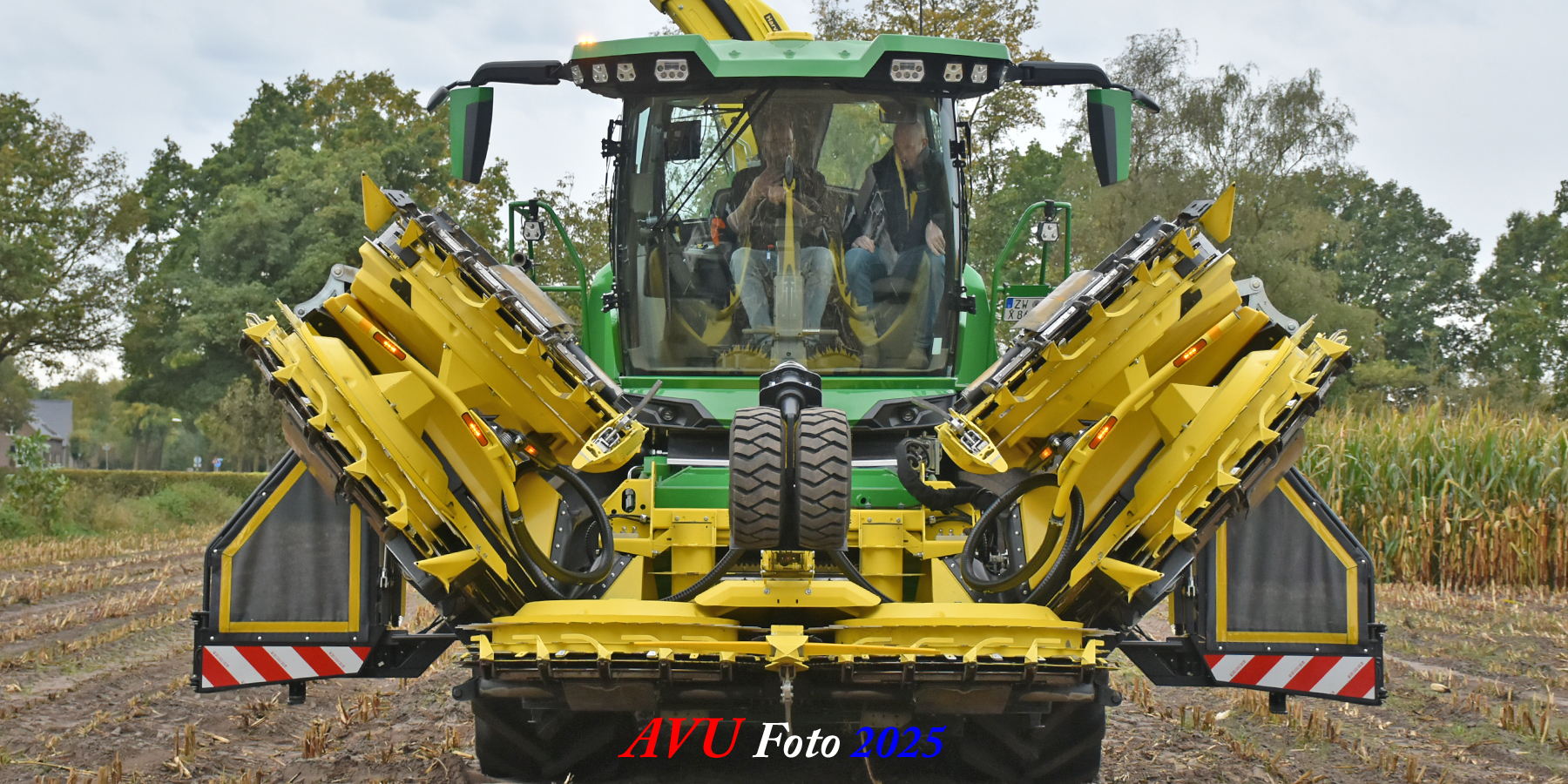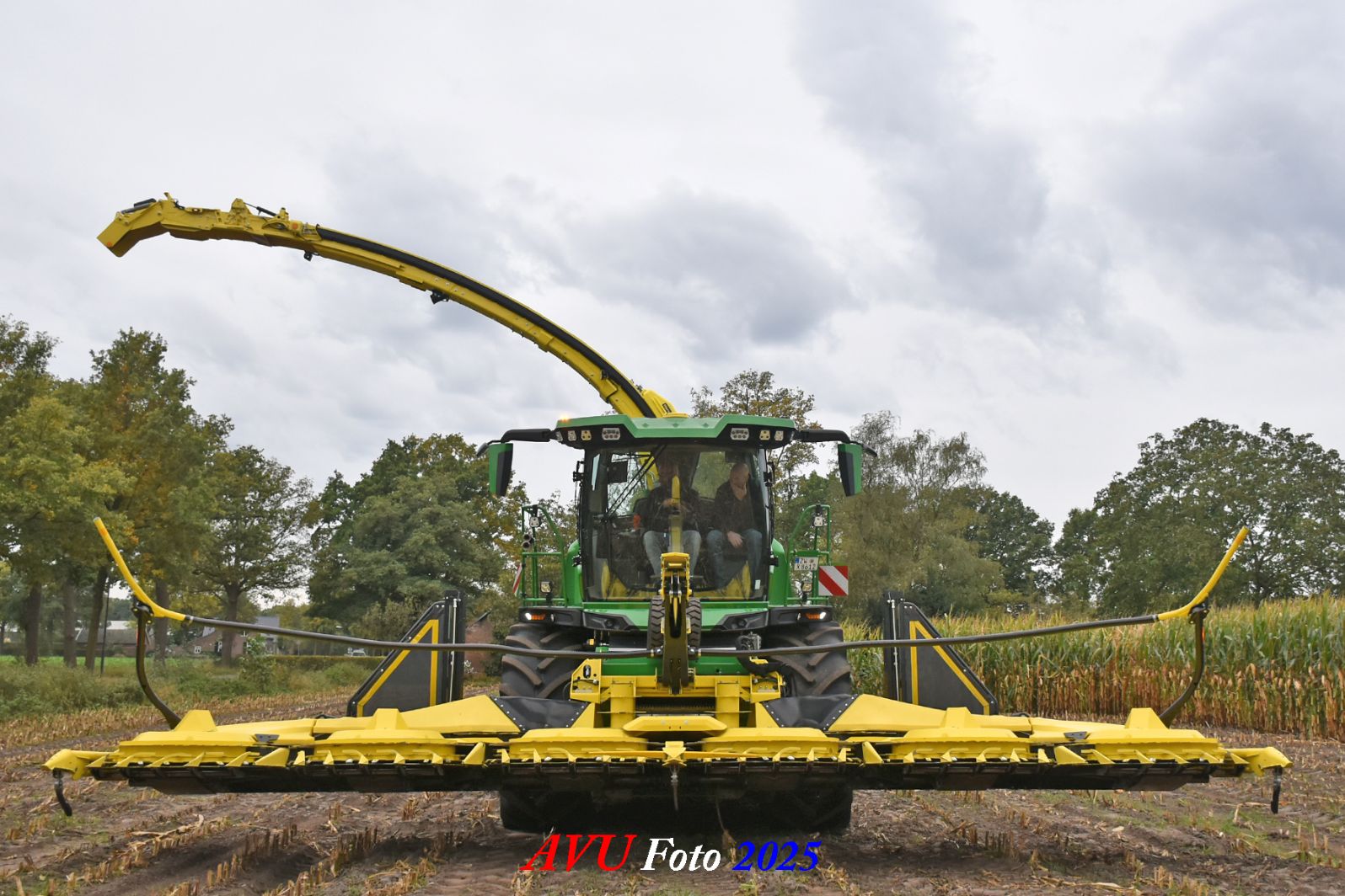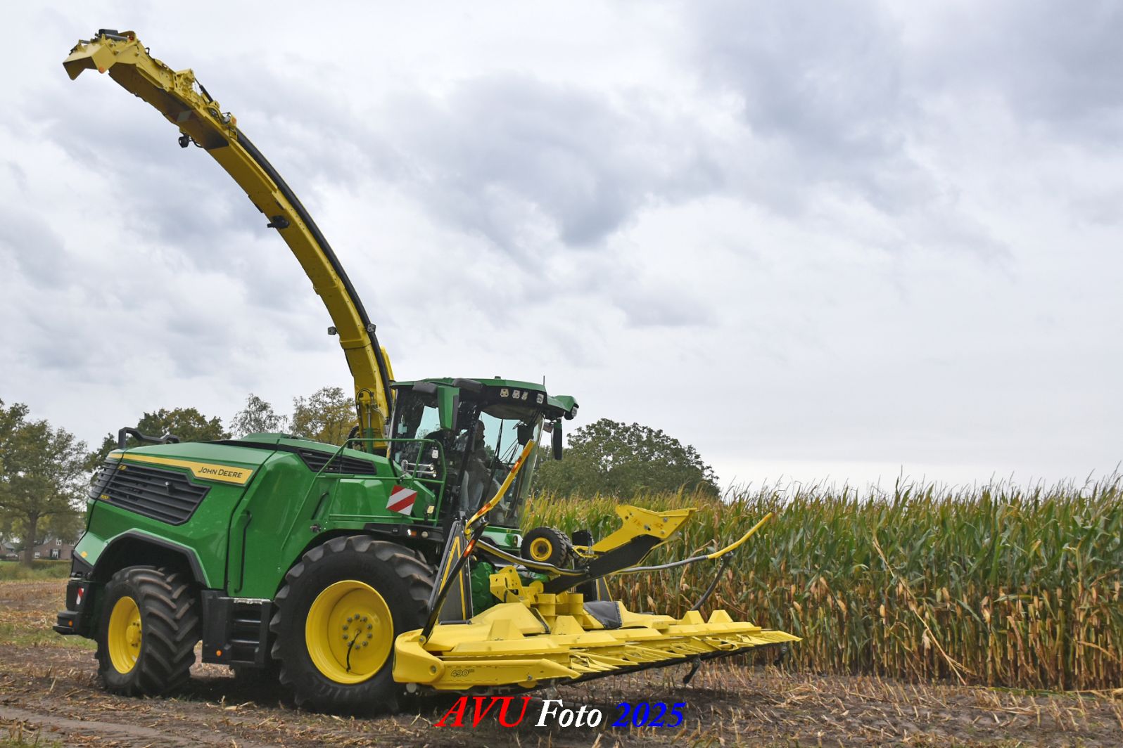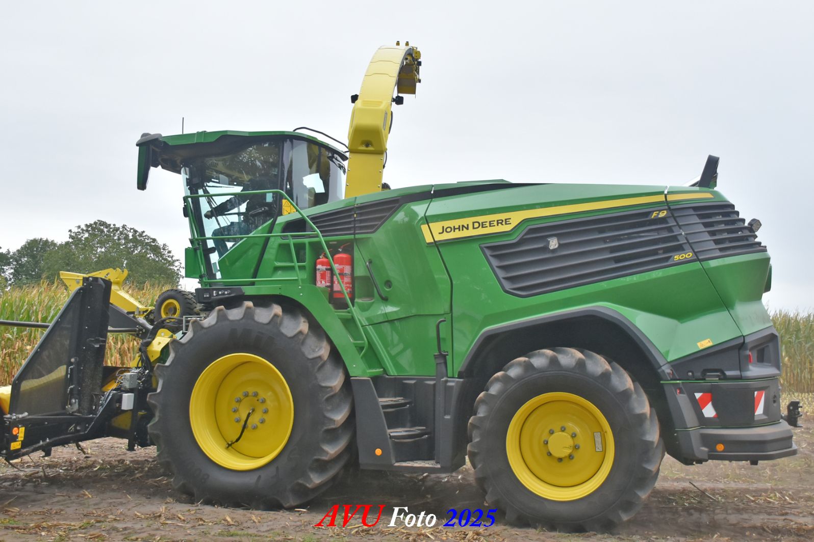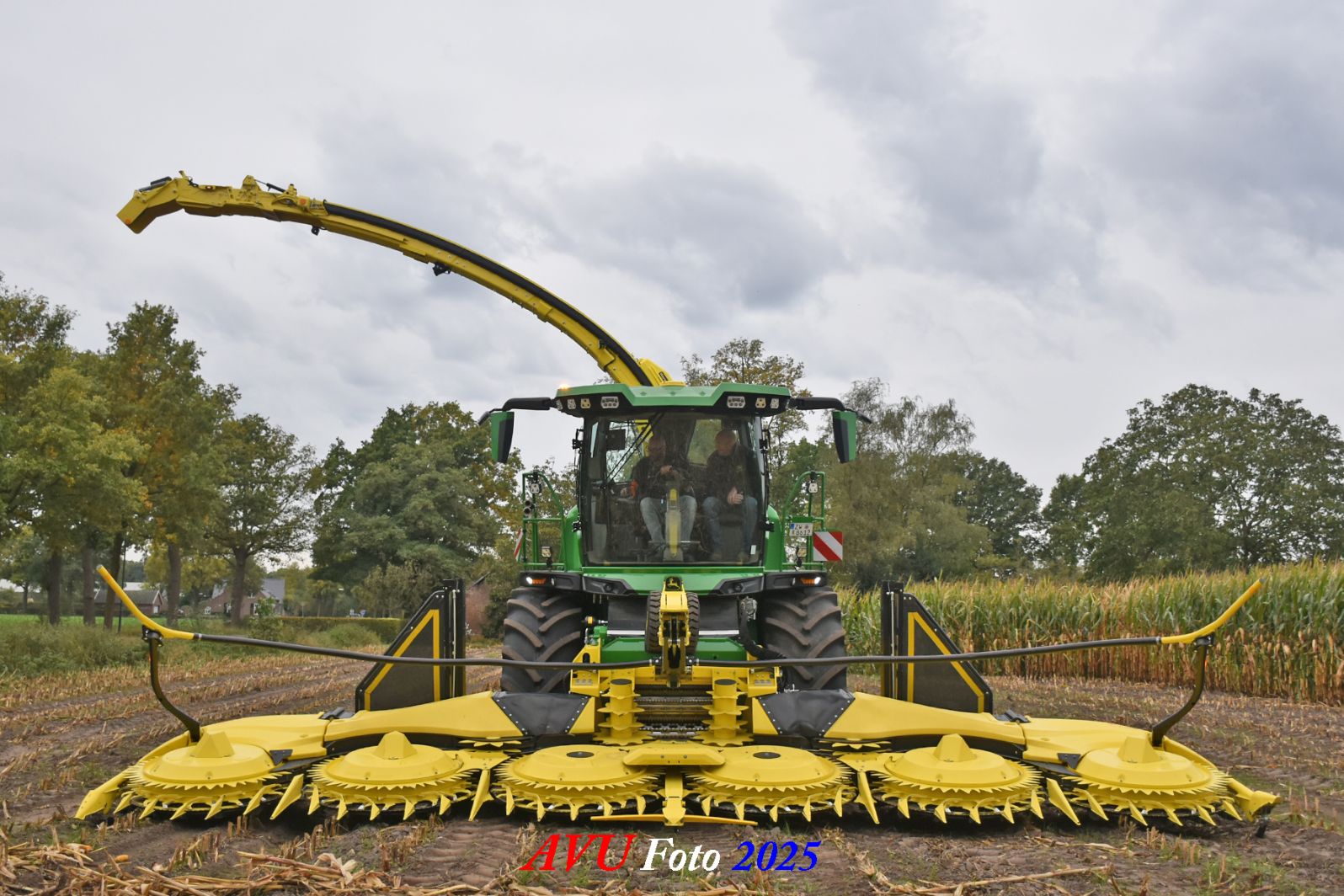 Door Kraakman georganiseerd. Hier is de kleinste met een John Deere JD18X-motor van 750 pk ingezet. De 9-serie gaat tot meer dan 1000 pk. Deze demo John Deere F9-500 is voorzien van vele extra’s o.a. 12 rij maïsbek, banden 800/70R42 en 650/60R34, bandendrukwisselsysteem, etc. "Wat een verschil met 45 jaar geleden toen ik de John Deere 5200- en later de 5460-typen verkocht heb", aldus Ad Verhoeven, de fotograaf van deze reportage.