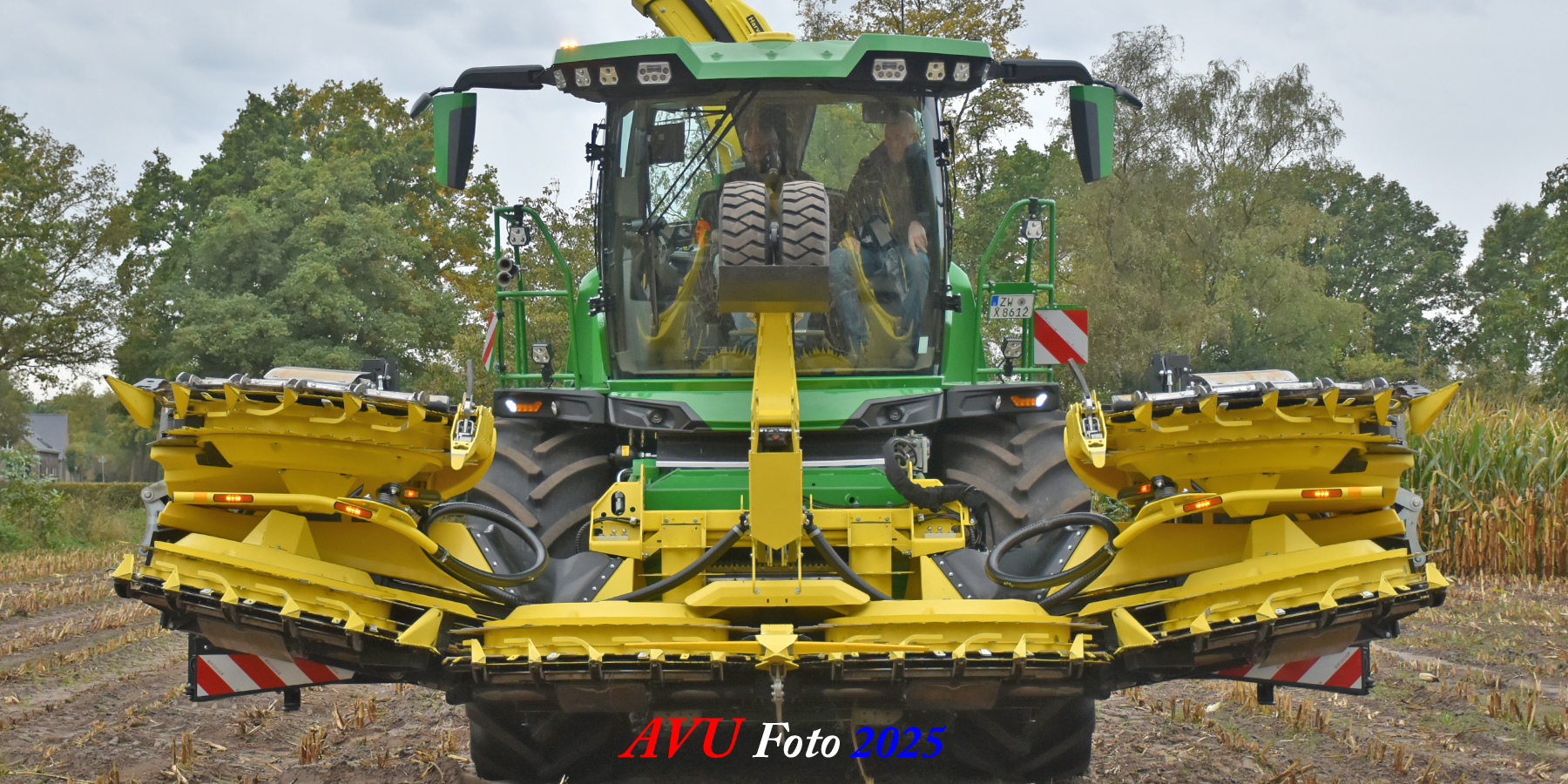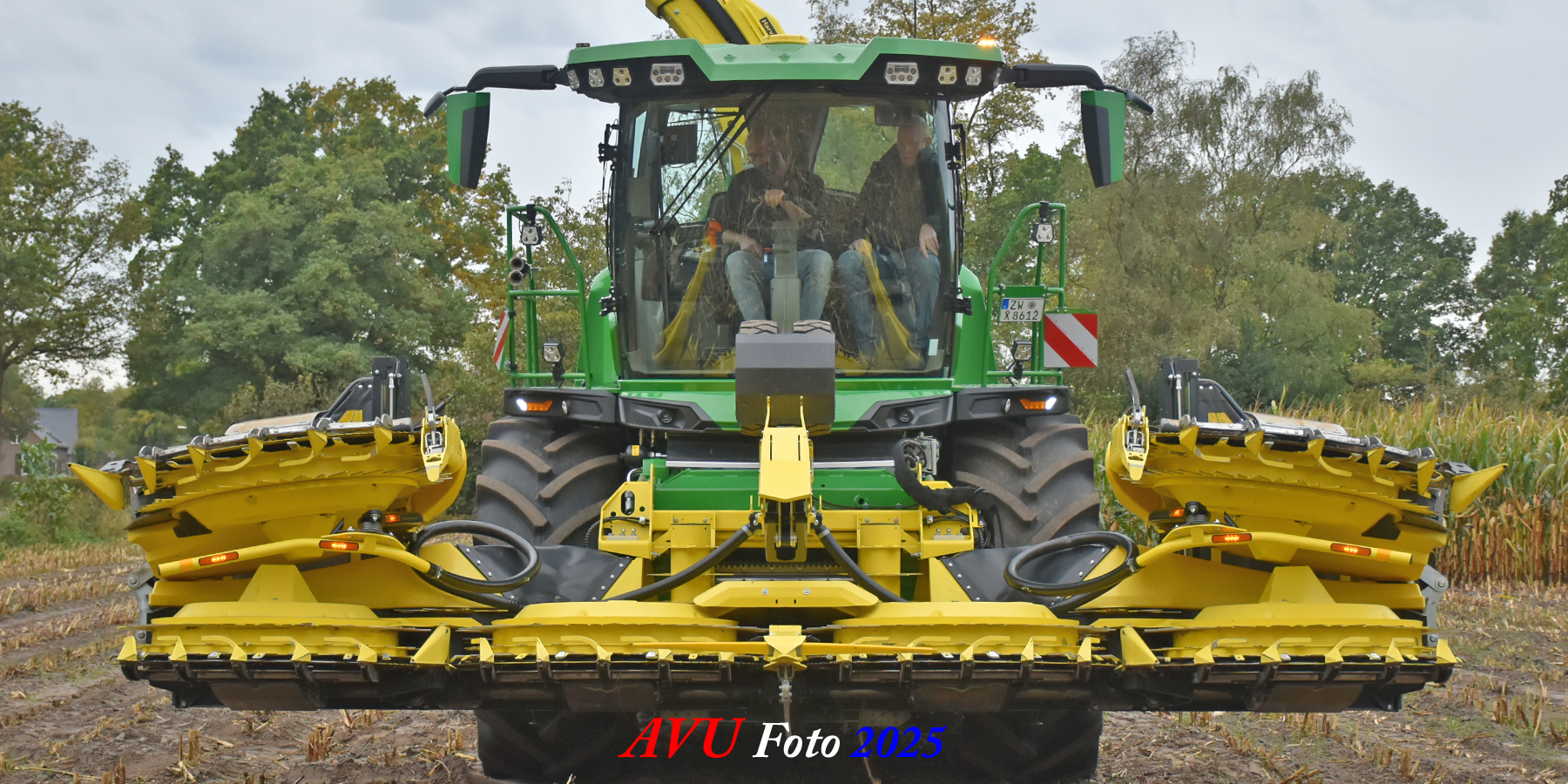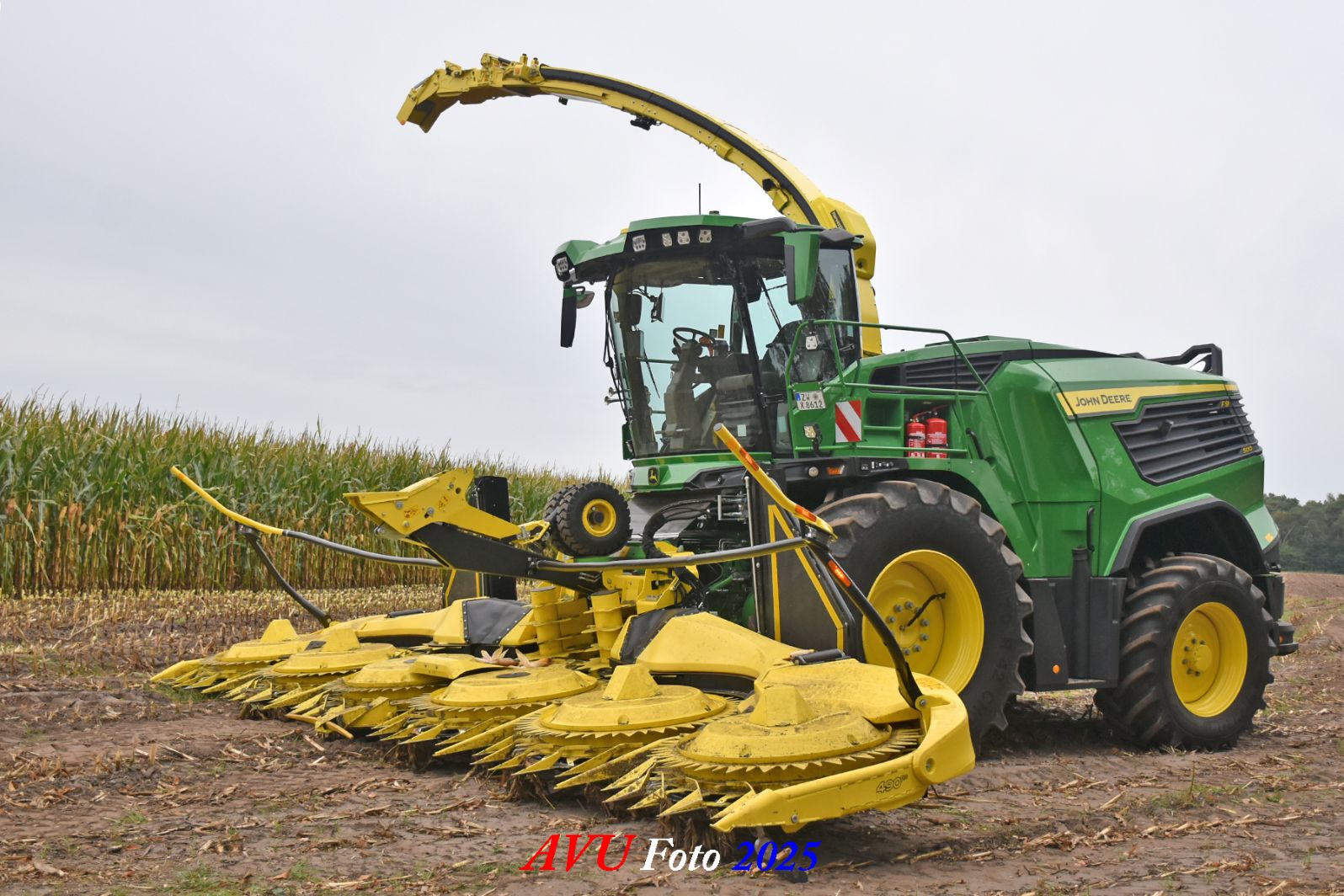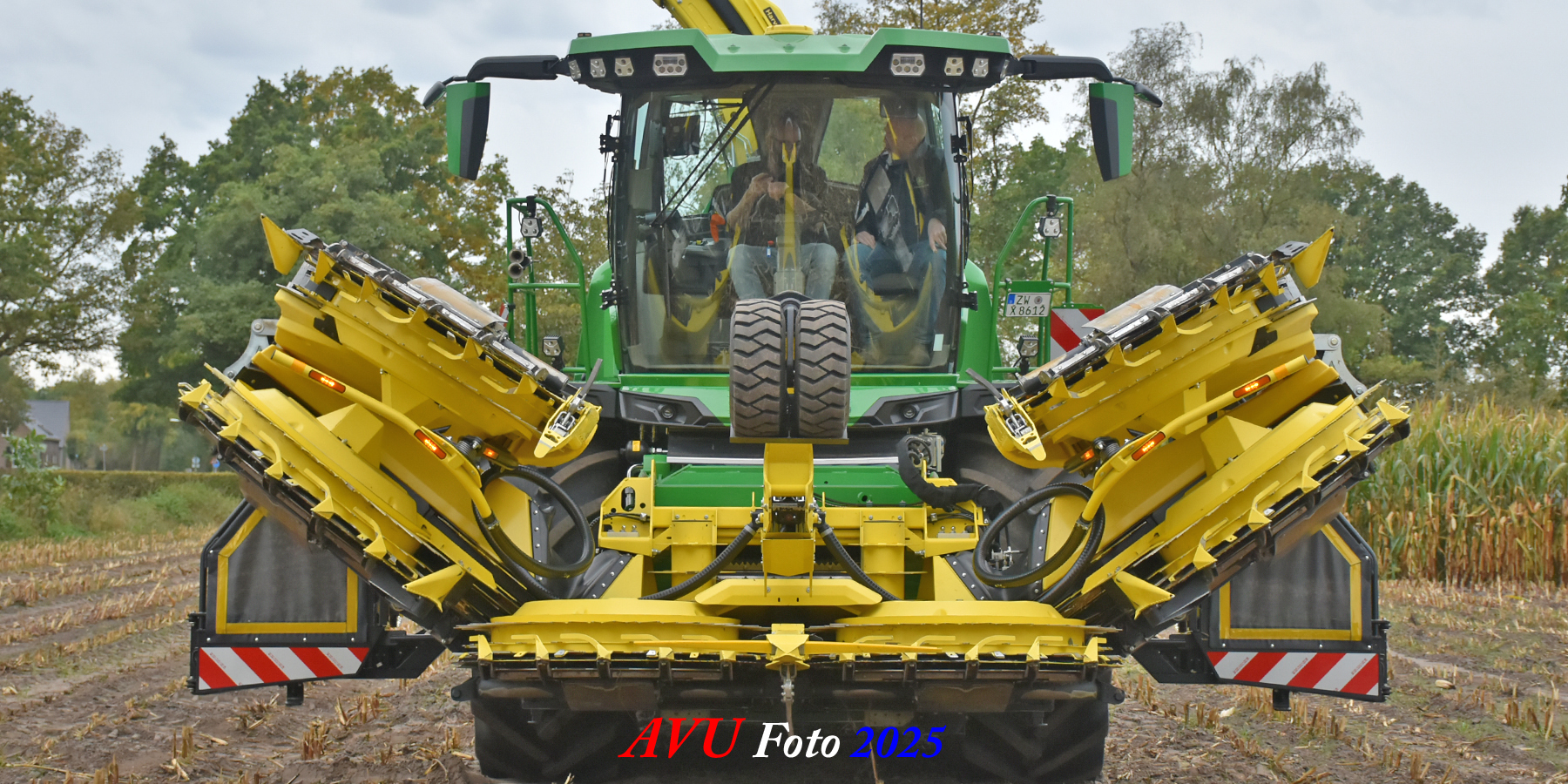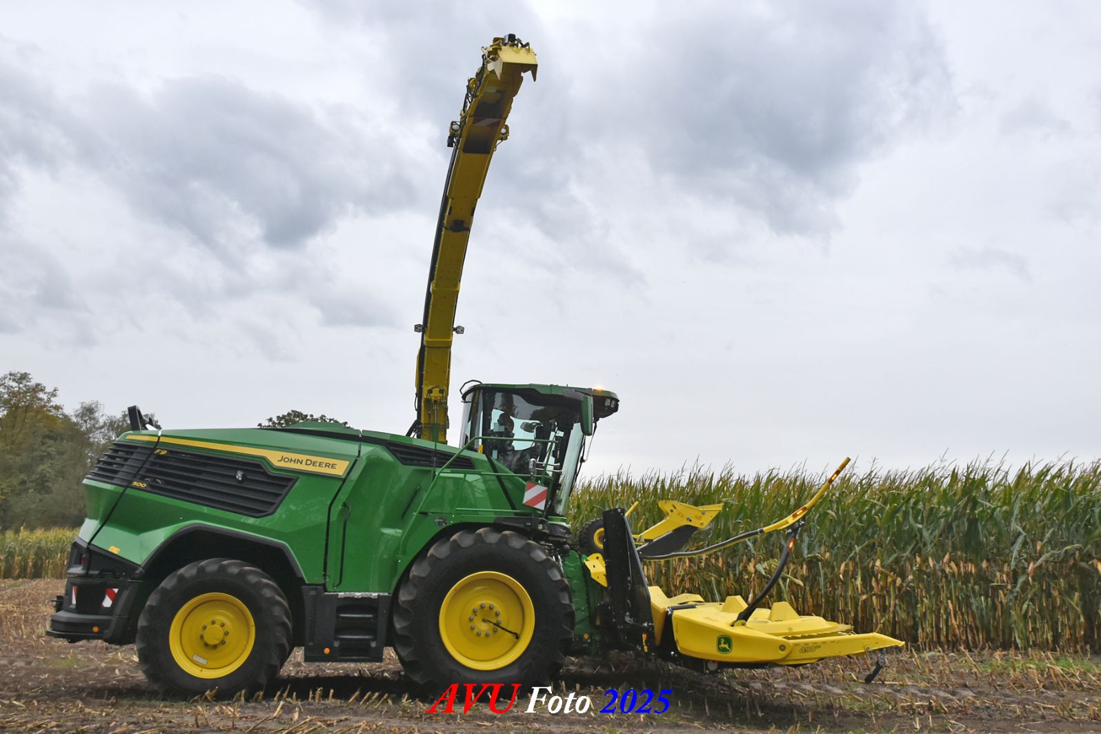 Door Kraakman georganiseerd. Hier is de kleinste met een John Deere JD18X-motor van 750 pk ingezet. De 9-serie gaat tot meer dan 1000 pk. Deze demo John Deere F9-500 is voorzien van vele extra’s o.a. 12 rij maïsbek, banden 800/70R42 en 650/60R34, bandendrukwisselsysteem, etc. "Wat een verschil met 45 jaar geleden toen ik de John Deere 5200- en later de 5460-typen verkocht heb", aldus Ad Verhoeven, de fotograaf van deze reportage.