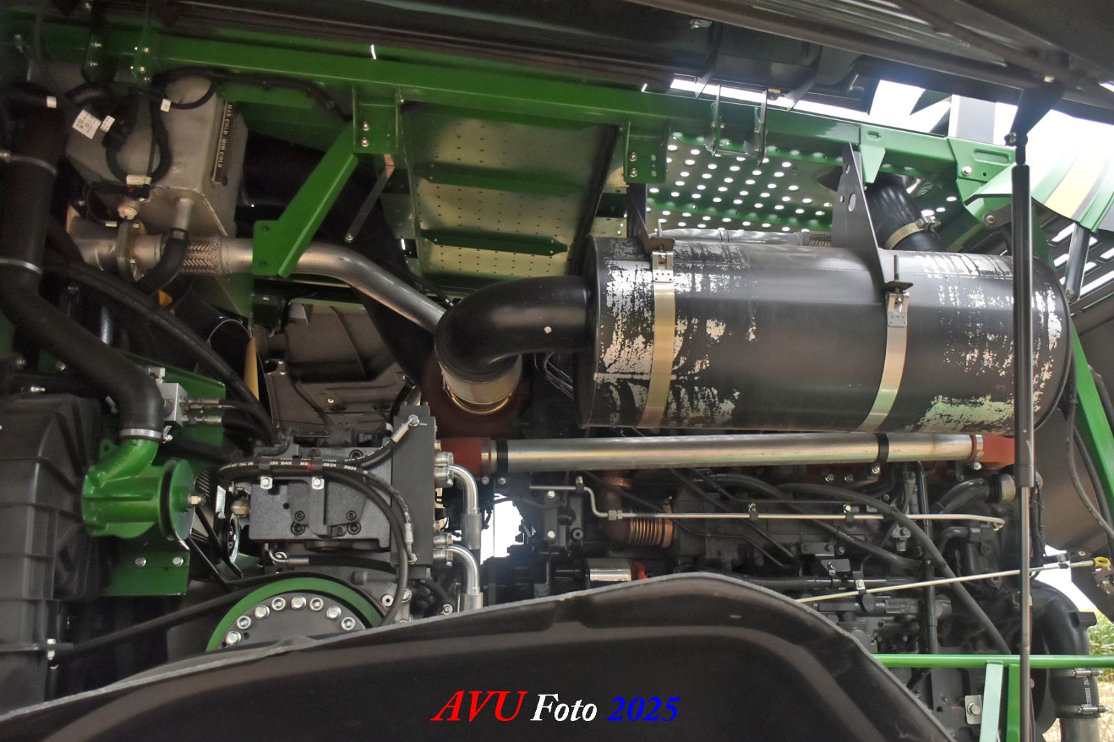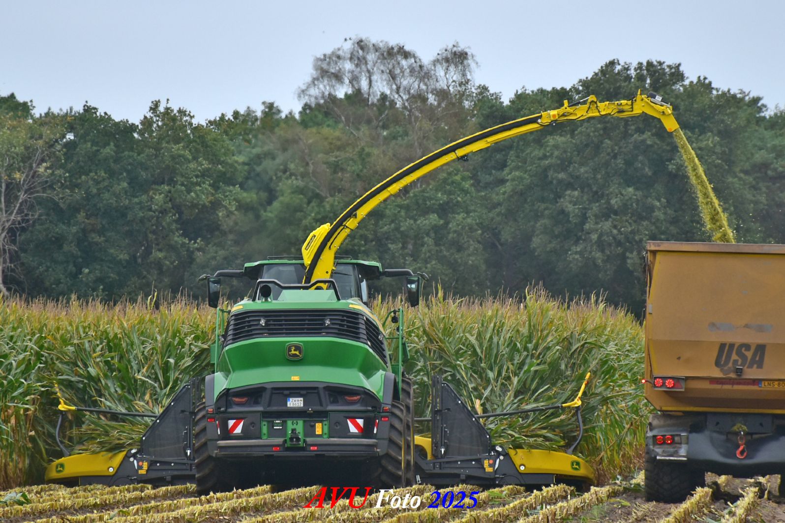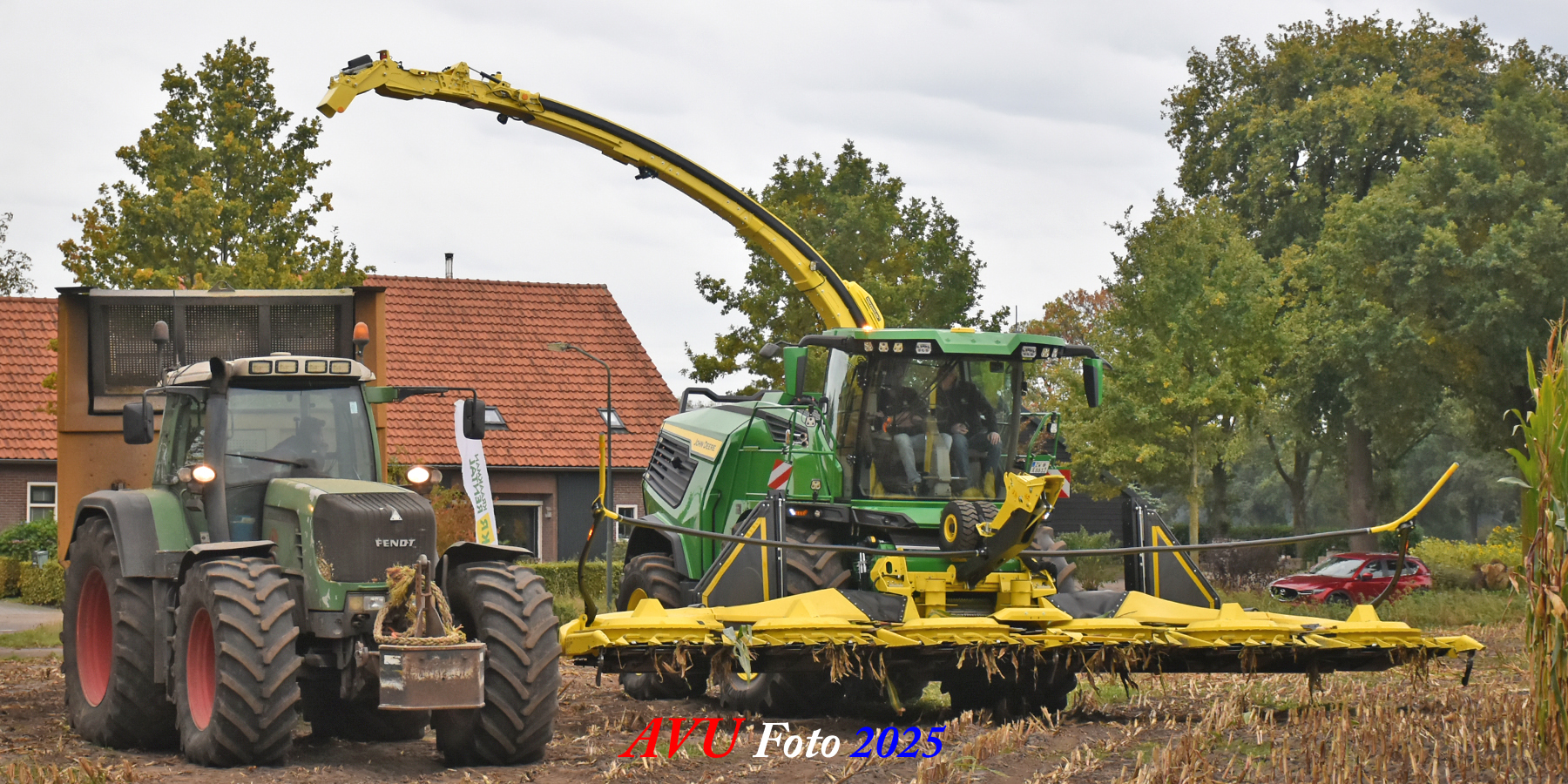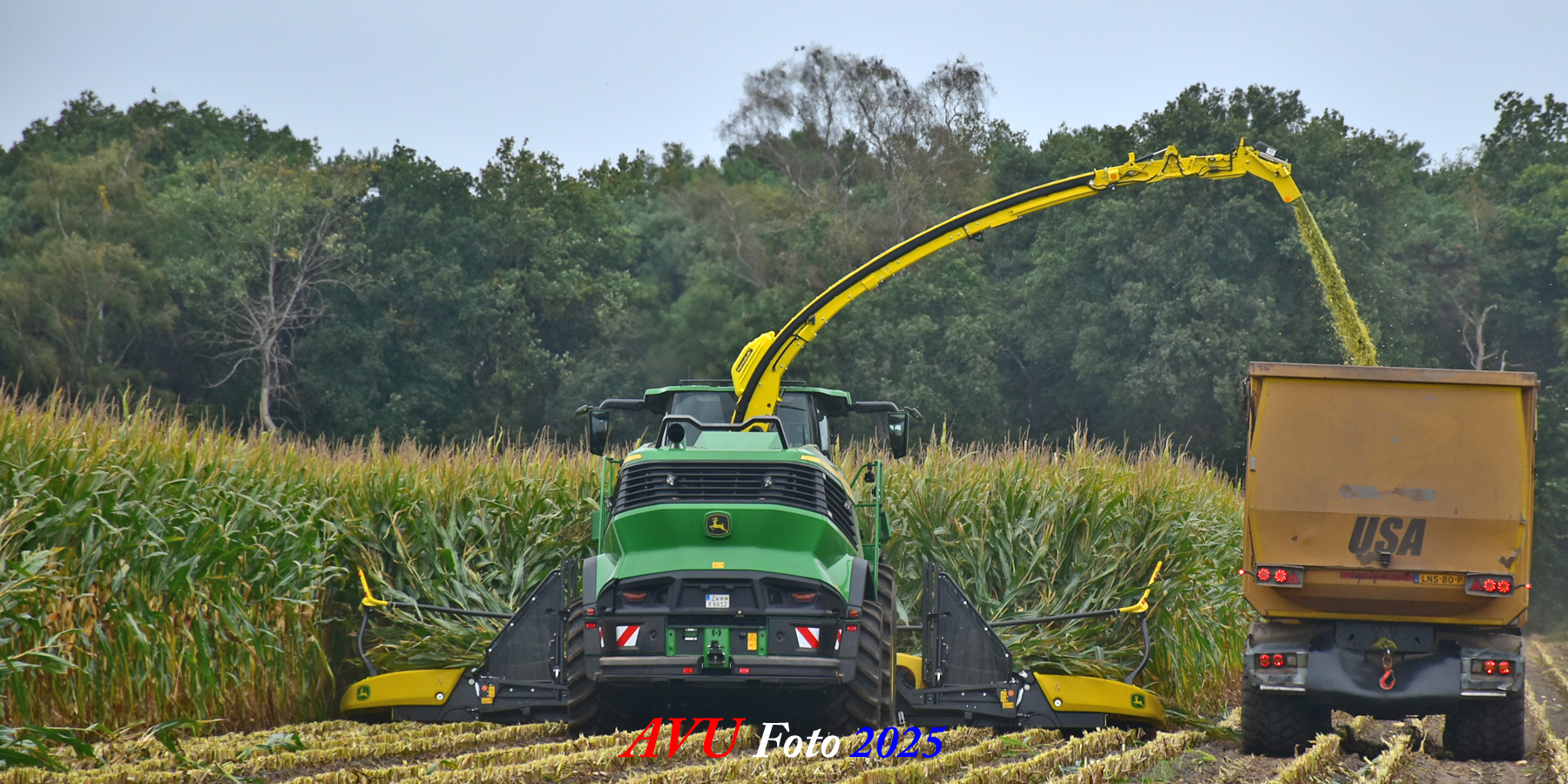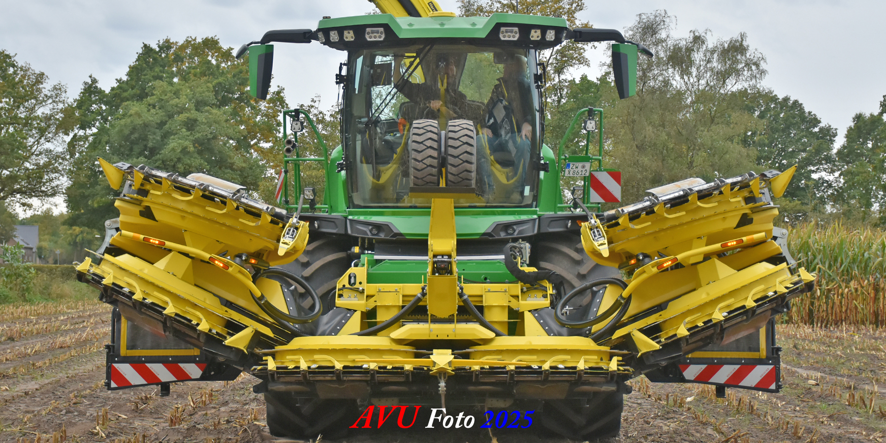 Door Kraakman georganiseerd. Hier is de kleinste met een John Deere JD18X-motor van 750 pk ingezet. De 9-serie gaat tot meer dan 1000 pk. Deze demo John Deere F9-500 is voorzien van vele extra’s o.a. 12 rij maïsbek, banden 800/70R42 en 650/60R34, bandendrukwisselsysteem, etc. "Wat een verschil met 45 jaar geleden toen ik de John Deere 5200- en later de 5460-typen verkocht heb", aldus Ad Verhoeven, de fotograaf van deze reportage.