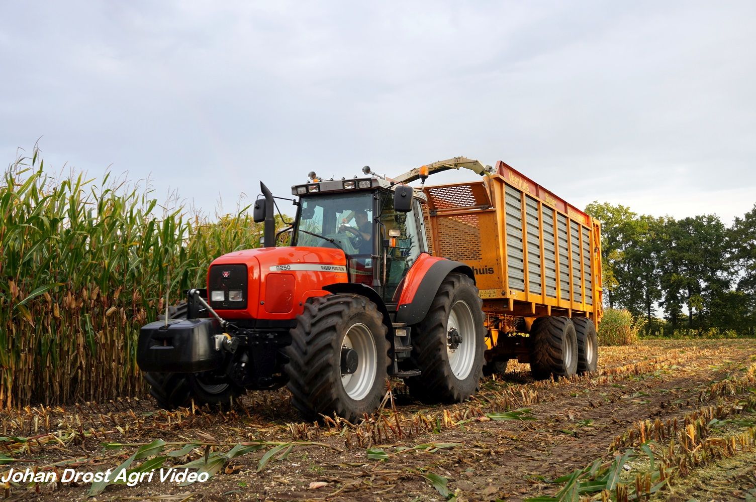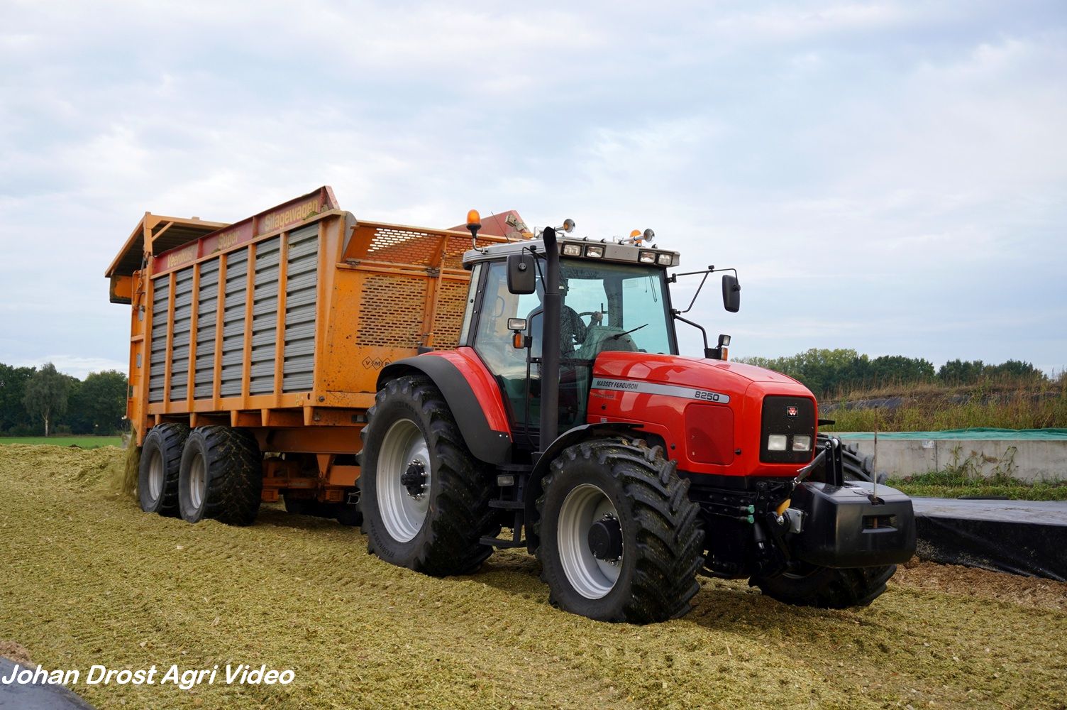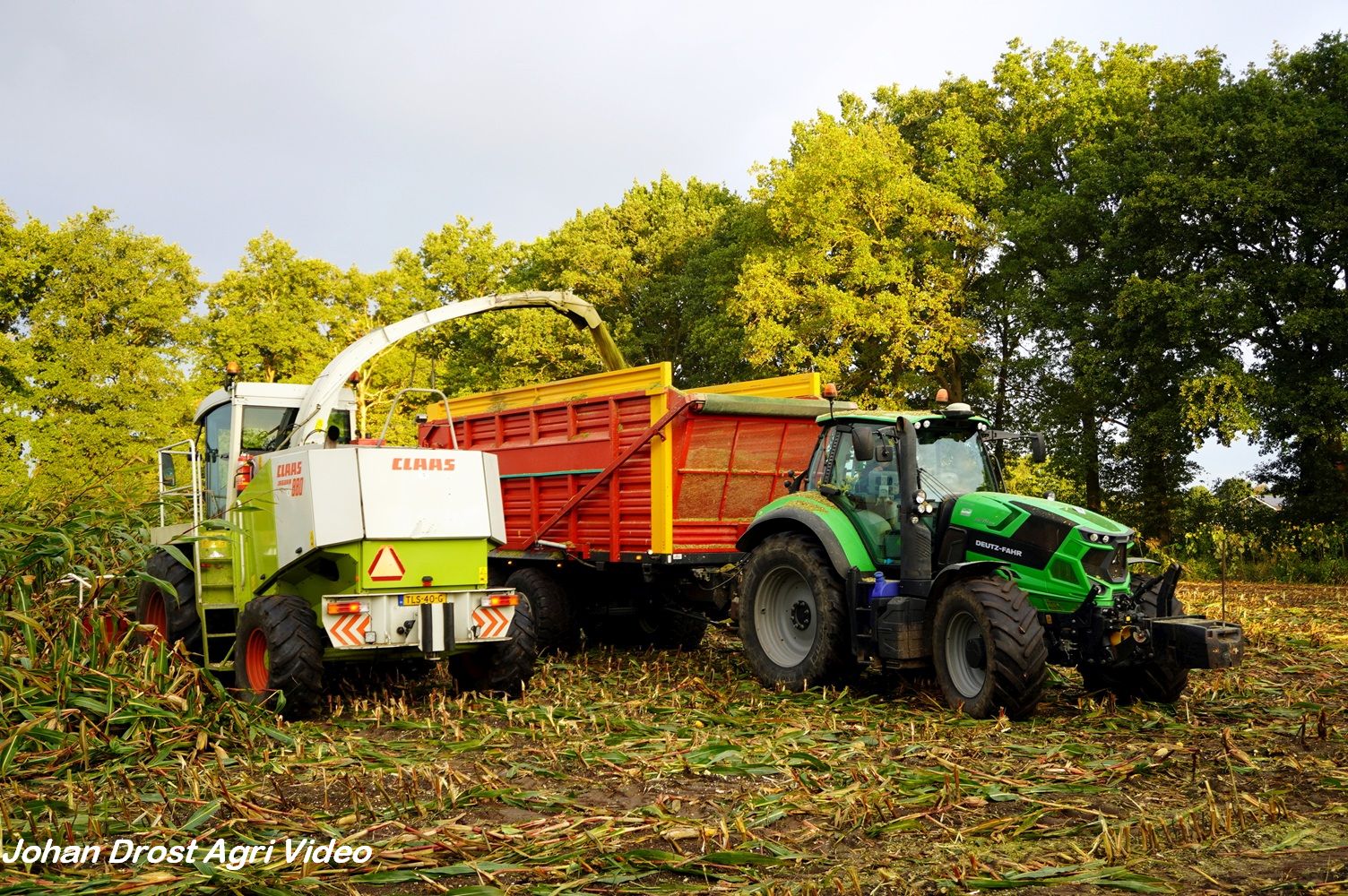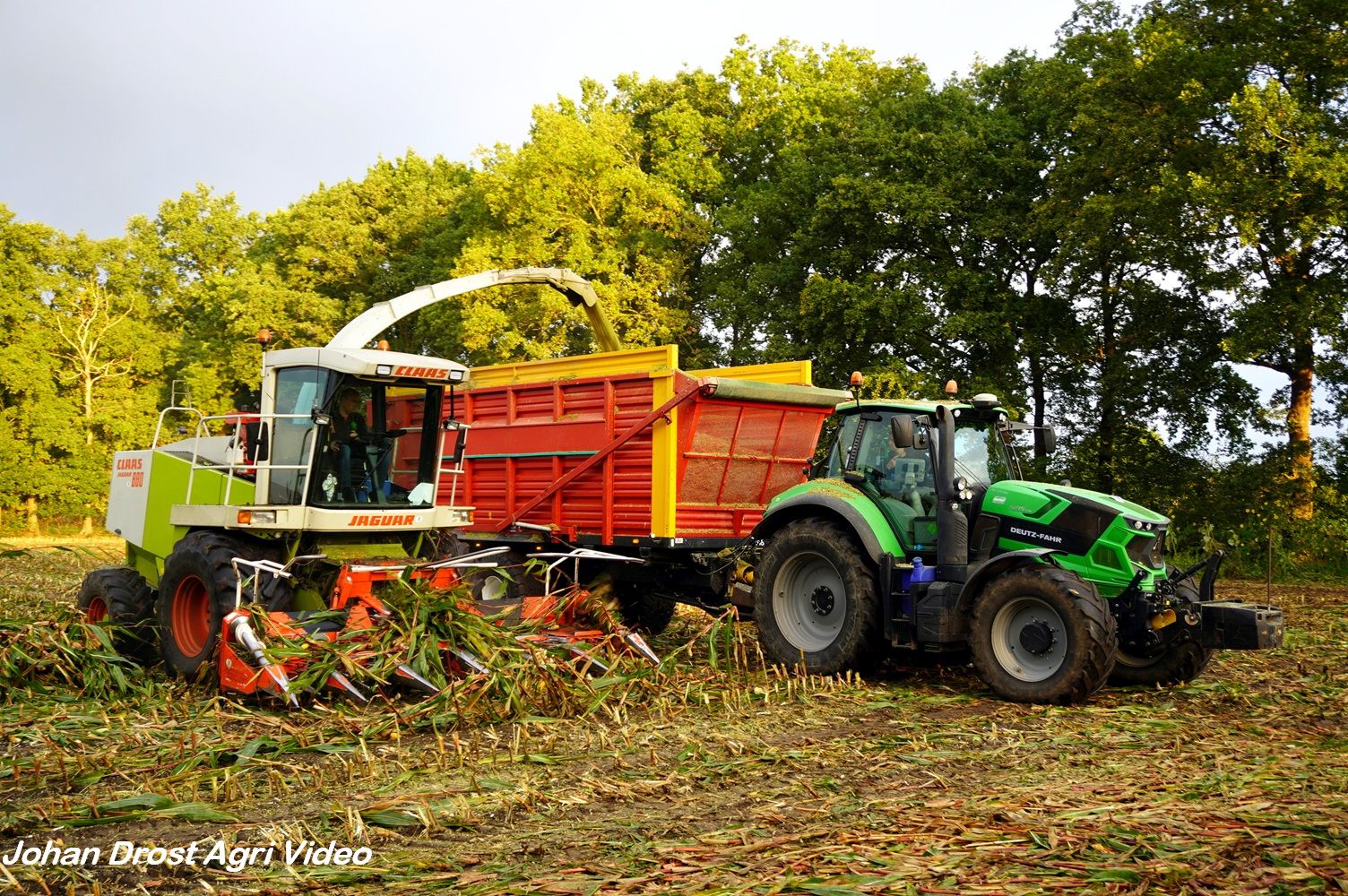 Agrarische Dienstverlening Ten Voorde uit Beemte-Broekland aan het maïs hakselen met een Claas Jaguar 880, Massey Ferguson 8250 met Veenhuis en Deutz-Fahr Agrotron 6215 met Schuitemaker. Op de kuil een Ahlmann AZ 150.
