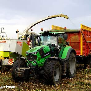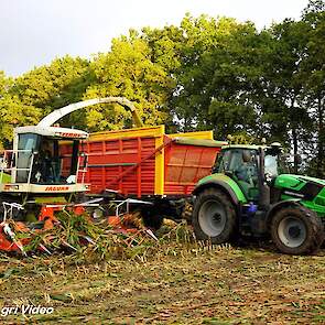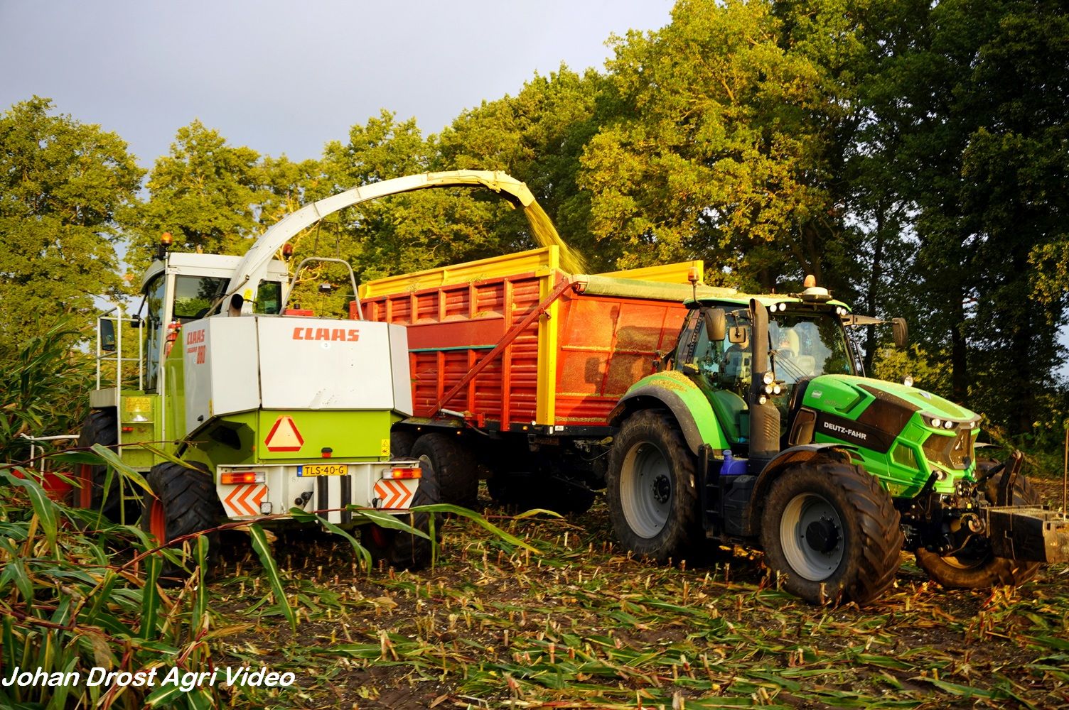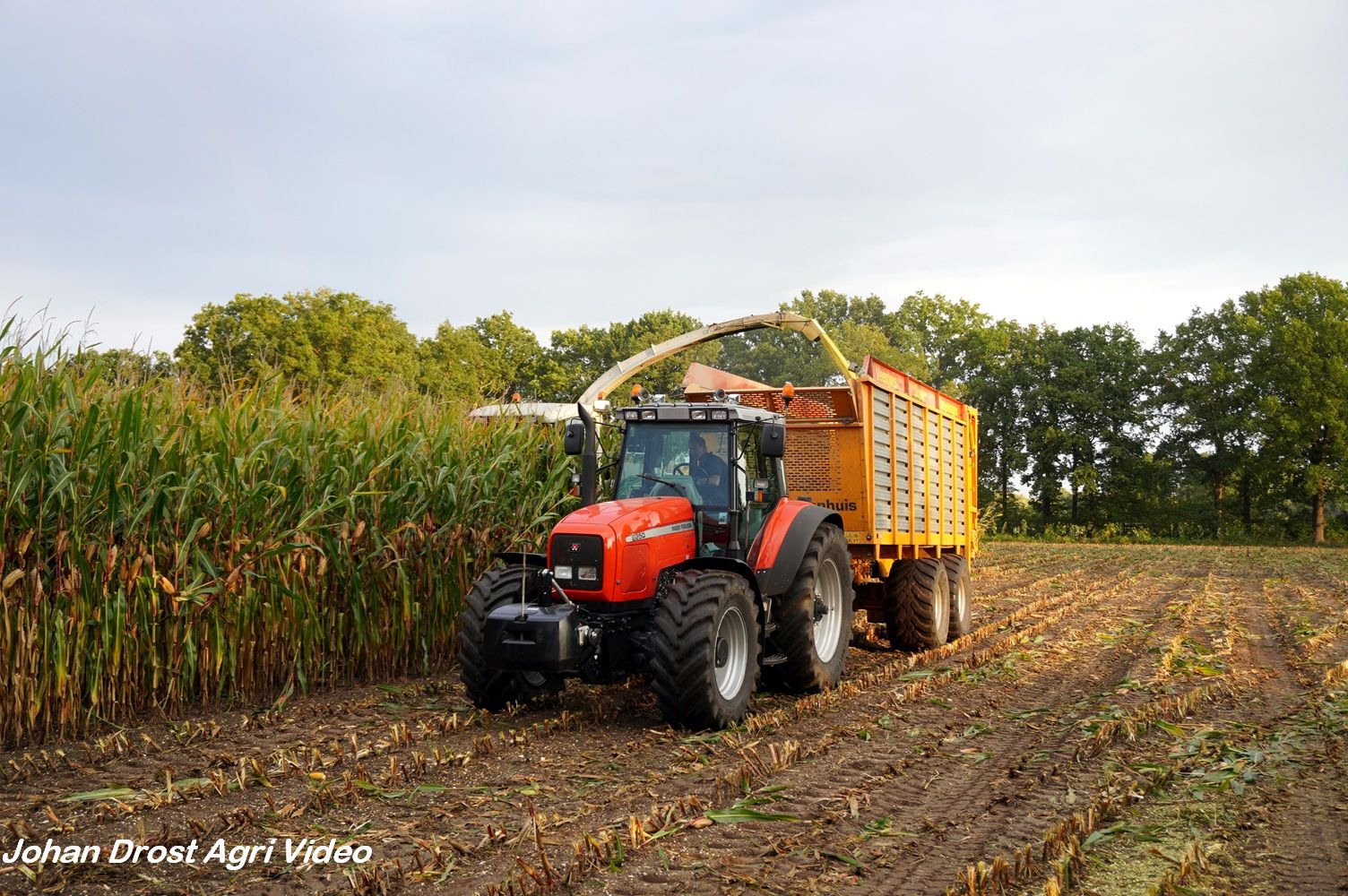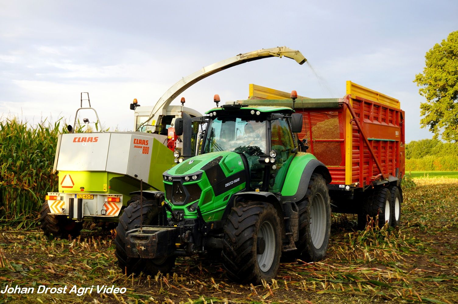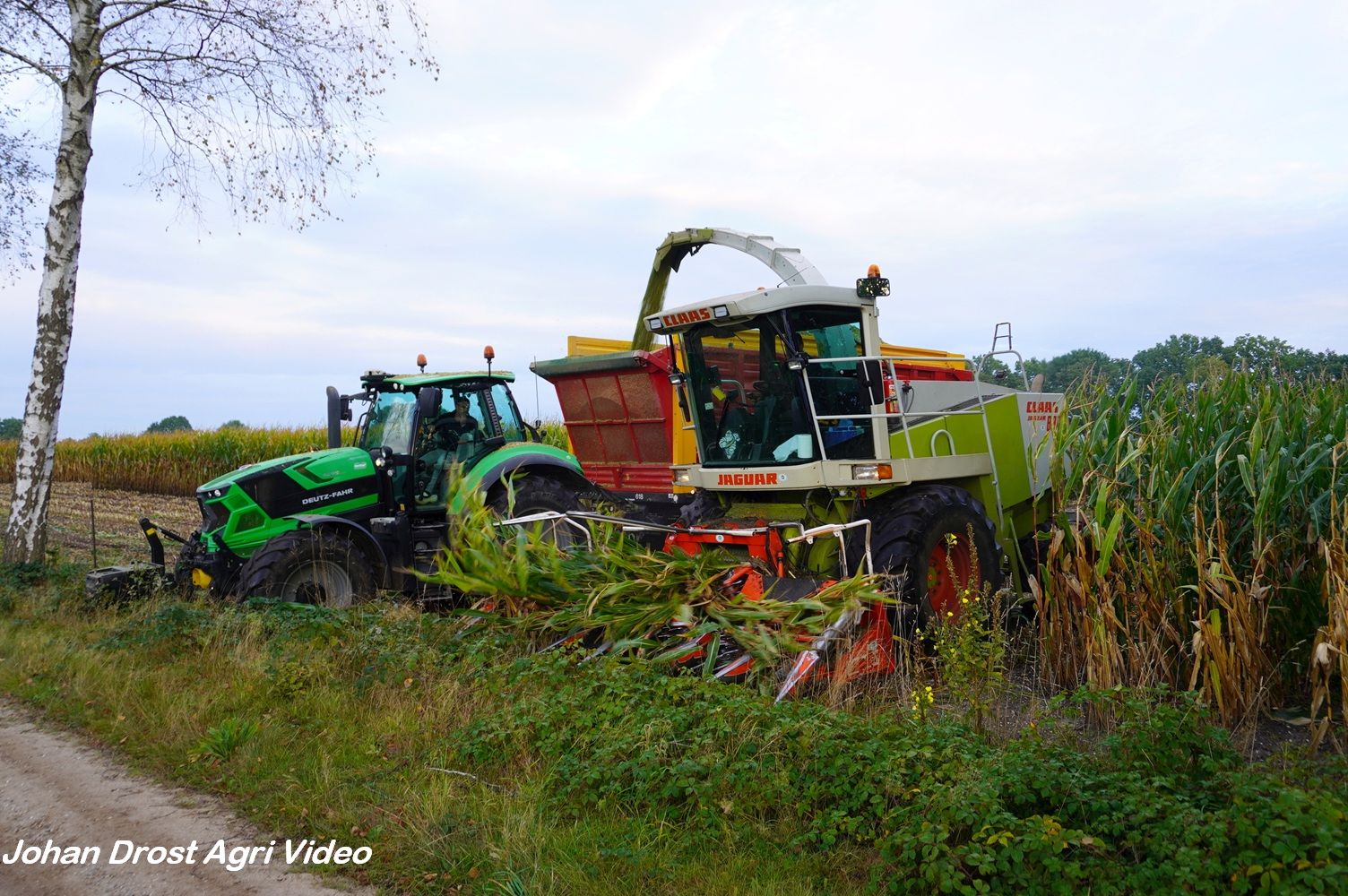 Agrarische Dienstverlening Ten Voorde uit Beemte-Broekland aan het maïs hakselen met een Claas Jaguar 880, Massey Ferguson 8250 met Veenhuis en Deutz-Fahr Agrotron 6215 met Schuitemaker. Op de kuil een Ahlmann AZ 150.