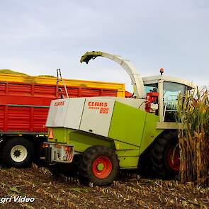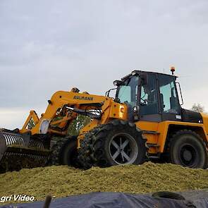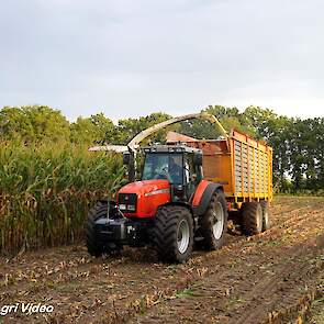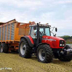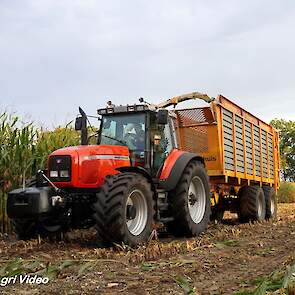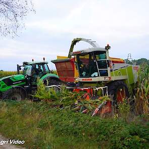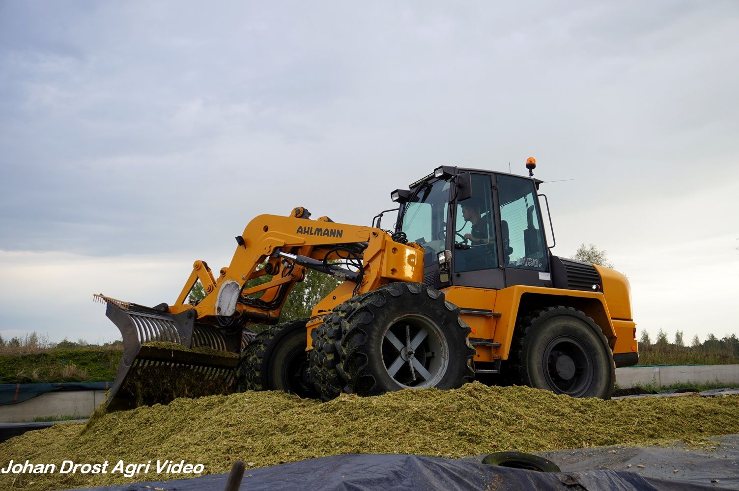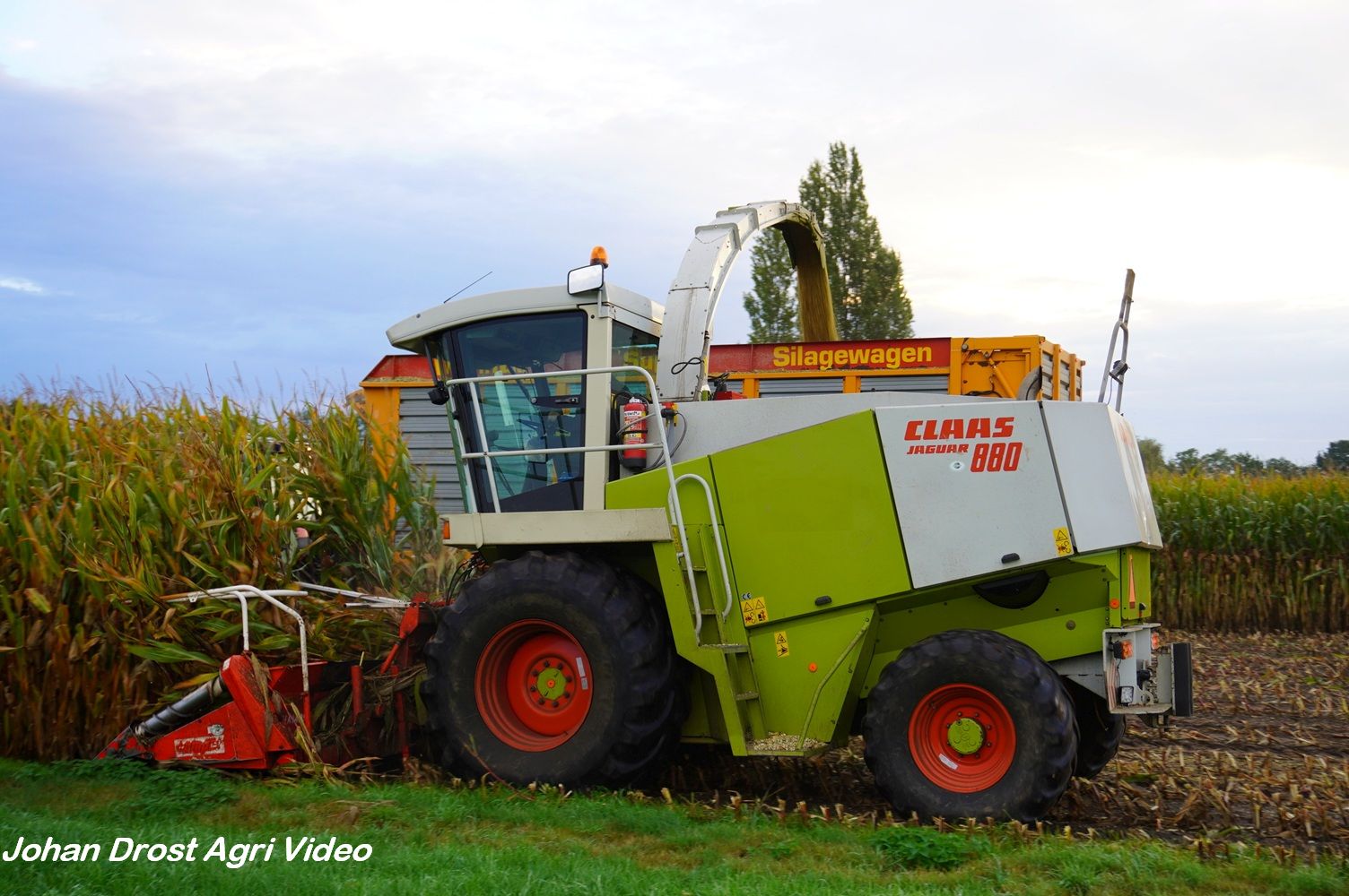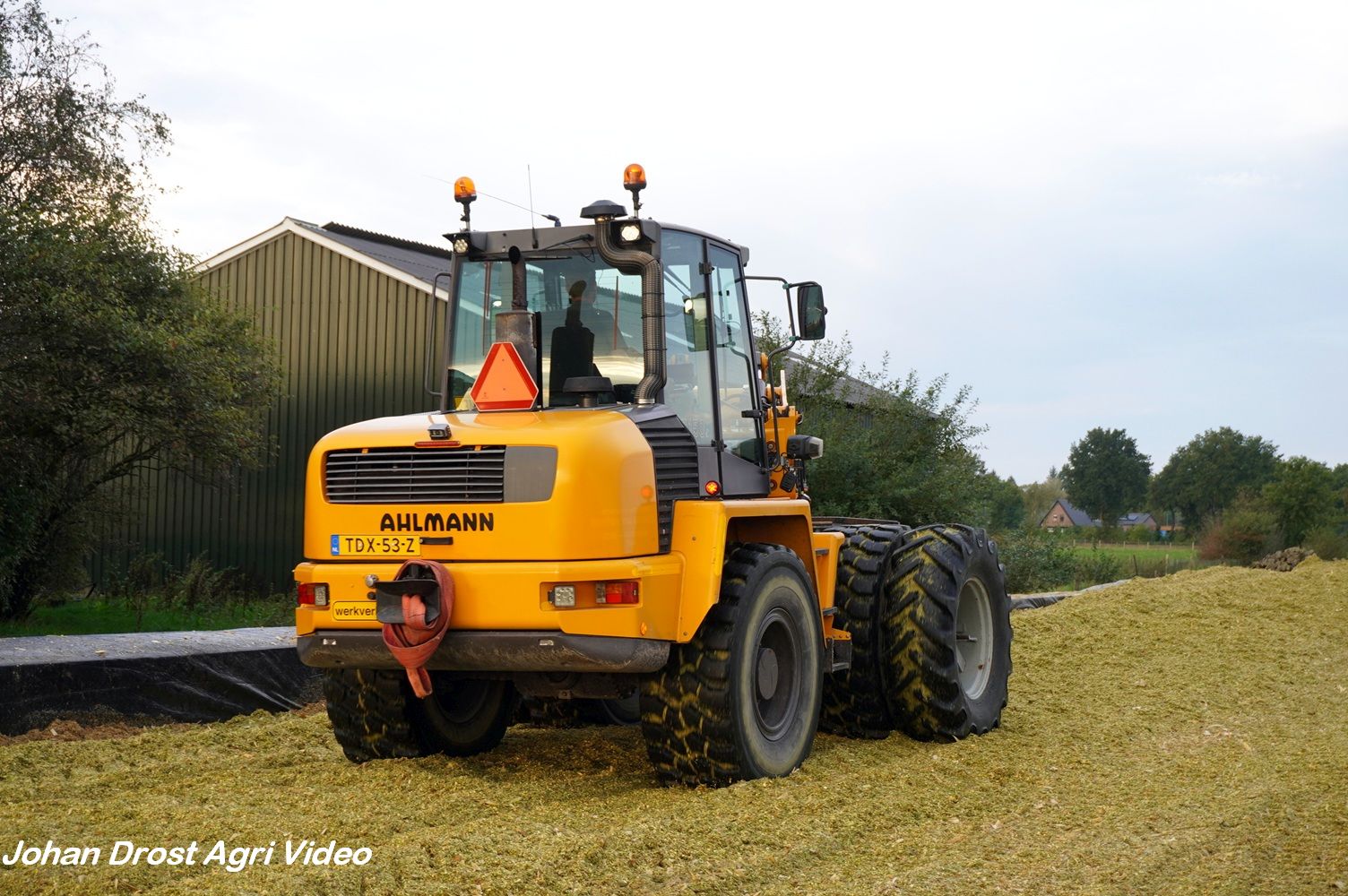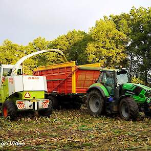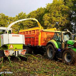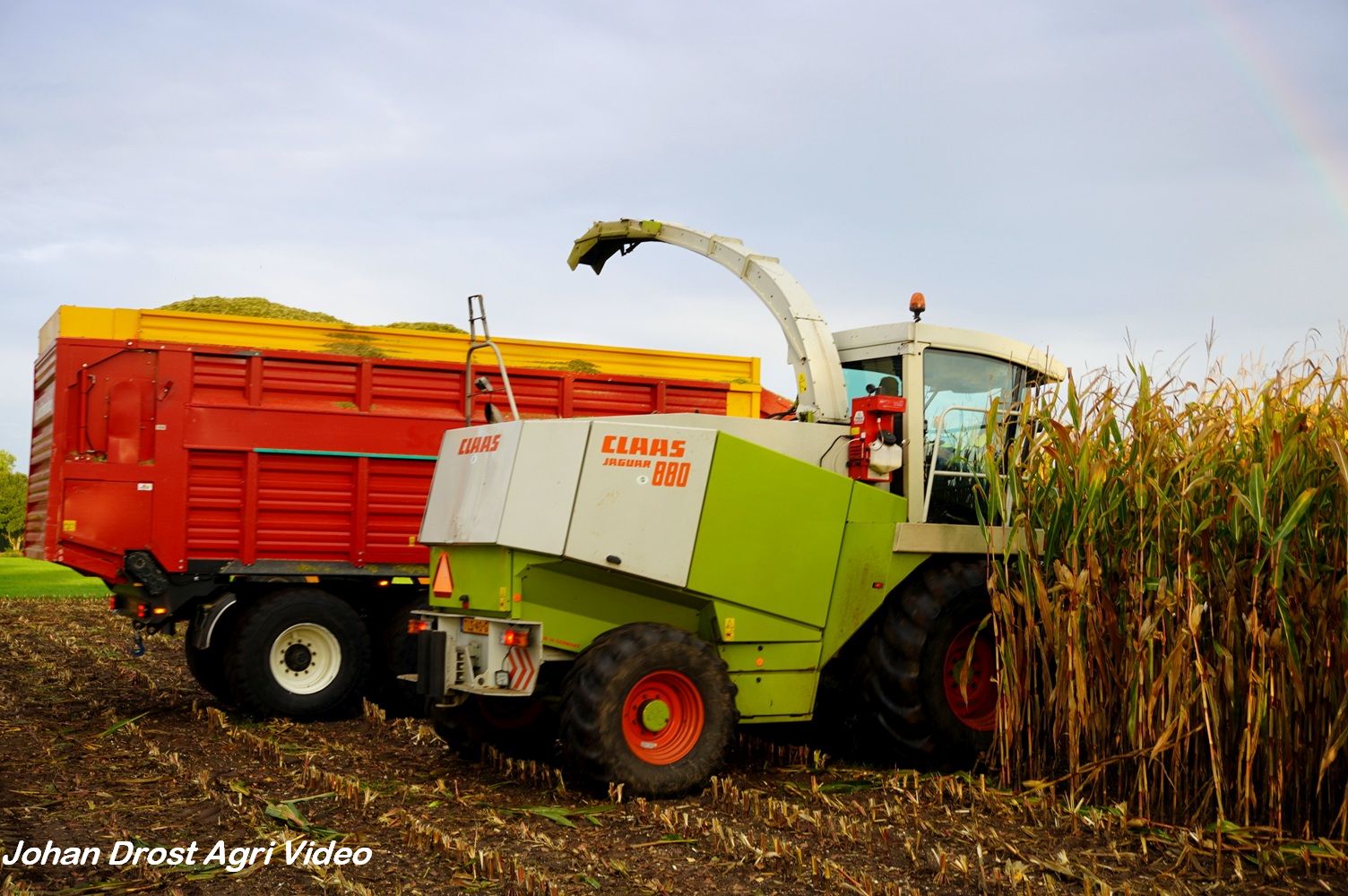 Agrarische Dienstverlening Ten Voorde uit Beemte-Broekland aan het maïs hakselen met een Claas Jaguar 880, Massey Ferguson 8250 met Veenhuis en Deutz-Fahr Agrotron 6215 met Schuitemaker. Op de kuil een Ahlmann AZ 150.