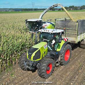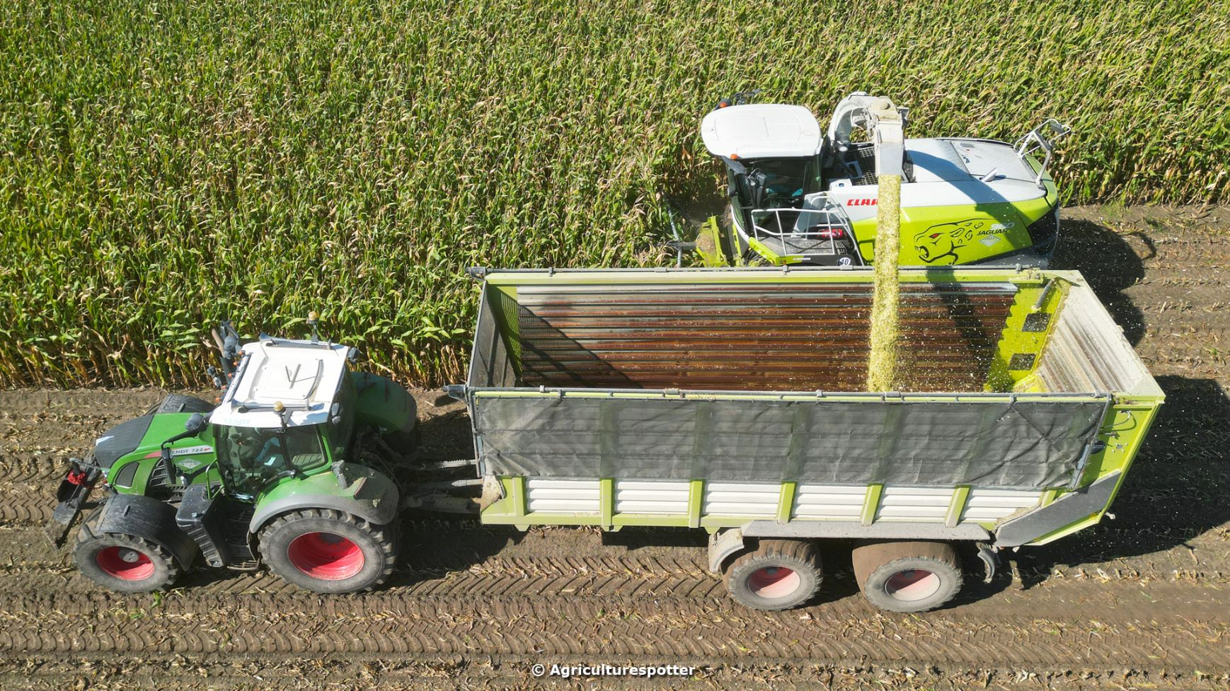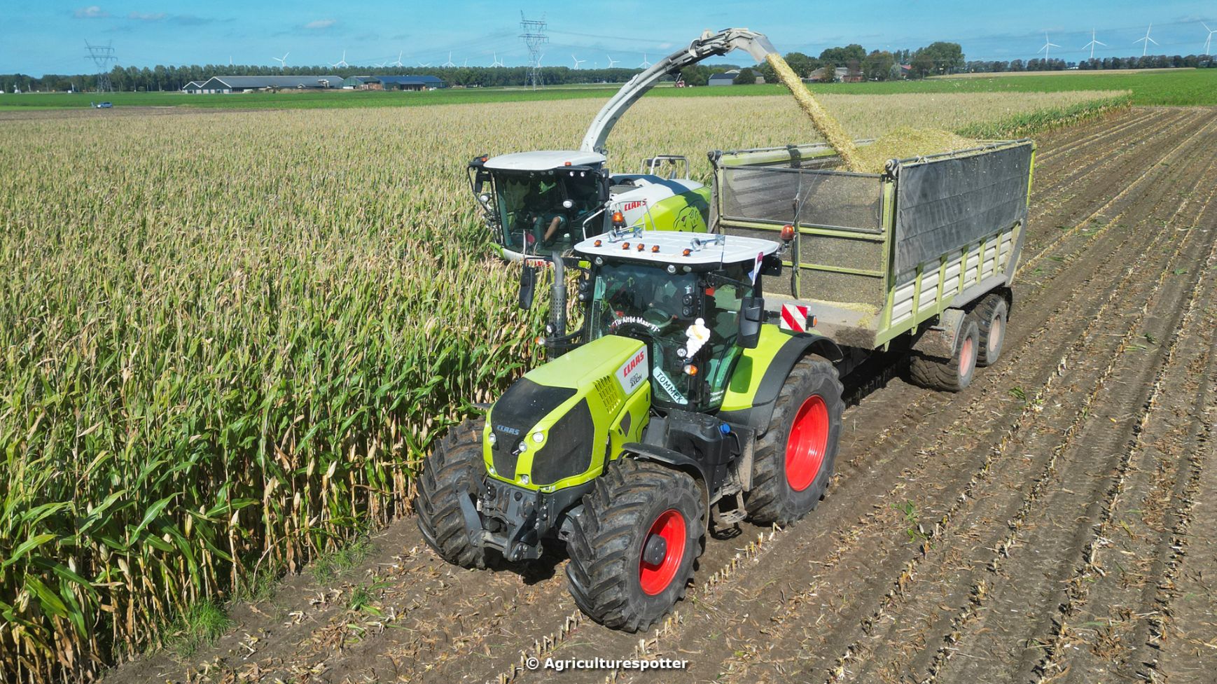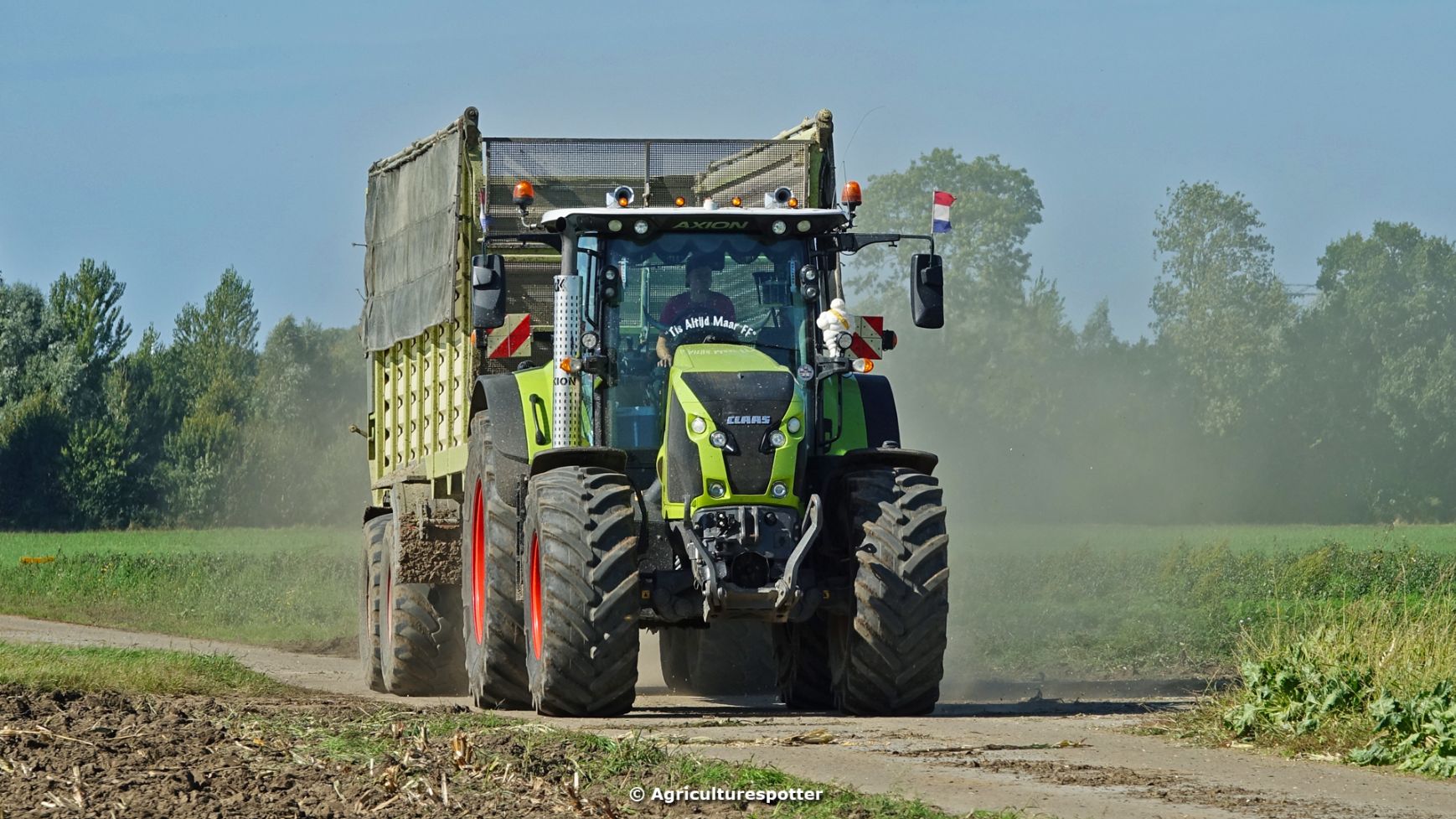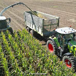 Maïs hakselen met een Claas Jaguar 960 van akker-/ loonbedrijf B. Hut uit Zeewolde. Het transport werd gedaan met een Fendt 722 Vario en een Claas Axion 830 met Kaweco Radium-silagewagens. De kuil werd aangereden met een Volvo L70H.