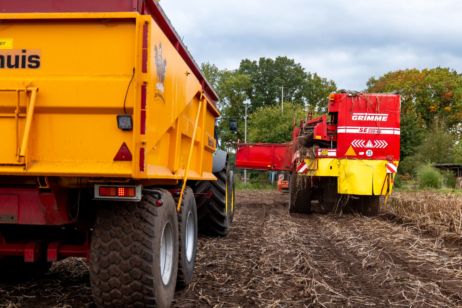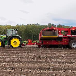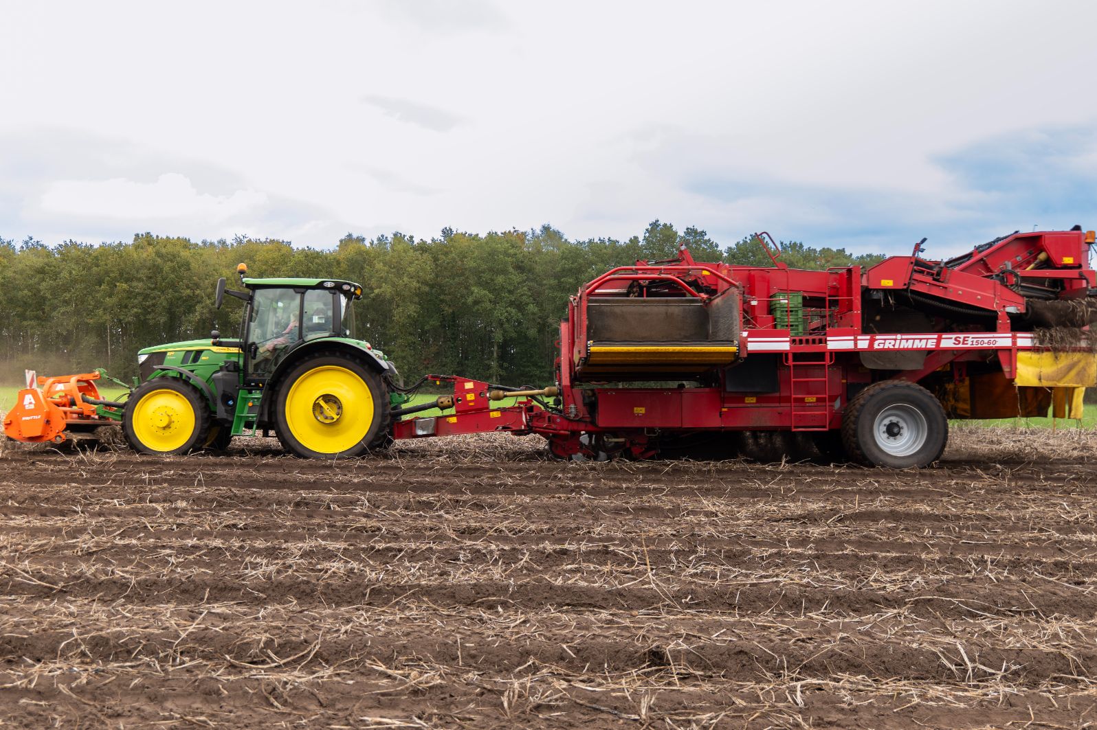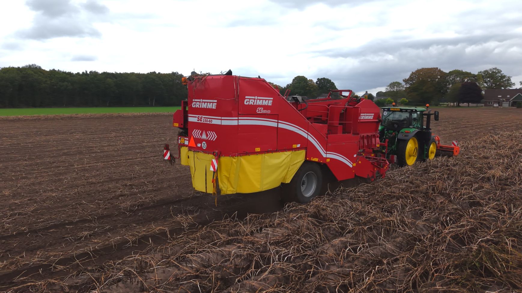 Akkerbouw en pluimveebedrijf Reinders in Bergentheim aan het zetmeelaardappelen rooien voor Avebe met John Deere 6R150 met Shuttle Agrimaster in de fronthef en Grimme SE 150-60-rooimachine.