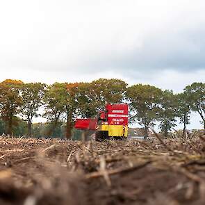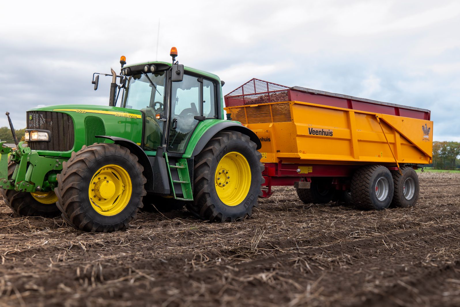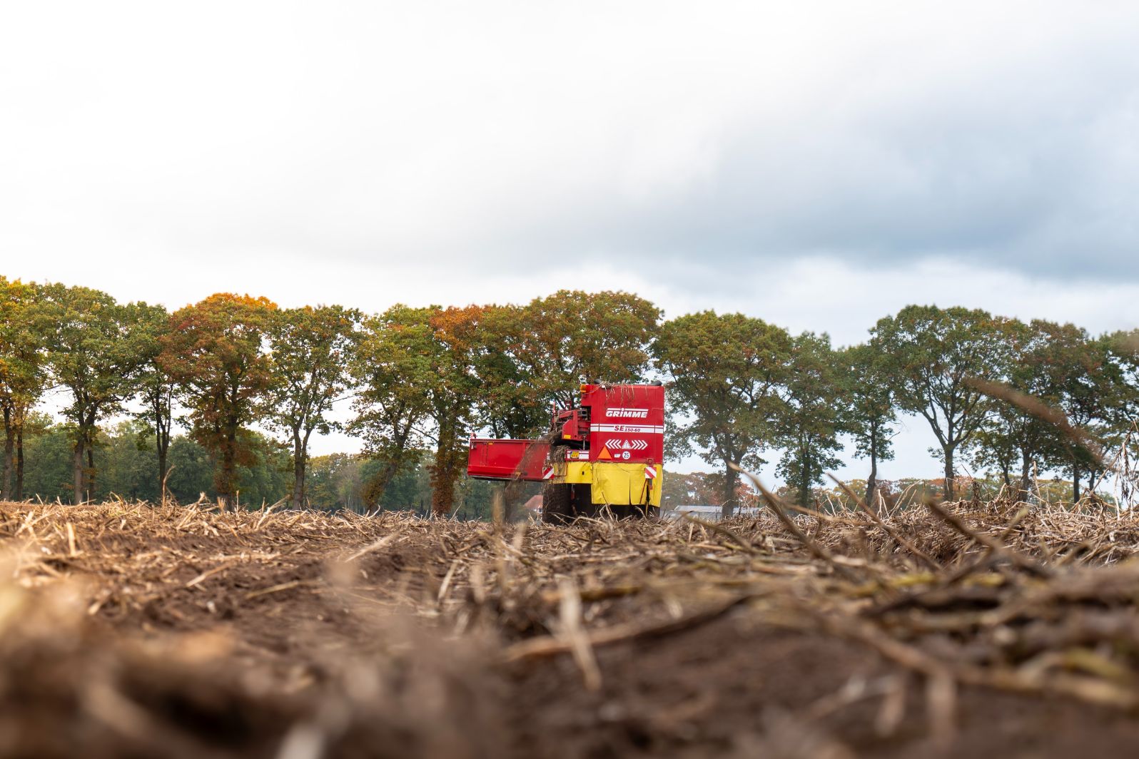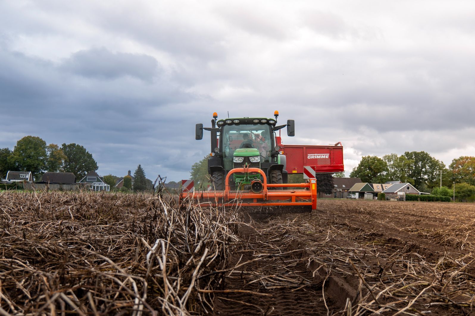 Akkerbouw en pluimveebedrijf Reinders in Bergentheim aan het zetmeelaardappelen rooien voor Avebe met John Deere 6R150 met Shuttle Agrimaster in de fronthef en Grimme SE 150-60-rooimachine.