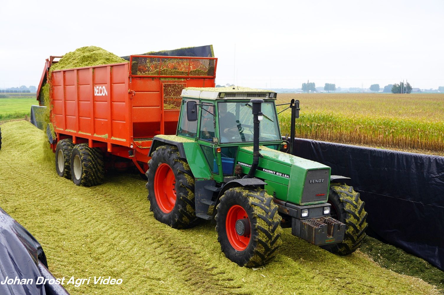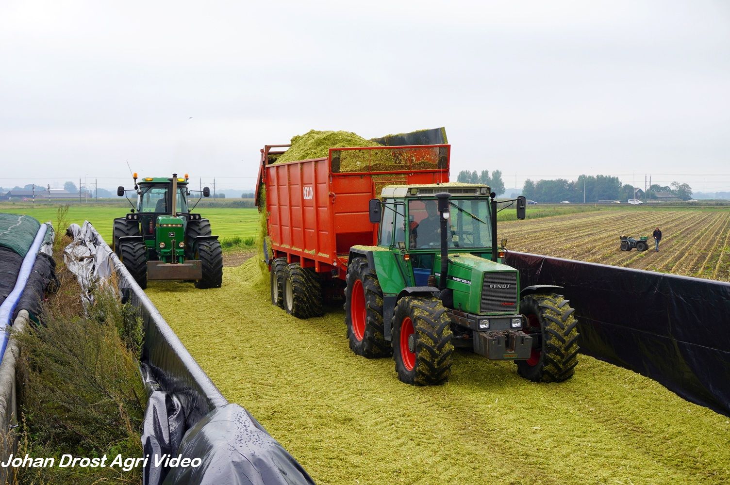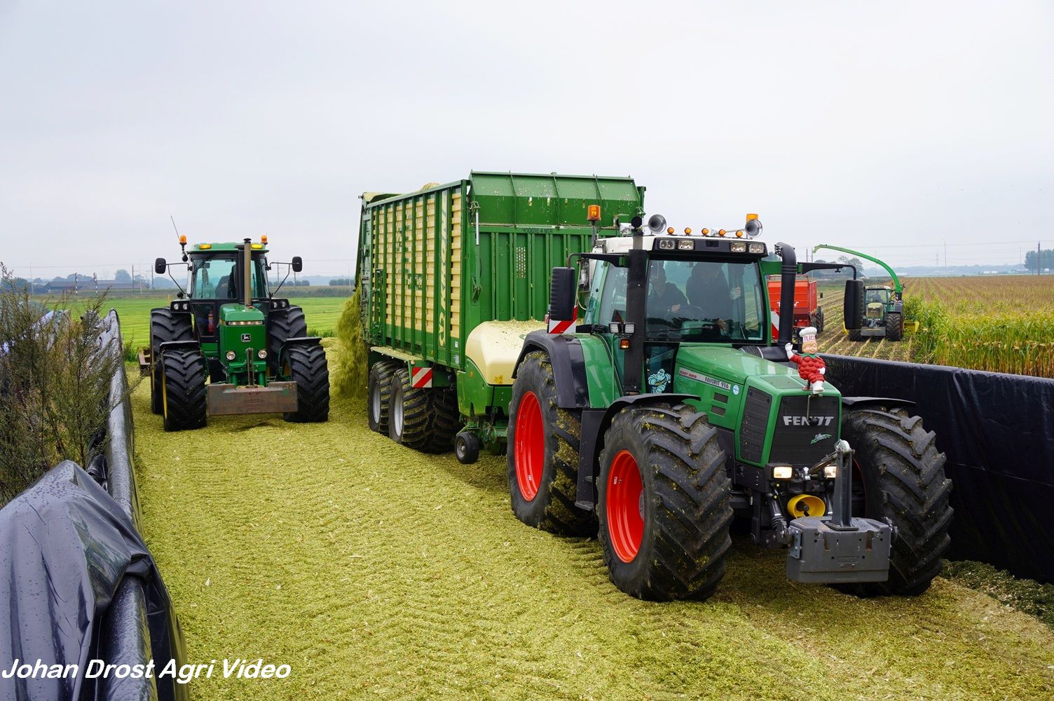 Melkveebedrijf Olieman uit Zalk aan het maïs inkuilen met een John Deere 4450, Fendt Favorit 612 LSA met Decov en Fendt Favorit 916 Vario met Krone.
