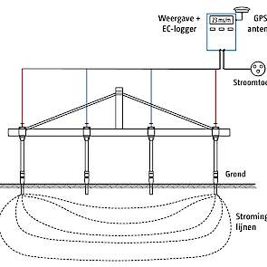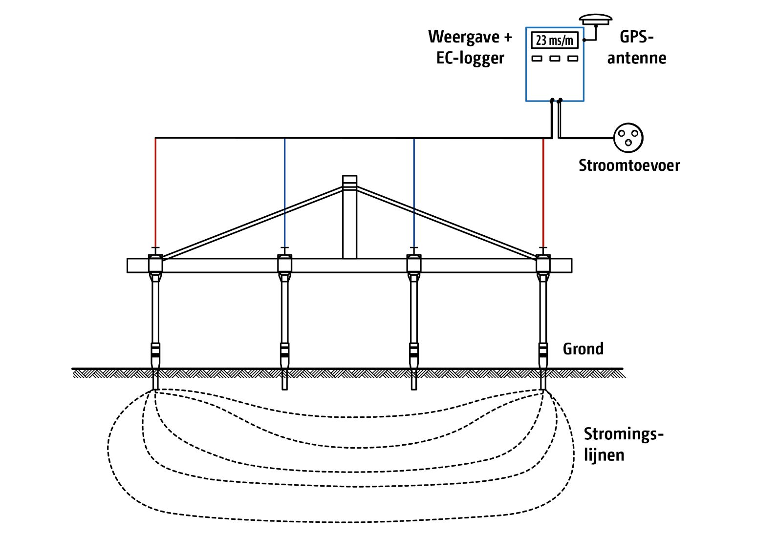 De meetstroom (I) is constant. De meetspanning (U) wordt gemeten. Veranderingen in de meetspanning geven een verandering in de bodemgeleidbaarheid aan.