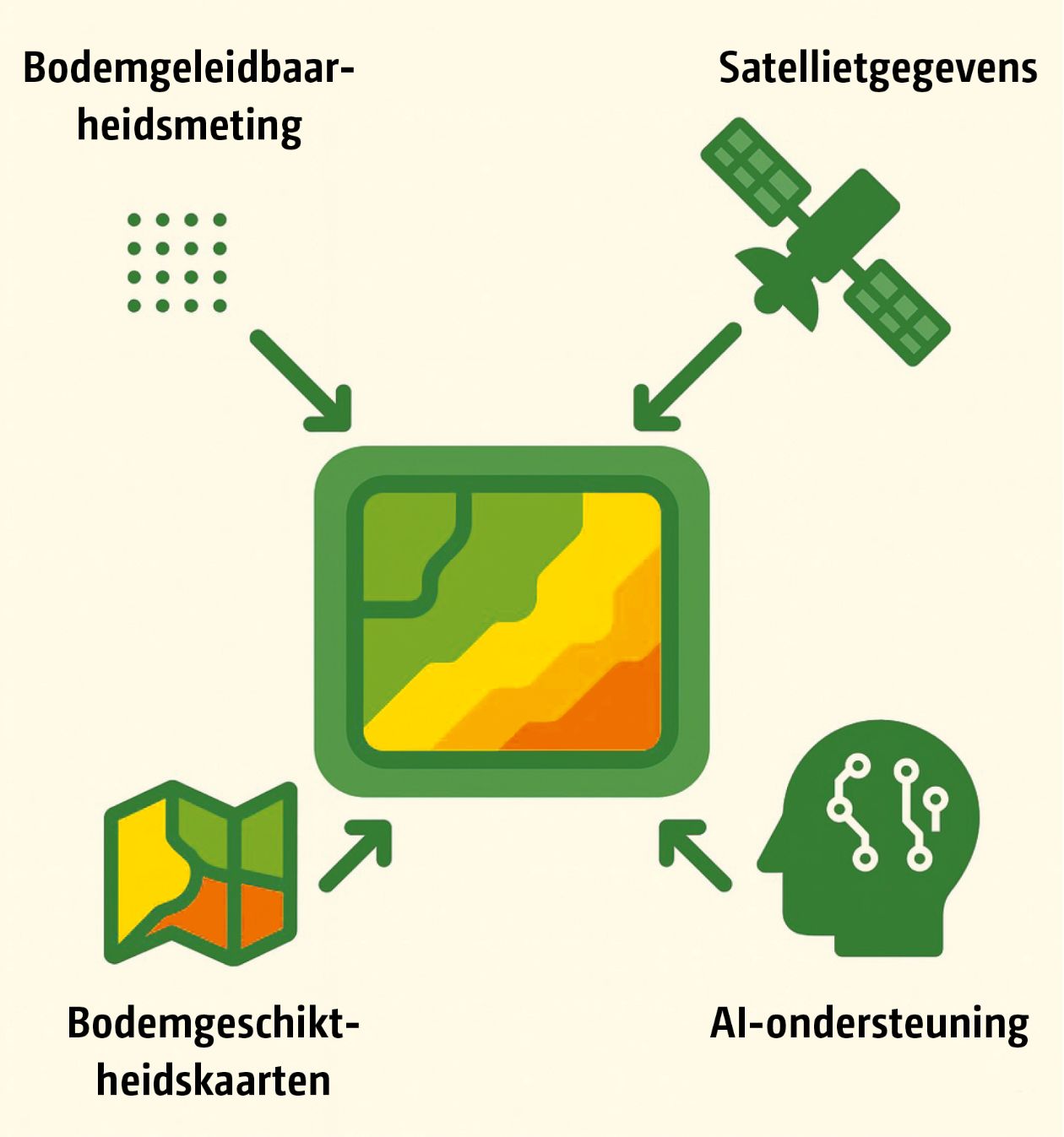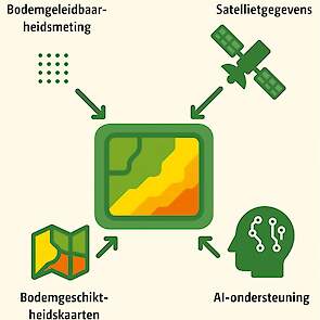 In de volgende stap worden de gegevens uit de geïnterpoleerde geleidbaarheidswaarden, satellietgegevens en bodemgeschiktheidsgegevens van de betreffende regionale instanties samengevoegd.