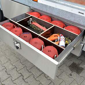 Door de oprijklep eenvoudig op te vouwen kan deze ook gebruikt worden als verlenging van de laadbak. Daarvoor zijn in de klep achterlichten en een verlichte kentekenplaat aangebracht. Twee uitneembare steunen zorgen voor een degelijke borging van deze velenging. Verder is de Scania voorzien van zowel een kogelkoppeling als een vangmuil, waardoor ook aanhangwagens meegenomen kunnen worden. De opbouw is voorzien van diverse rvs kisten voor het opbergen van ladingzekering materiaal. Verder zijn er talloze rongpotten en sjorogen aangebracht waardoor iedere lading op een veilige wijze vervoerd kan worden. Verder is in het kopschot een elektrische lier aangebracht.