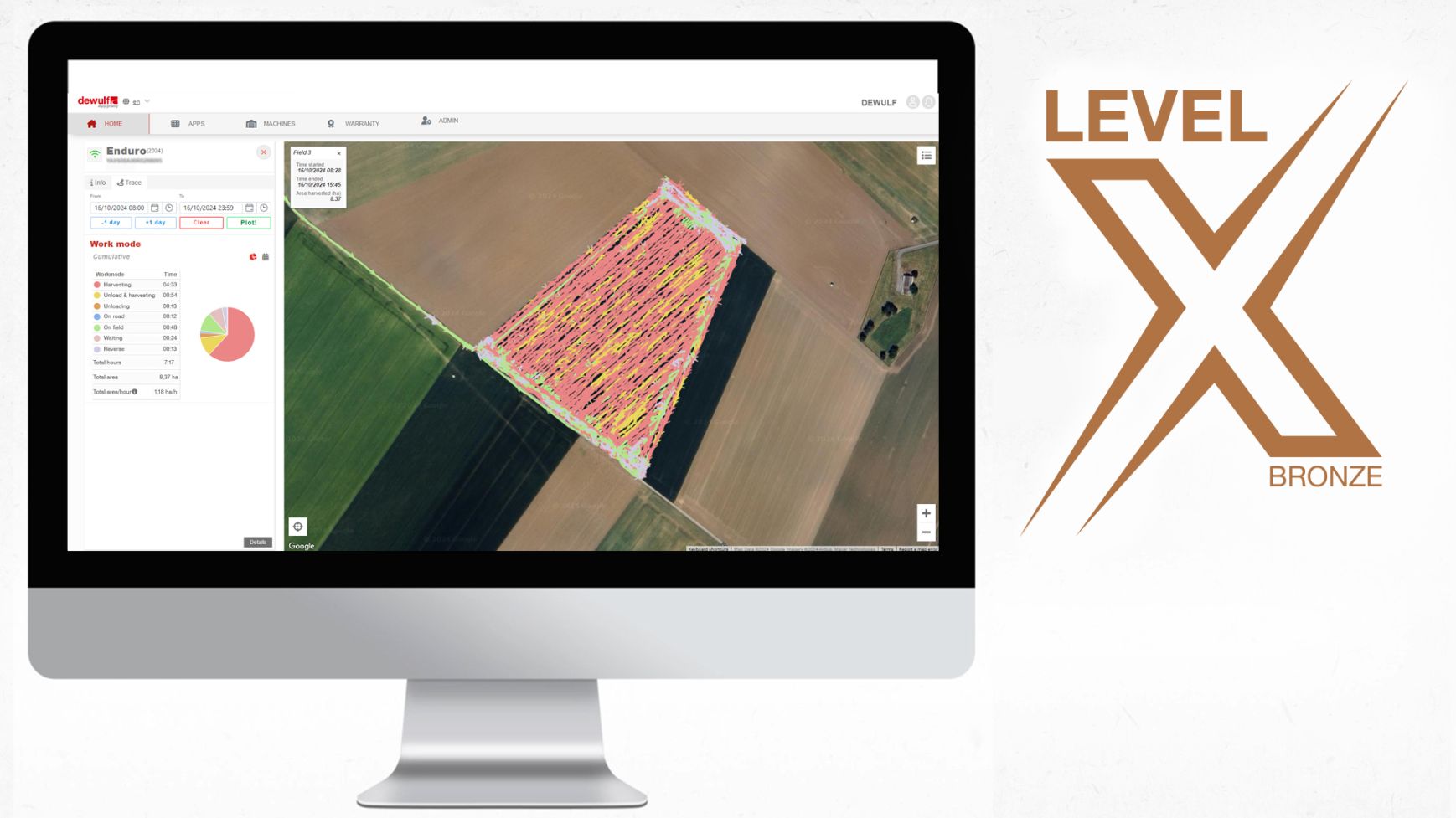 • Gegevens per veld: geoogste oppervlakte, productiviteit (ha/u). Deze data zorgen voor een helder overzicht van de prestaties en ondersteunen een nauwkeurige opvolging en optimalisatie van het rooiproces. Het bronzen Level X-pakket vormt het fundament voor verdere automatisatie, en geeft zowel eindgebruikers als dealers nieuwe inzichten om efficiëntie en uptime te maximaliseren.
