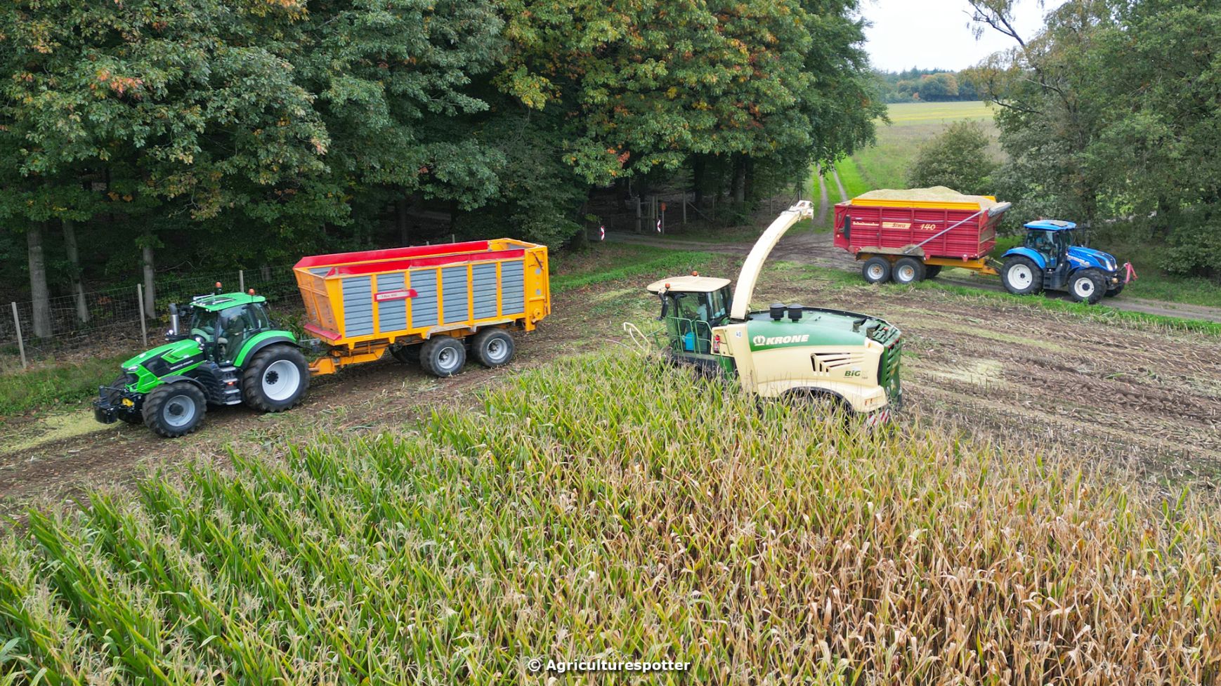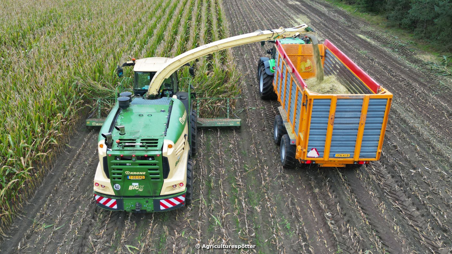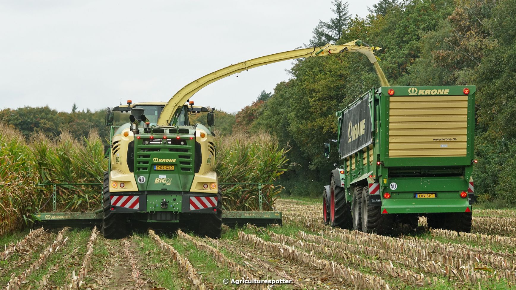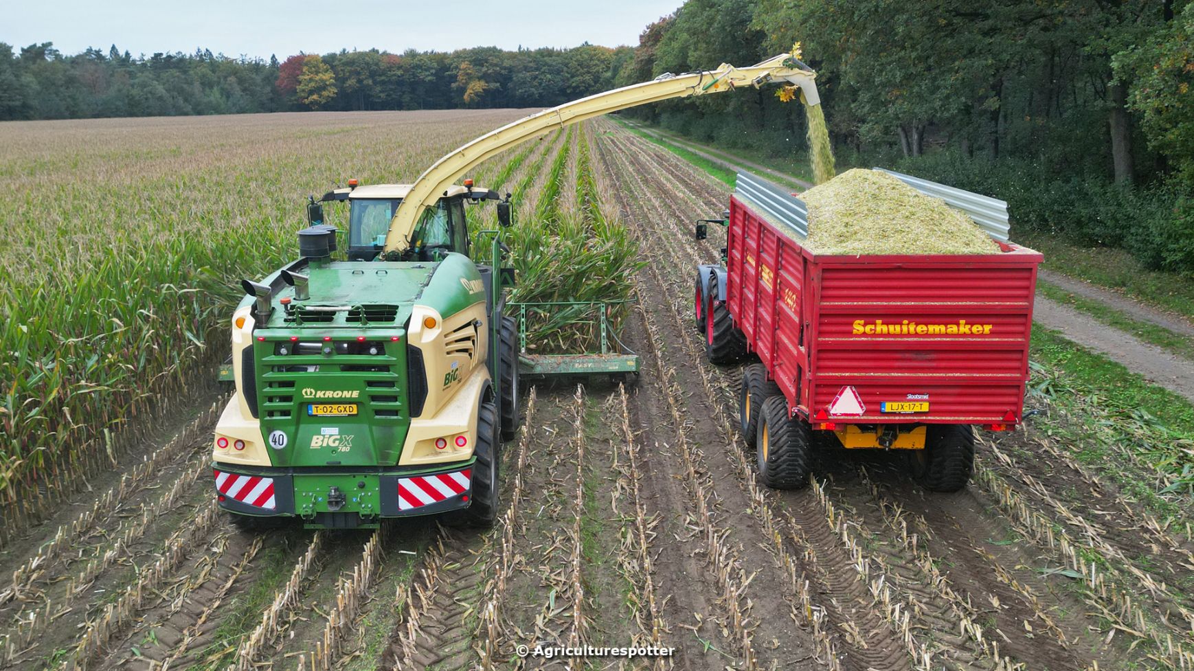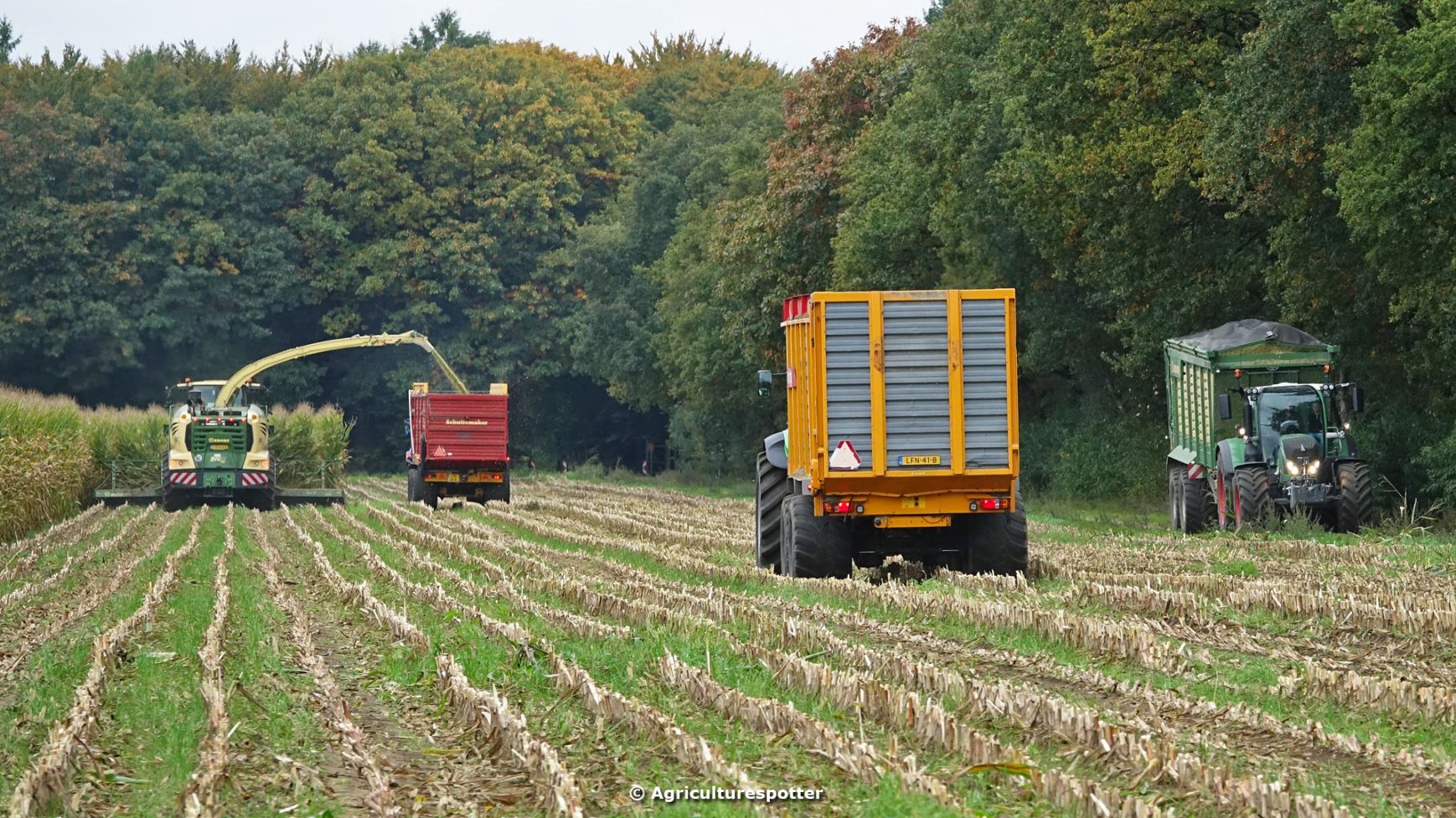 Maïs hakselen in Nieuw-Milligen met een Krone BiG X 780 met een EasyCollect 750-2 10-rijige maïsbek van KWB Agri. Het transport werd gedaan met vele verschillende Fendt- en Deutz-Fahr-tractoren.