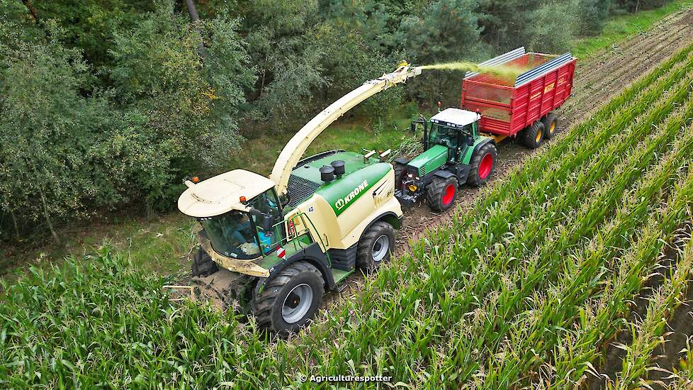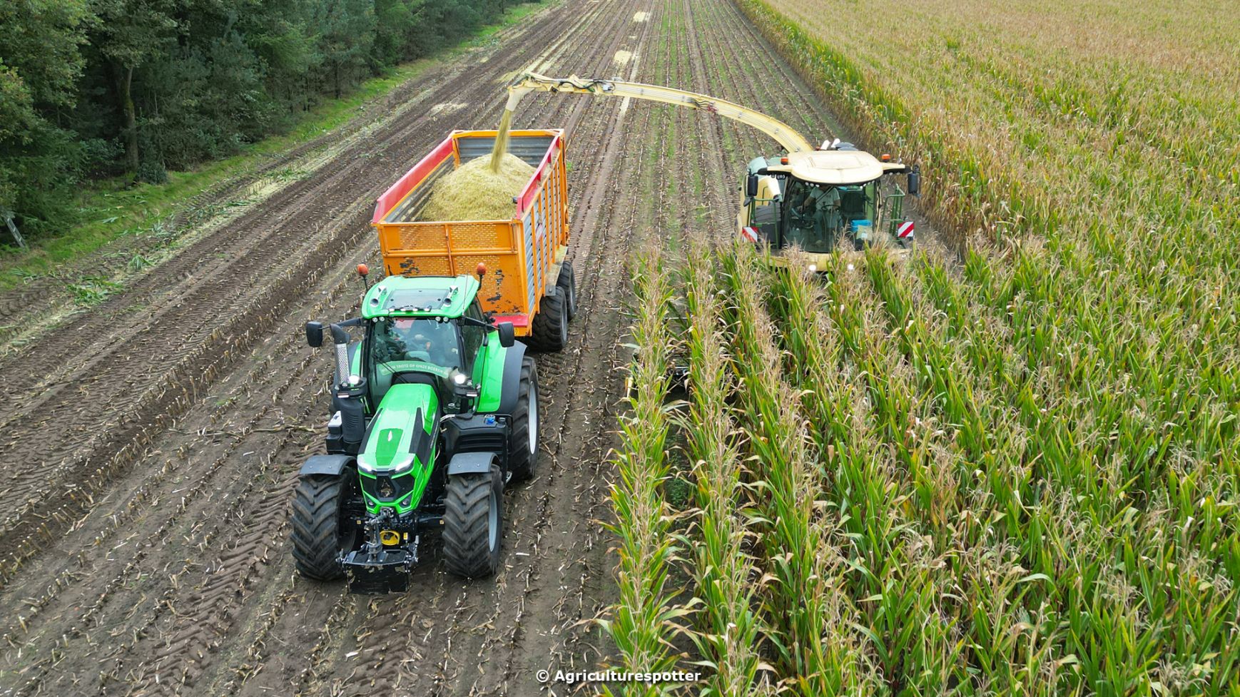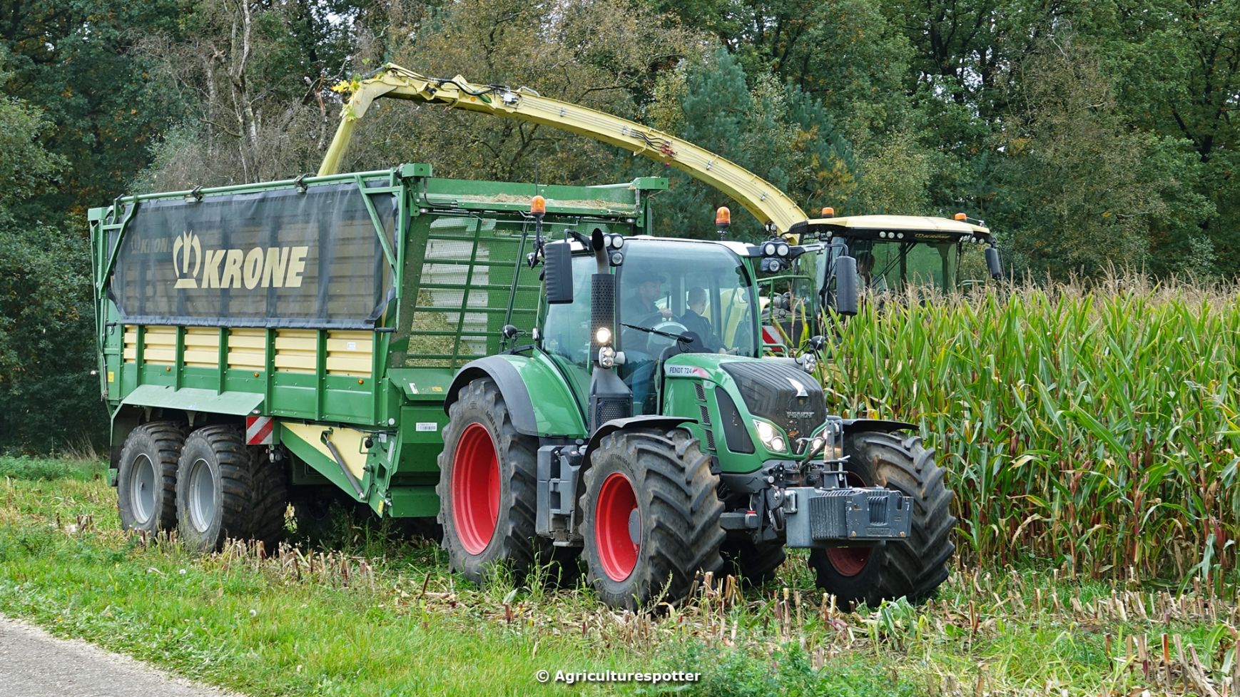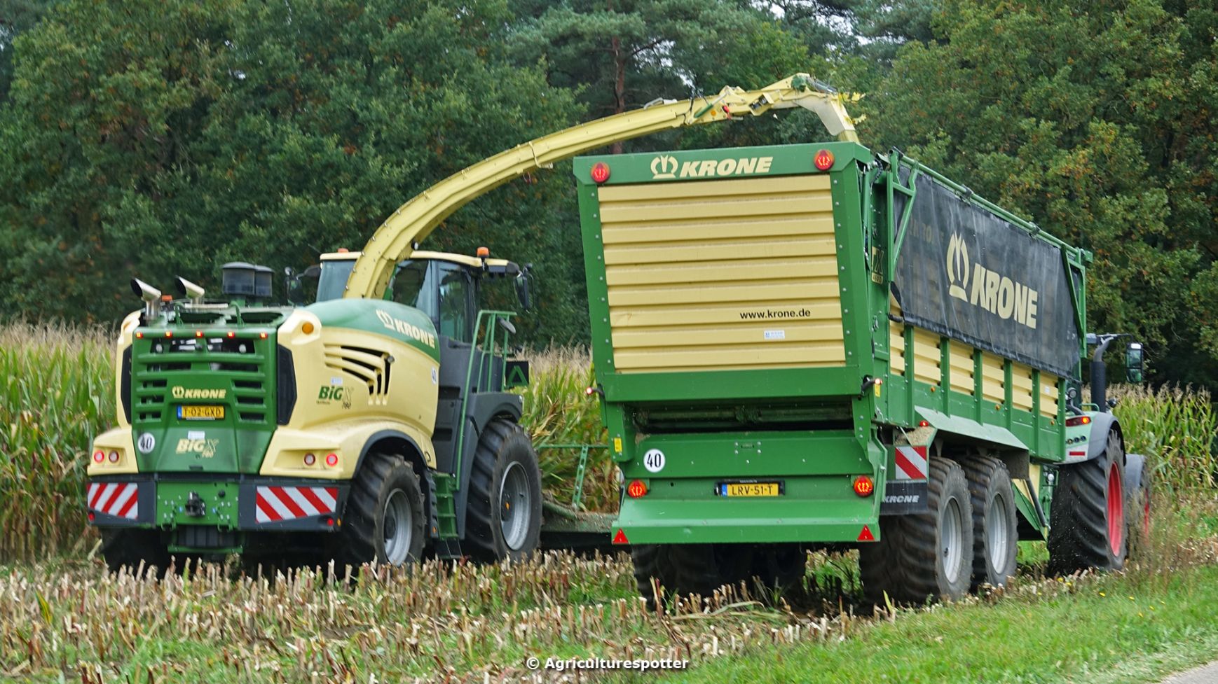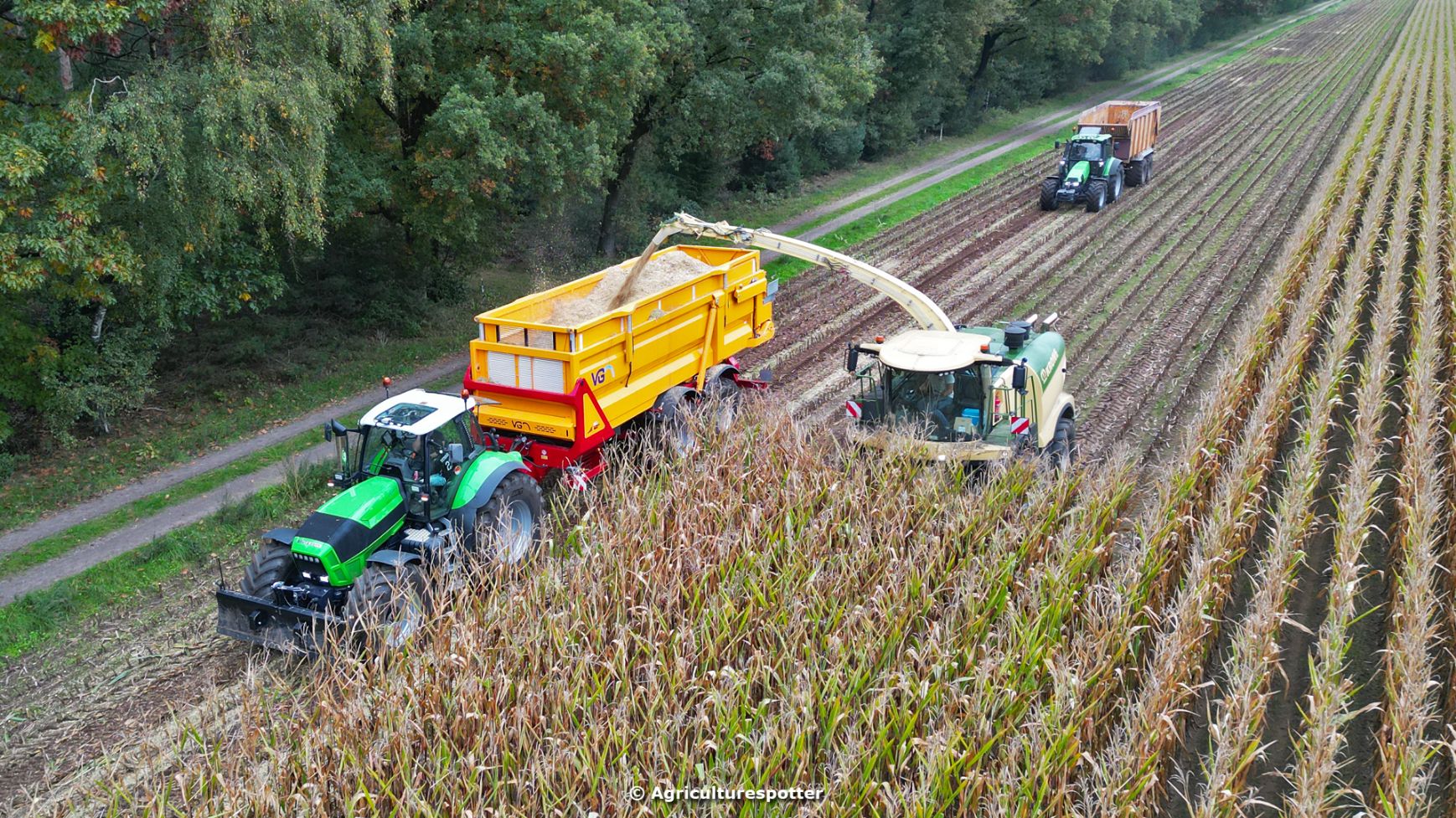 Maïs hakselen in Nieuw-Milligen met een Krone BiG X 780 met een EasyCollect 750-2 10-rijige maïsbek van KWB Agri. Het transport werd gedaan met vele verschillende Fendt- en Deutz-Fahr-tractoren.