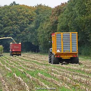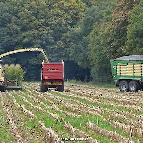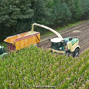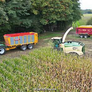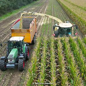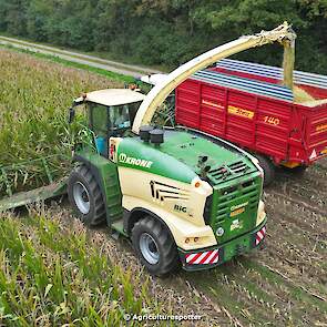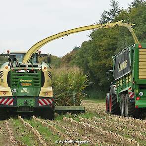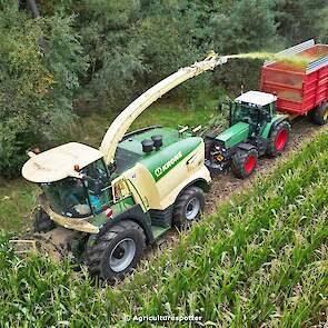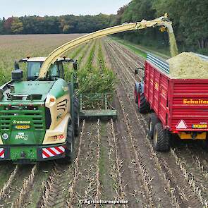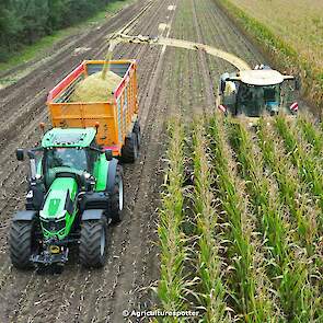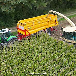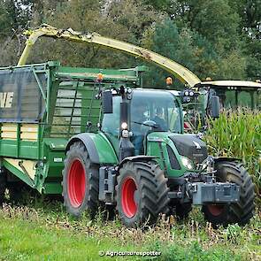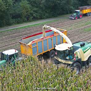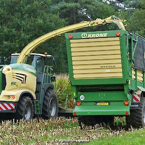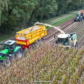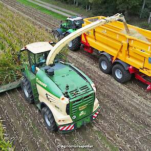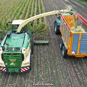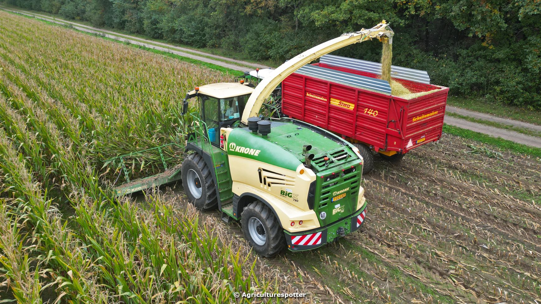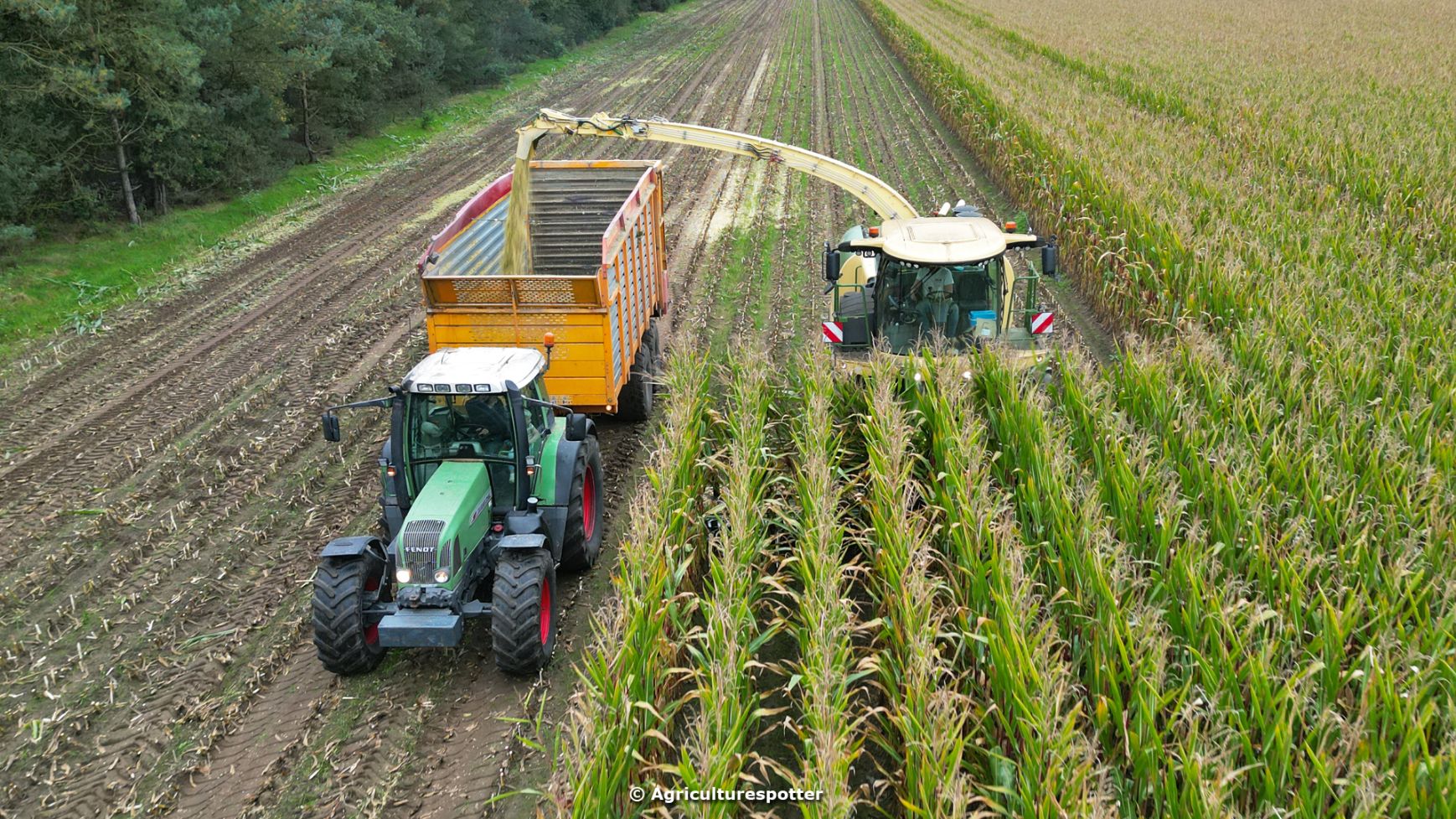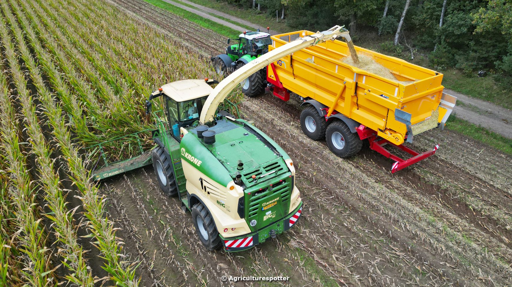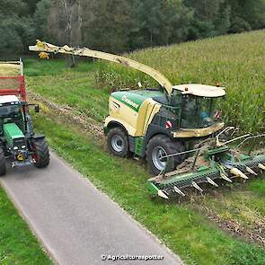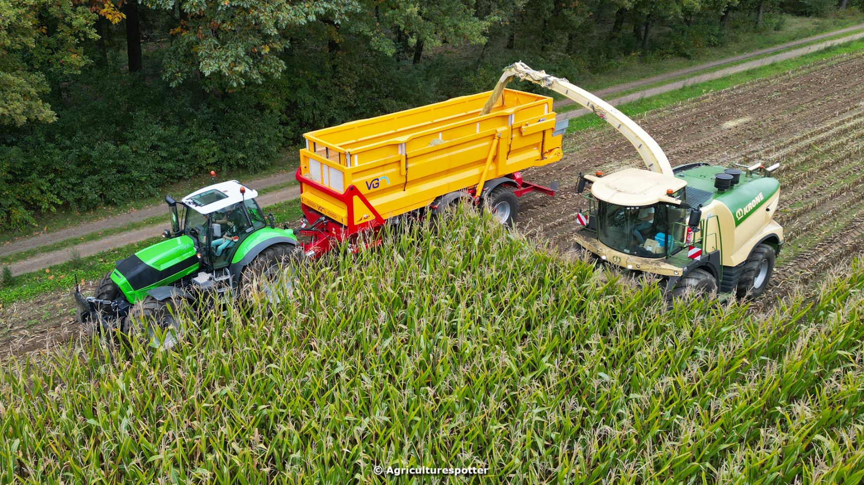 Maïs hakselen in Nieuw-Milligen met een Krone BiG X 780 met een EasyCollect 750-2 10-rijige maïsbek van KWB Agri. Het transport werd gedaan met vele verschillende Fendt- en Deutz-Fahr-tractoren.