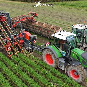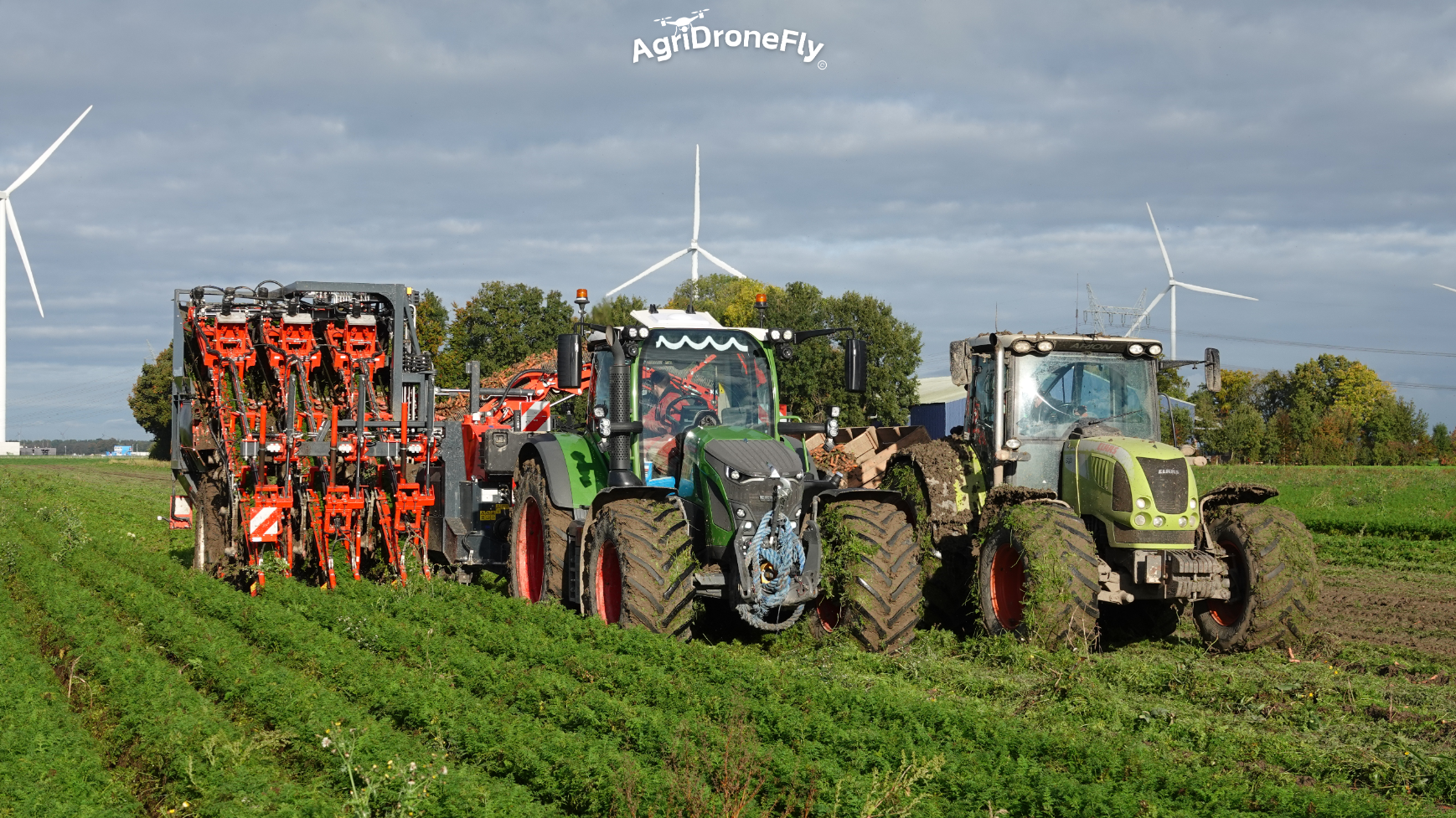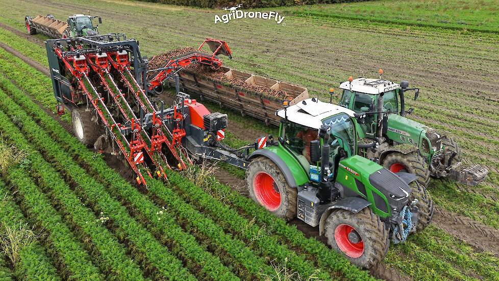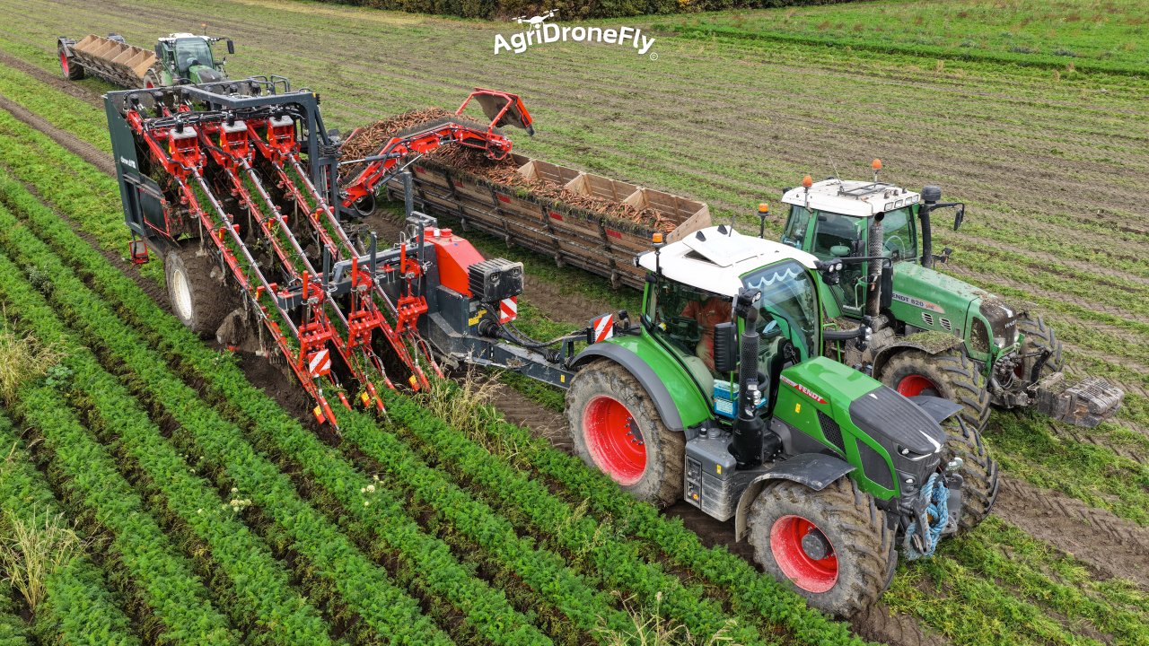 Blitterswijk Agro aan het wortels rooien met hun Fendt 620 Vario met nieuwe 3-rijige Dewulf GK3-klembandrooier. De wortels worden door een Claas Arion 640, Fendt 820 Vario en Fendt 516 Vario naar het erf gereden, met erachter een kantel kistenwagen van Ruijter Machines die zes kisten kan meenemen.