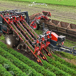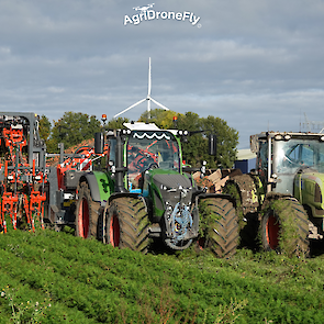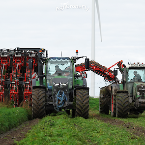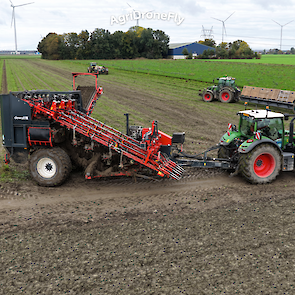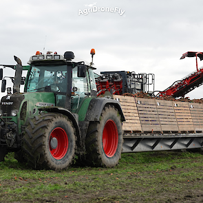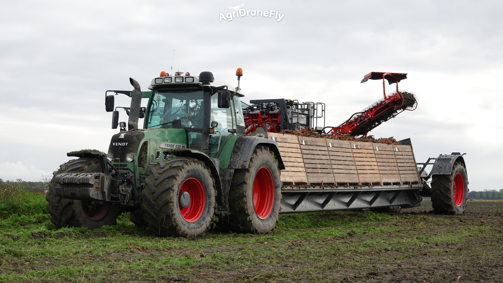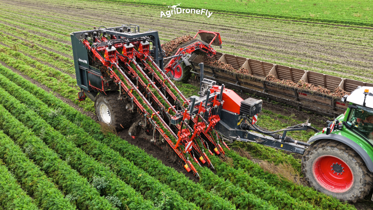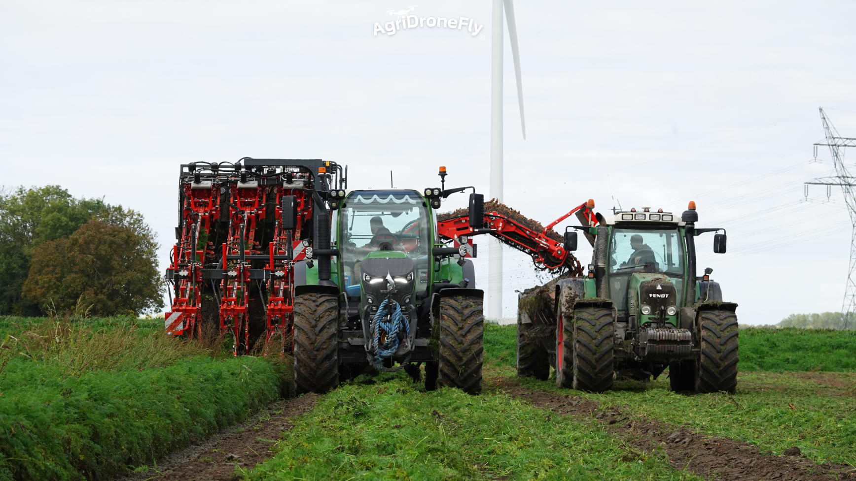 Blitterswijk Agro aan het wortels rooien met hun Fendt 620 Vario met nieuwe 3-rijige Dewulf GK3-klembandrooier. De wortels worden door een Claas Arion 640, Fendt 820 Vario en Fendt 516 Vario naar het erf gereden, met erachter een kantel kistenwagen van Ruijter Machines die zes kisten kan meenemen.