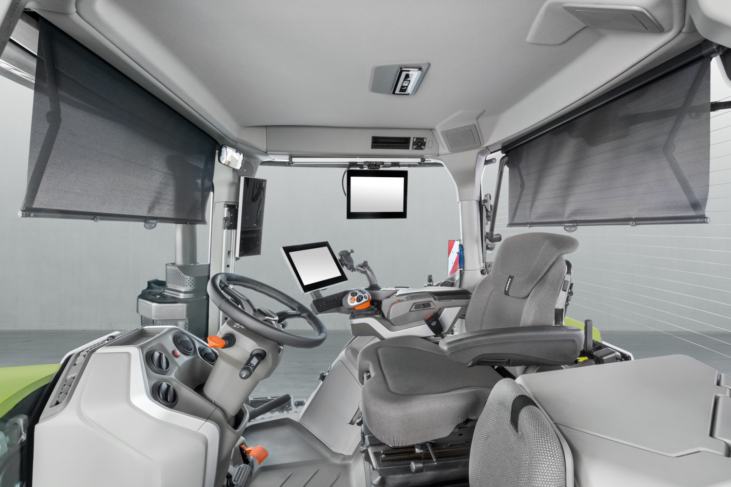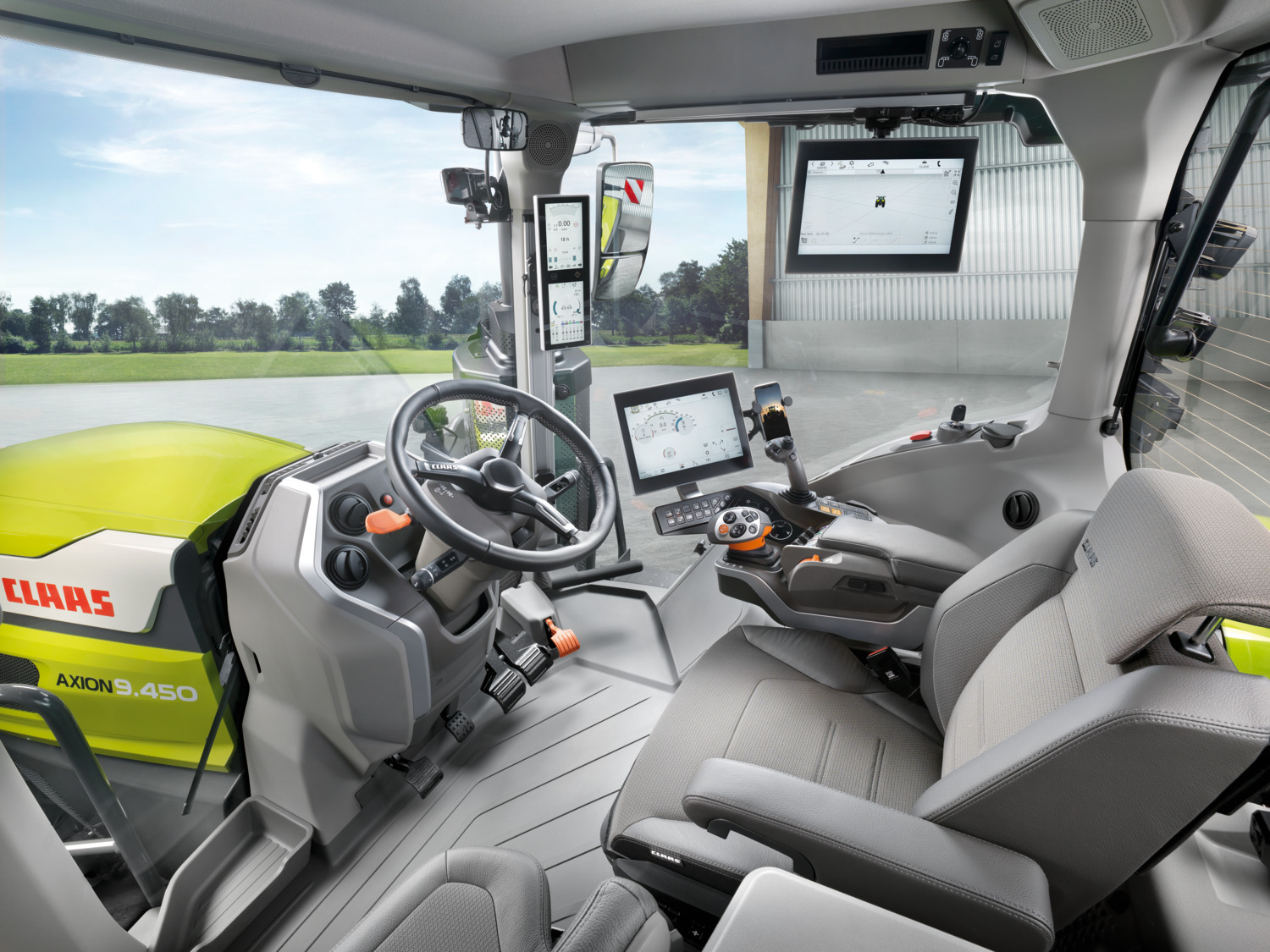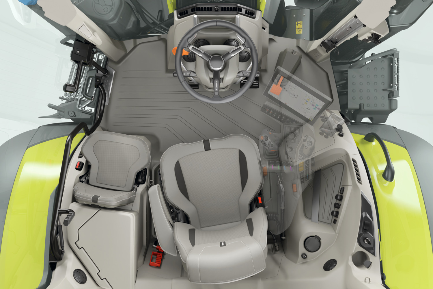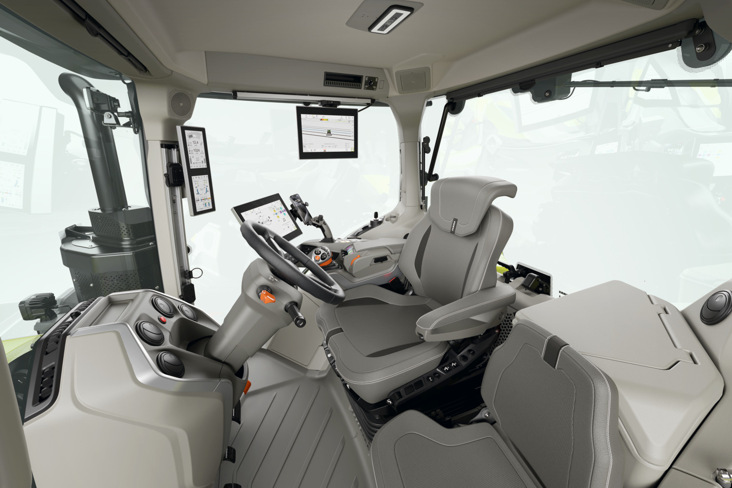 Drie kubieke meter ruimtevolume, comfortabel geluidsniveau (tot 66 db (A)), een brede instap met licht sluitende deuren, talrijke opbergmogelijkheden en een 50 graden naar rechts zwenkbare stoel – optioneel met massagefunctie – kenmerken de volledig nieuw ontwikkelde cabine van de Axion 9.