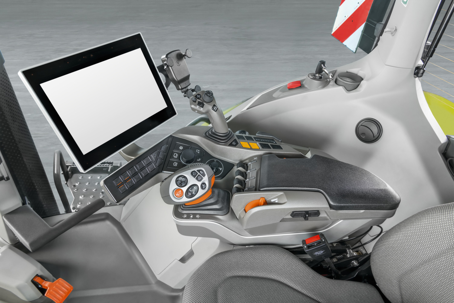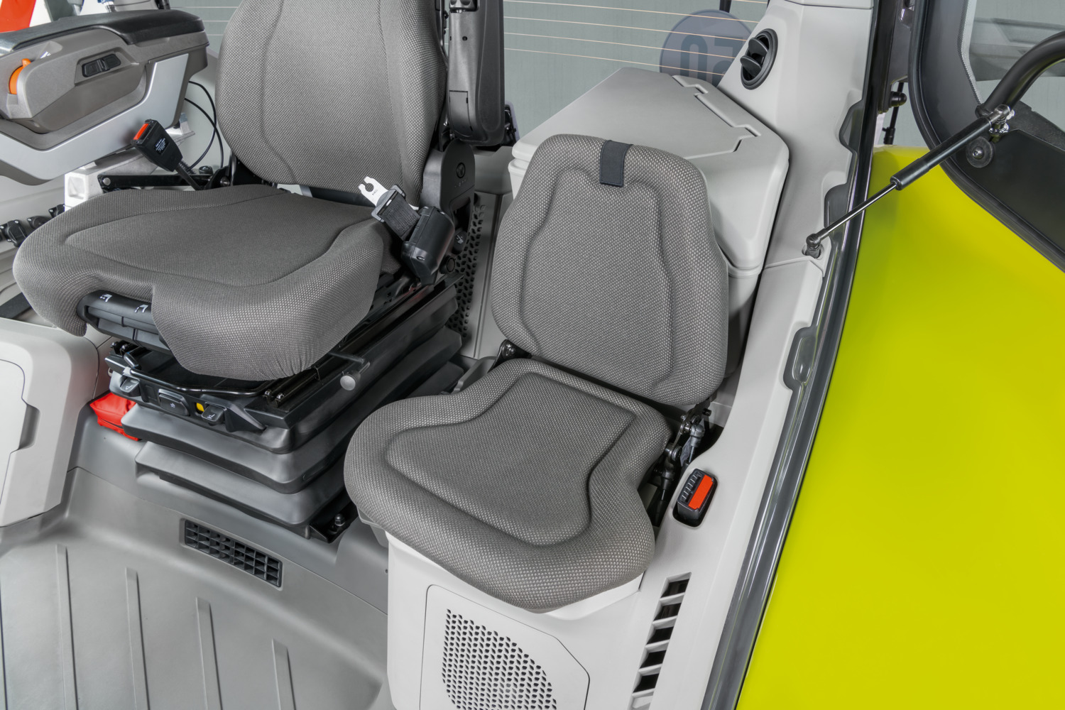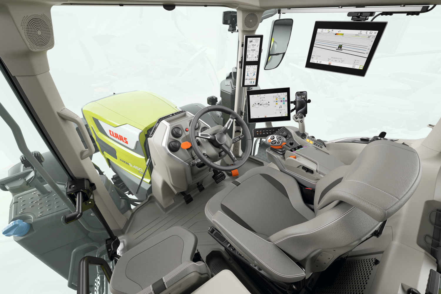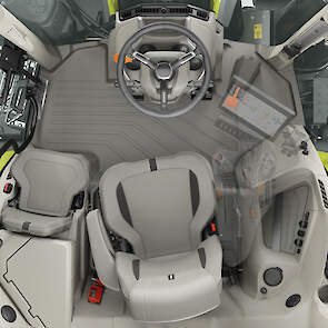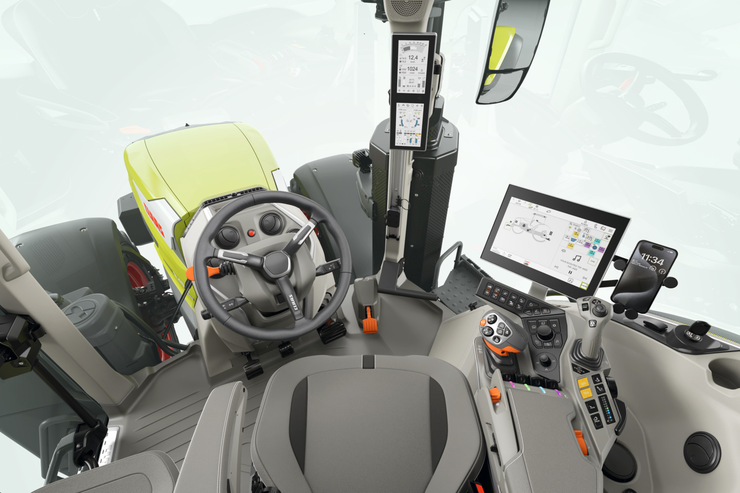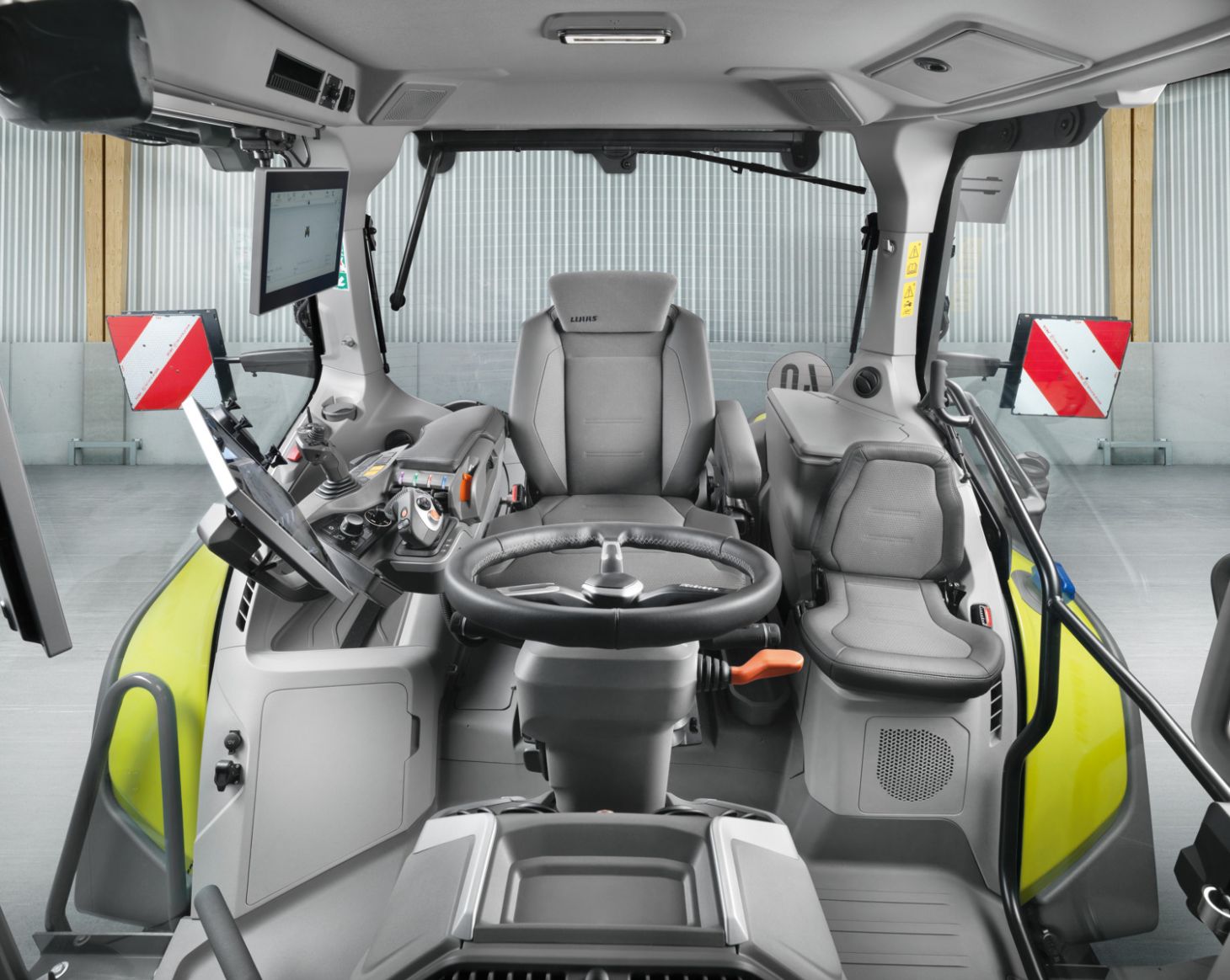 Drie kubieke meter ruimtevolume, comfortabel geluidsniveau (tot 66 db (A)), een brede instap met licht sluitende deuren, talrijke opbergmogelijkheden en een 50 graden naar rechts zwenkbare stoel – optioneel met massagefunctie – kenmerken de volledig nieuw ontwikkelde cabine van de Axion 9.