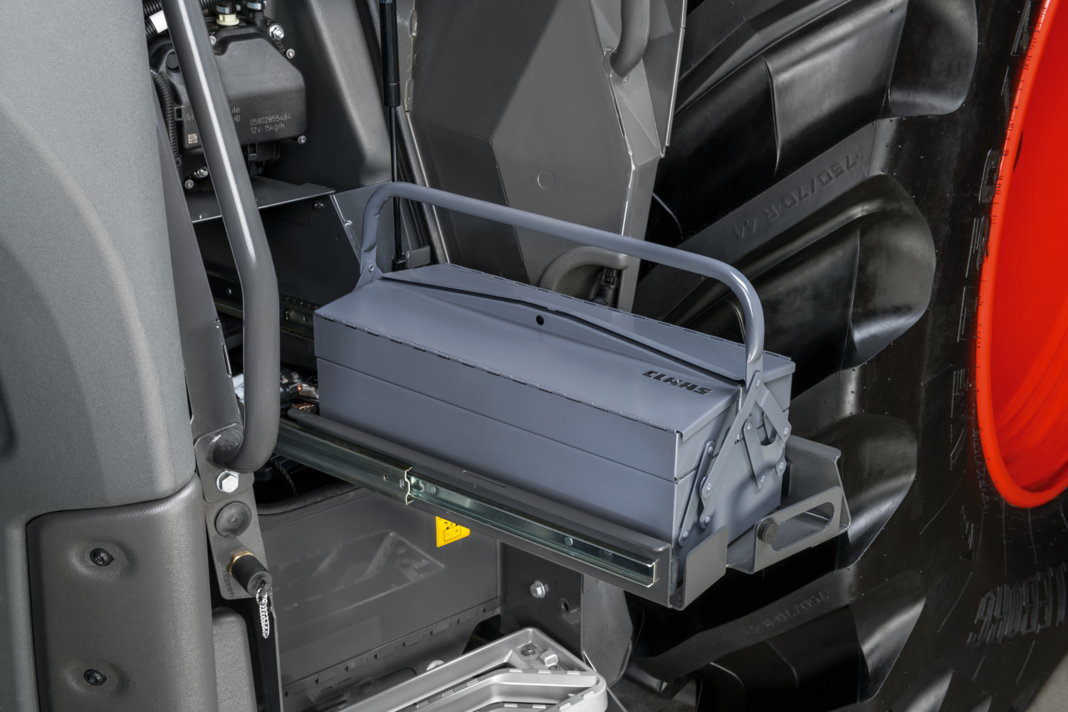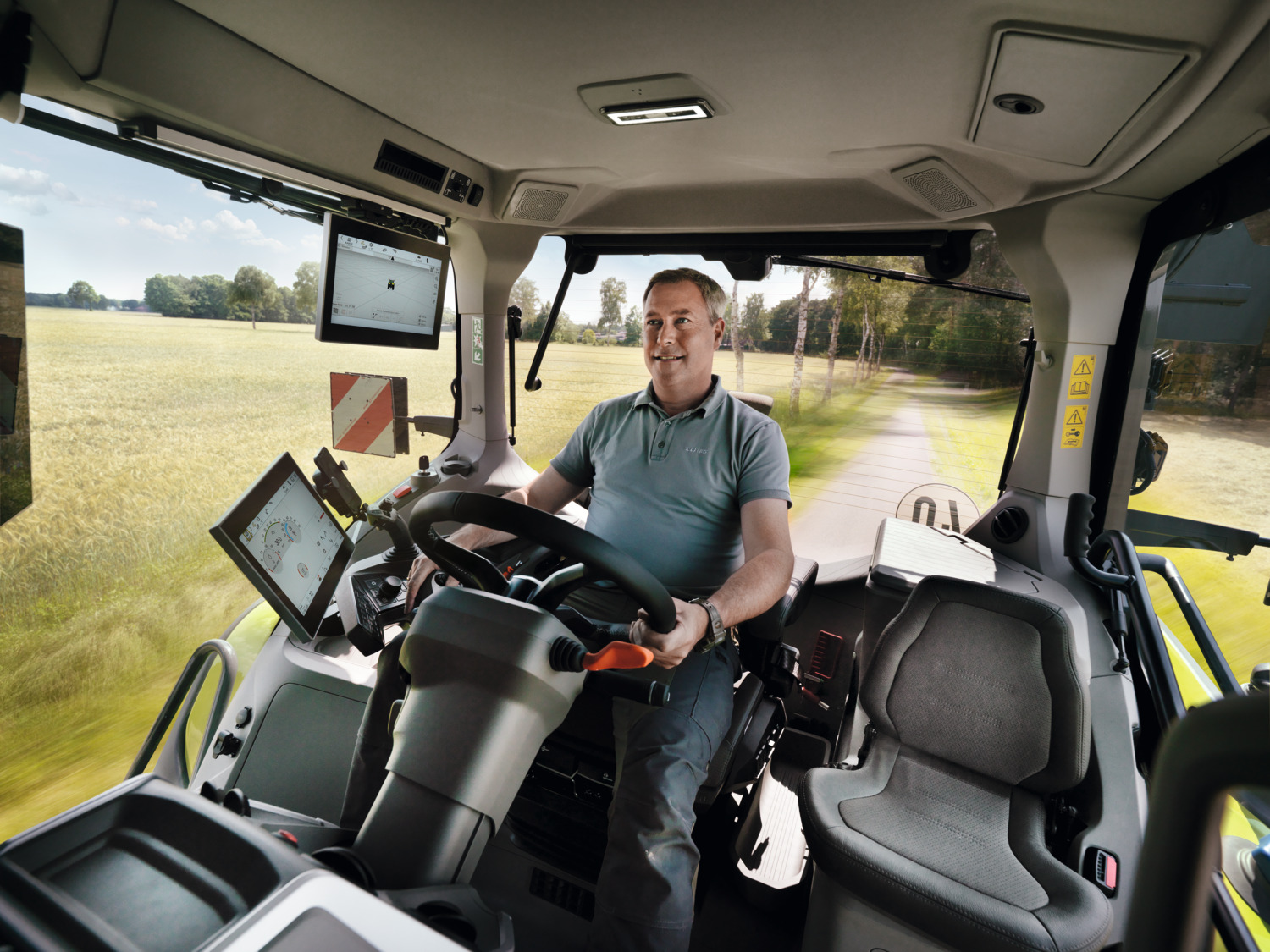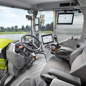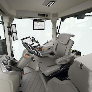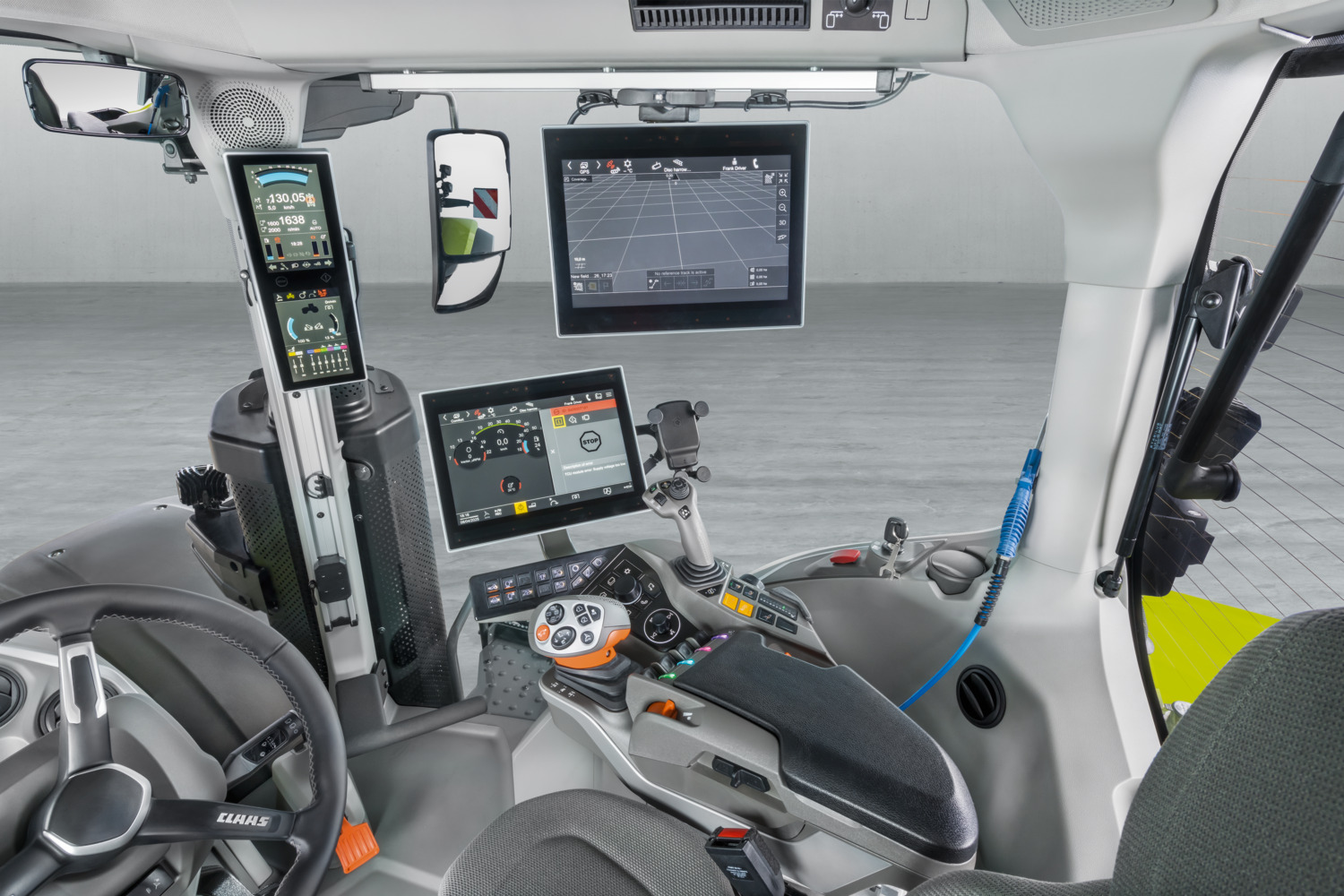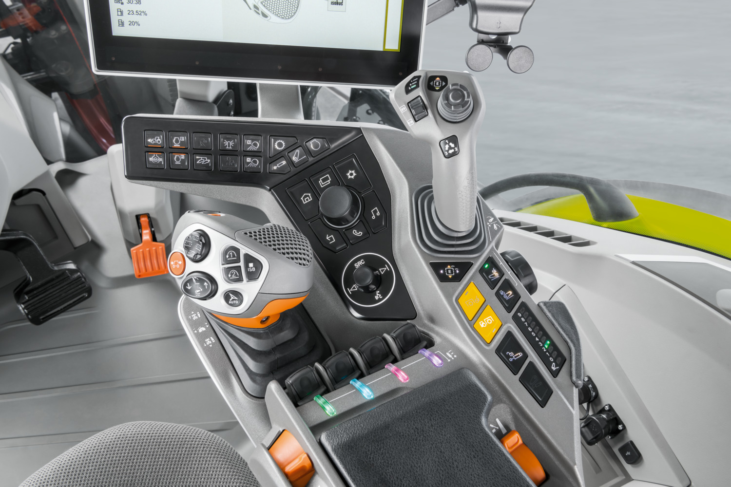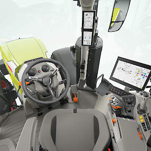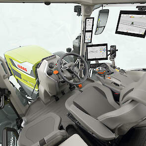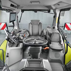 Drie kubieke meter ruimtevolume, comfortabel geluidsniveau (tot 66 db (A)), een brede instap met licht sluitende deuren, talrijke opbergmogelijkheden en een 50 graden naar rechts zwenkbare stoel – optioneel met massagefunctie – kenmerken de volledig nieuw ontwikkelde cabine van de Axion 9.