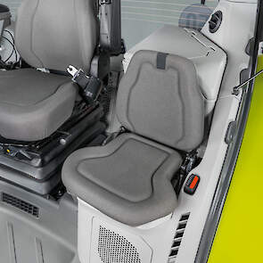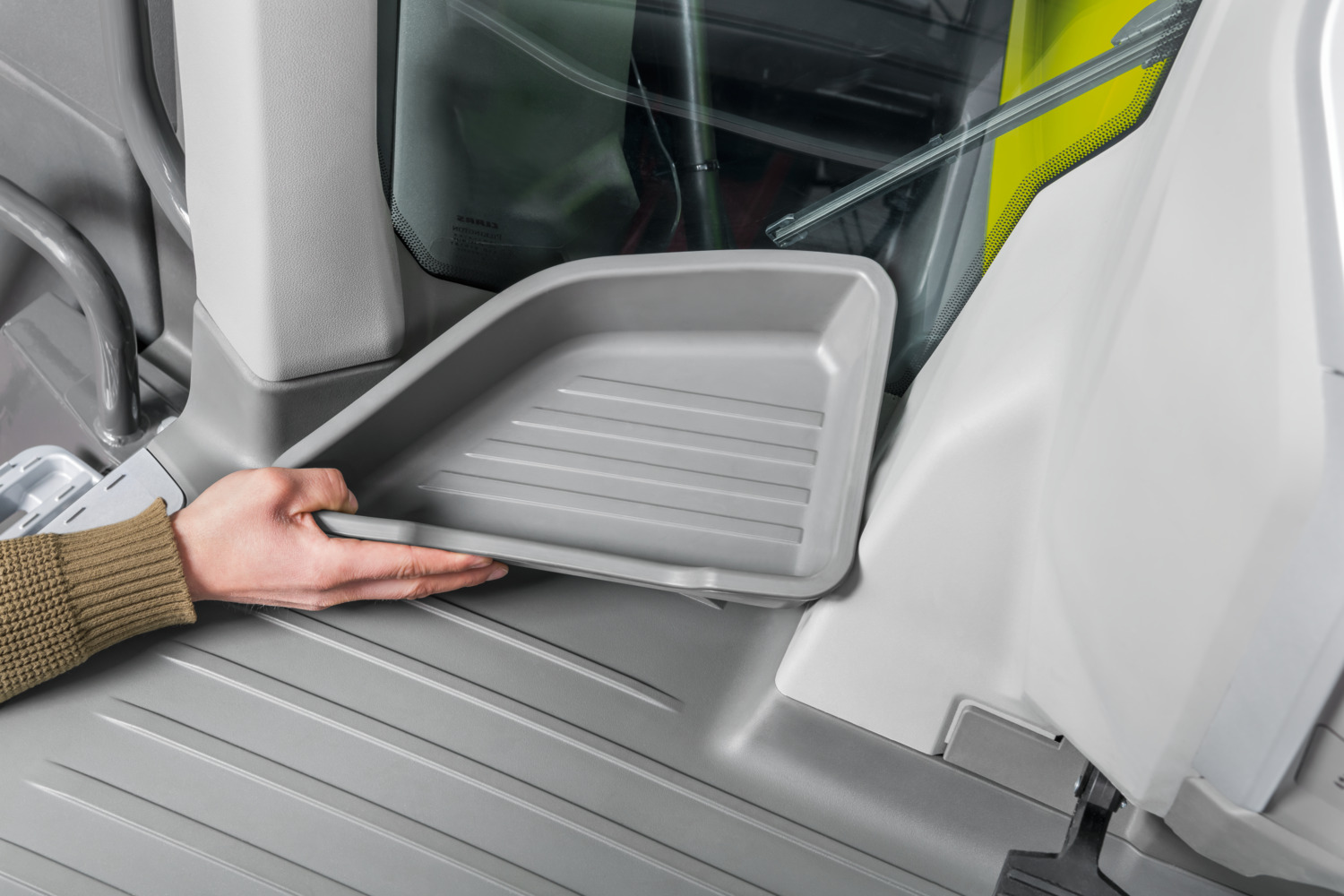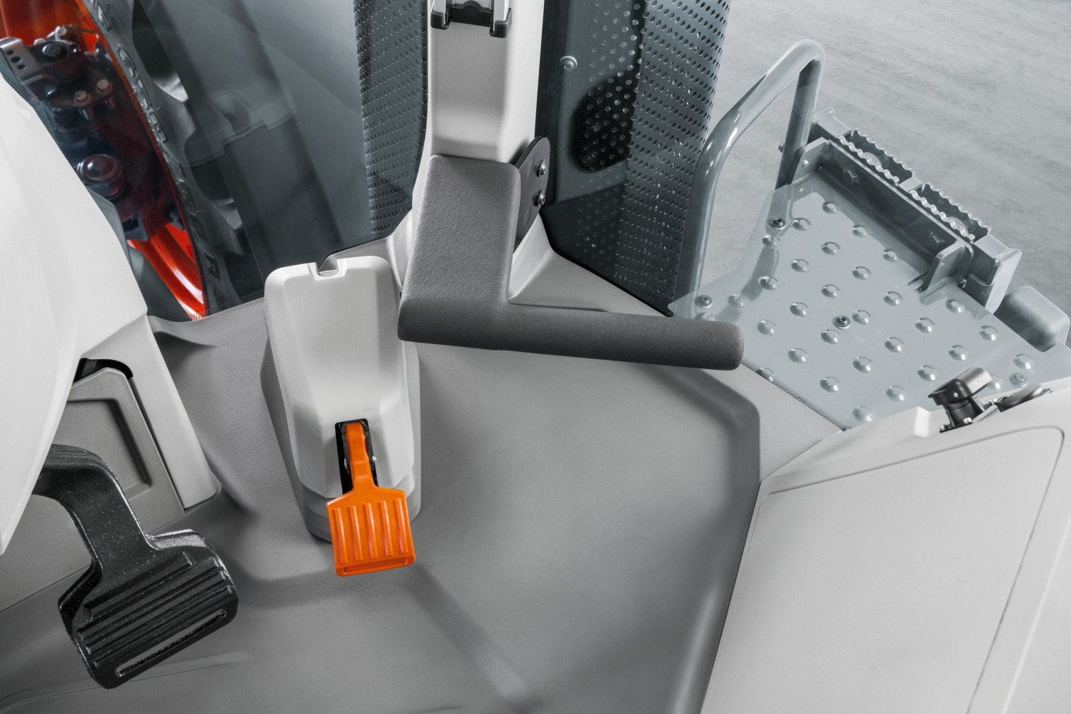 In de cabine heerst een behaaglijke sfeer dankzij de zorgvuldig gekozen materialen en hoogwaardige oppervlakken. Premium bestuurdersstoelen – optioneel met stoelventilatie, stoelverwarming en massagefunctie – laten zelfs lange werkdagen in een oogwenk voorbijgaan. Dankzij de grote draaihoek van maximaal 40 graden naar rechts (en 10 graden naar links, om het in- en uitstappen nog gemakkelijker te maken) kunt u uw werktuigen in de gaten houden zonder dat u zich in bochten hoeft te wringen, terwijl u uw benen volledig gestrekt en comfortabel op nieuwe voetsteunen aan de rechter A-stijl kunt laten rusten.