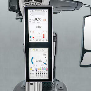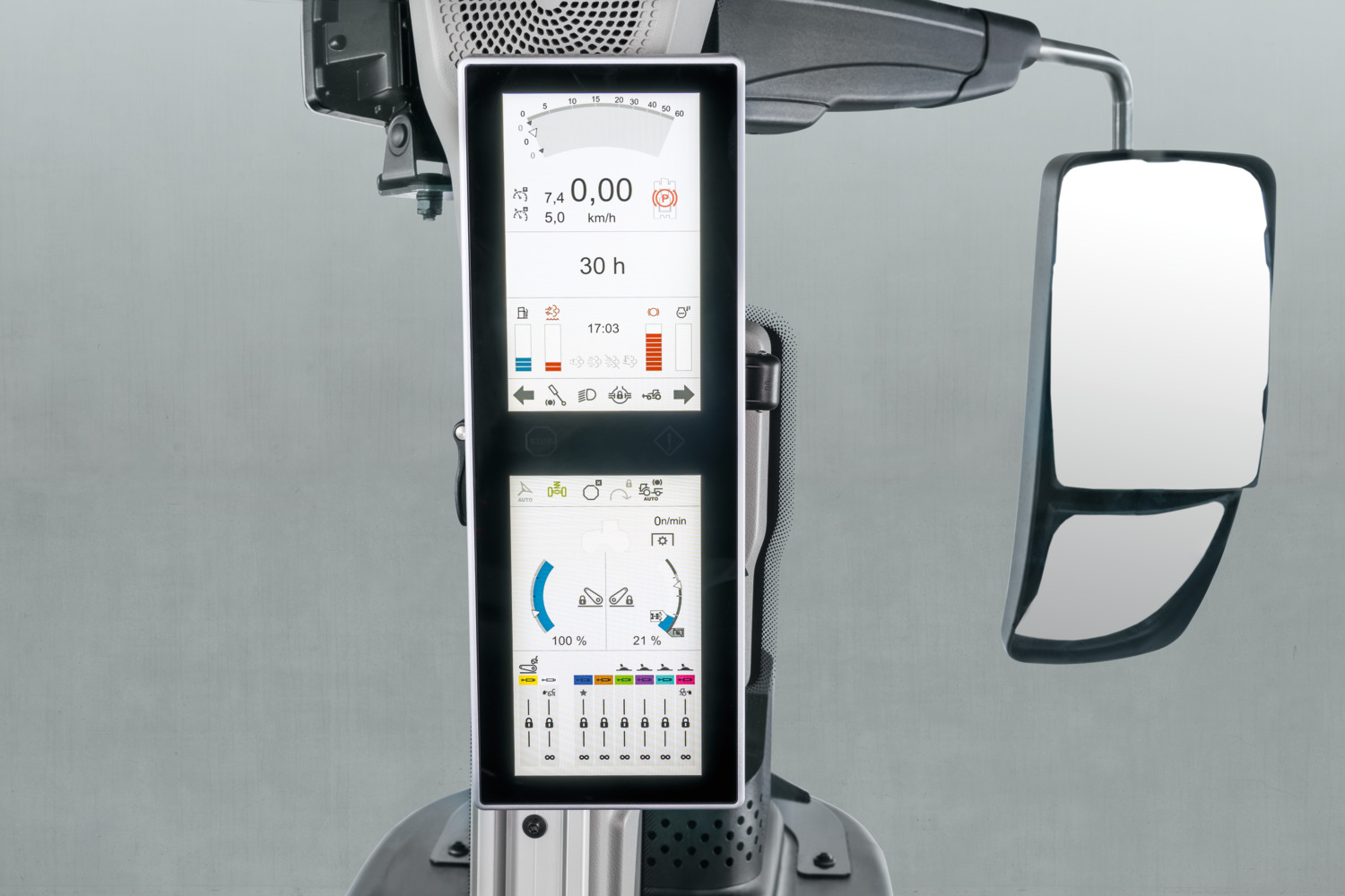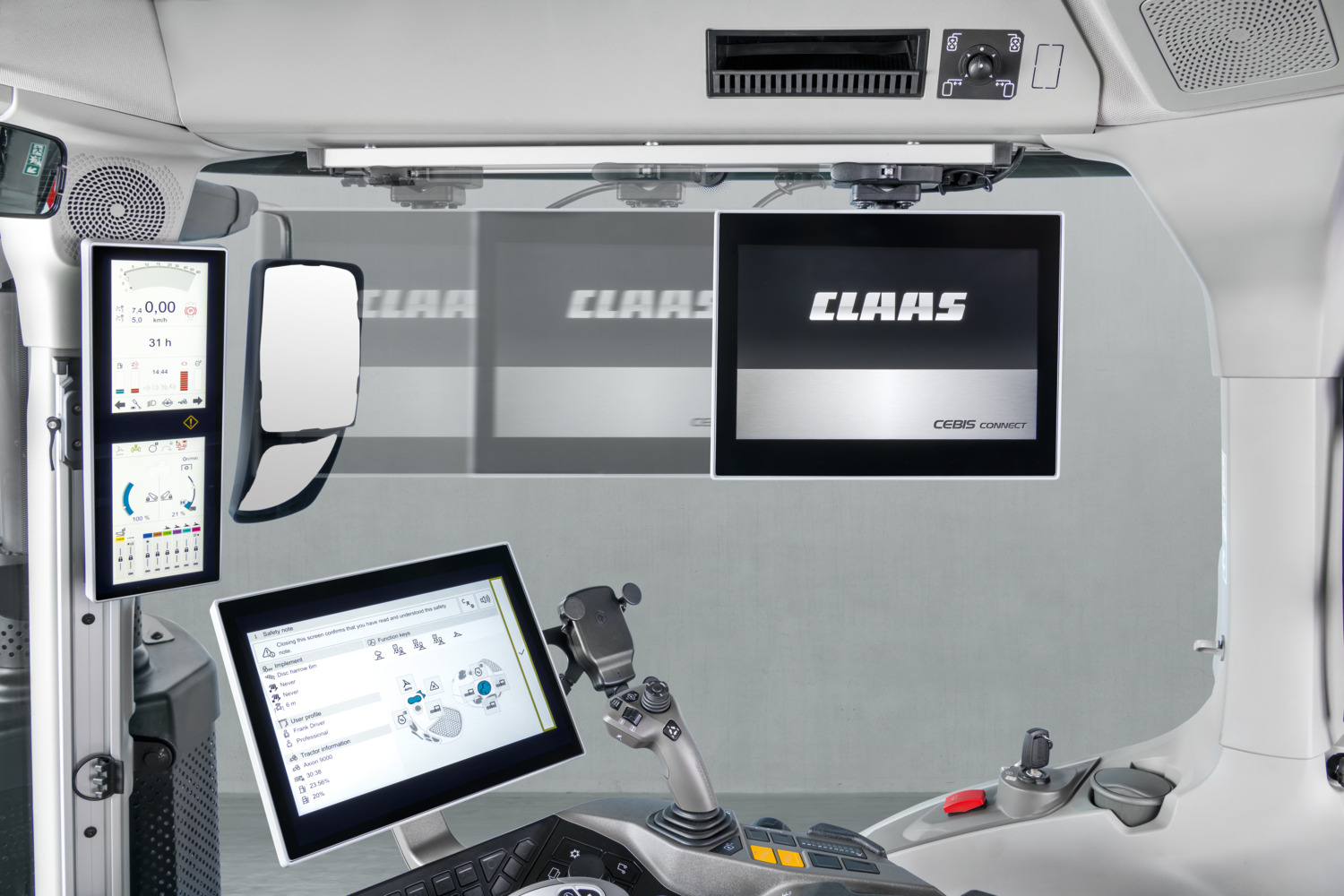 Op een extra, in hoogte verstelbare terminal in de rechter A-stijl worden machineparameters zoals snelheid, verbruik, aftakassen en de hydraulische regelkringen weergegeven. Cebis Connect kan zo – met één of twee displays – volledig worden gebruikt voor het werkproces met aanbouwapparatuur, voor geautomatiseerd sturen, Isobus-toepassingen of geactiveerde werkopdrachten met en zonder precisielandbouw, zoals het uitrijden volgens applicatiekaarten en voor documentatie.
