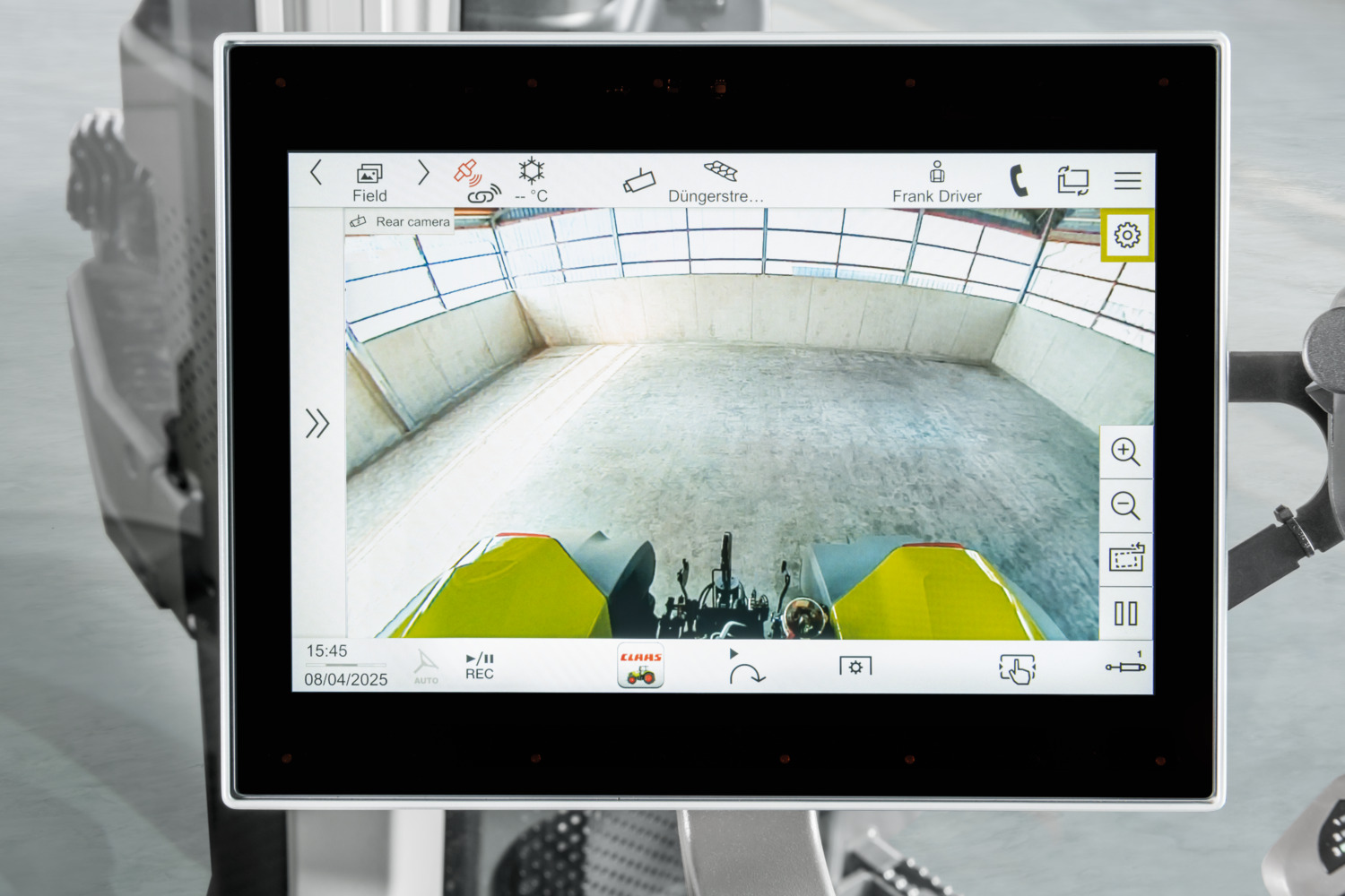 Met drie hoge resolutie camera's kunt u de omgeving en de ruimte achter en voor de machine optimaal overzien. De camera's kunnen eenvoudig met een vingerbeweging worden gedraaid en in- en uitgezoomd.