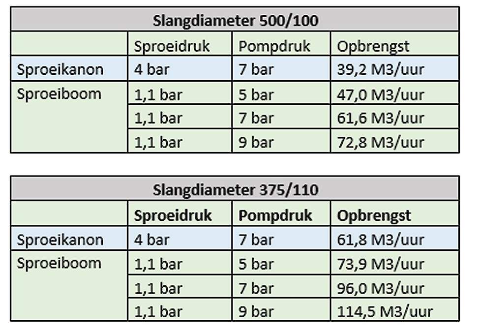 De tabel laat ook zien dat de slangdiameter en -lengte een directe invloed hebben op de opbrengst: een grotere diameter en kortere slang zorgen voor een lagere weerstand en dus meer doorstroming. In combinatie met de lage werkdruk van de sproeiboom kan zo een maximaal rendement worden gehaald uit de beschikbare pompdruk.