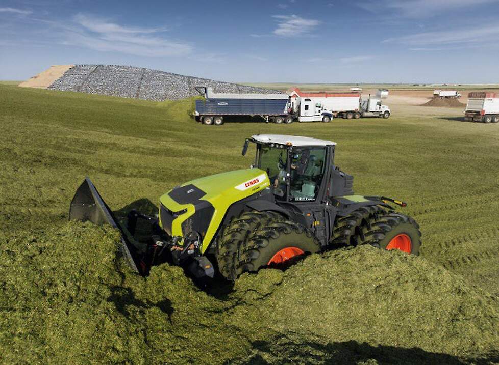 Silo: Claas Xerion 12.590 Trac met 18 voet (5,5 m) brede Grouser-siloschild.