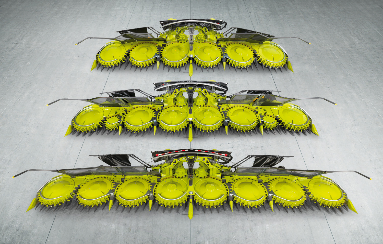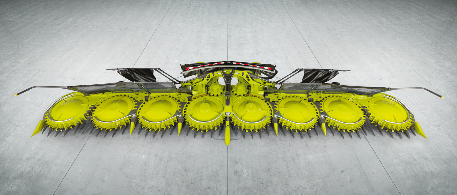 Met acht messen- en transportschijven met identieke diameter kan de Orbis 12000 16 maïsrijen met een rijafstand van 75 cm verwerken. Voor transport over de weg klapt hij samen met de automatische transportbeveiliging in tot een compacte buitenbreedte van 3,30 m.