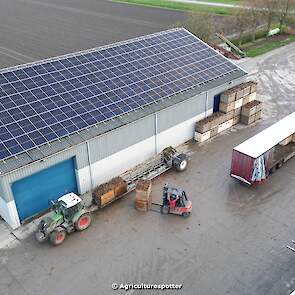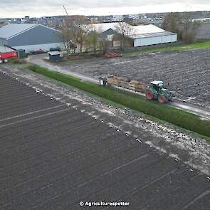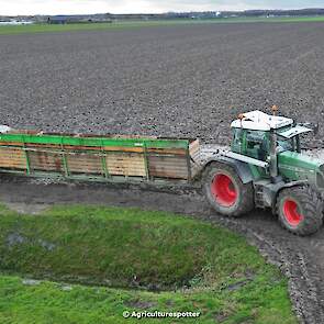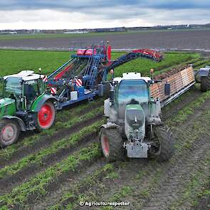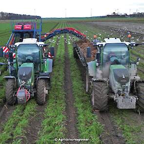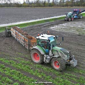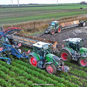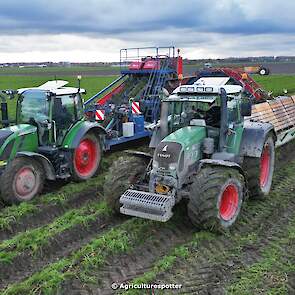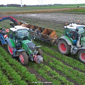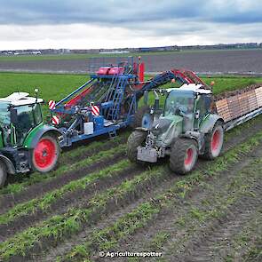 Wortels rooien met een Fendt 516 Vario met een getrokken 2-rijige Asa-Lift T-255-klembandrooier van Van Es V.O.F. Het transport werd gedaan met een Fendt 818 Vario en twee Fendts 516 Vario met kistenwagens.